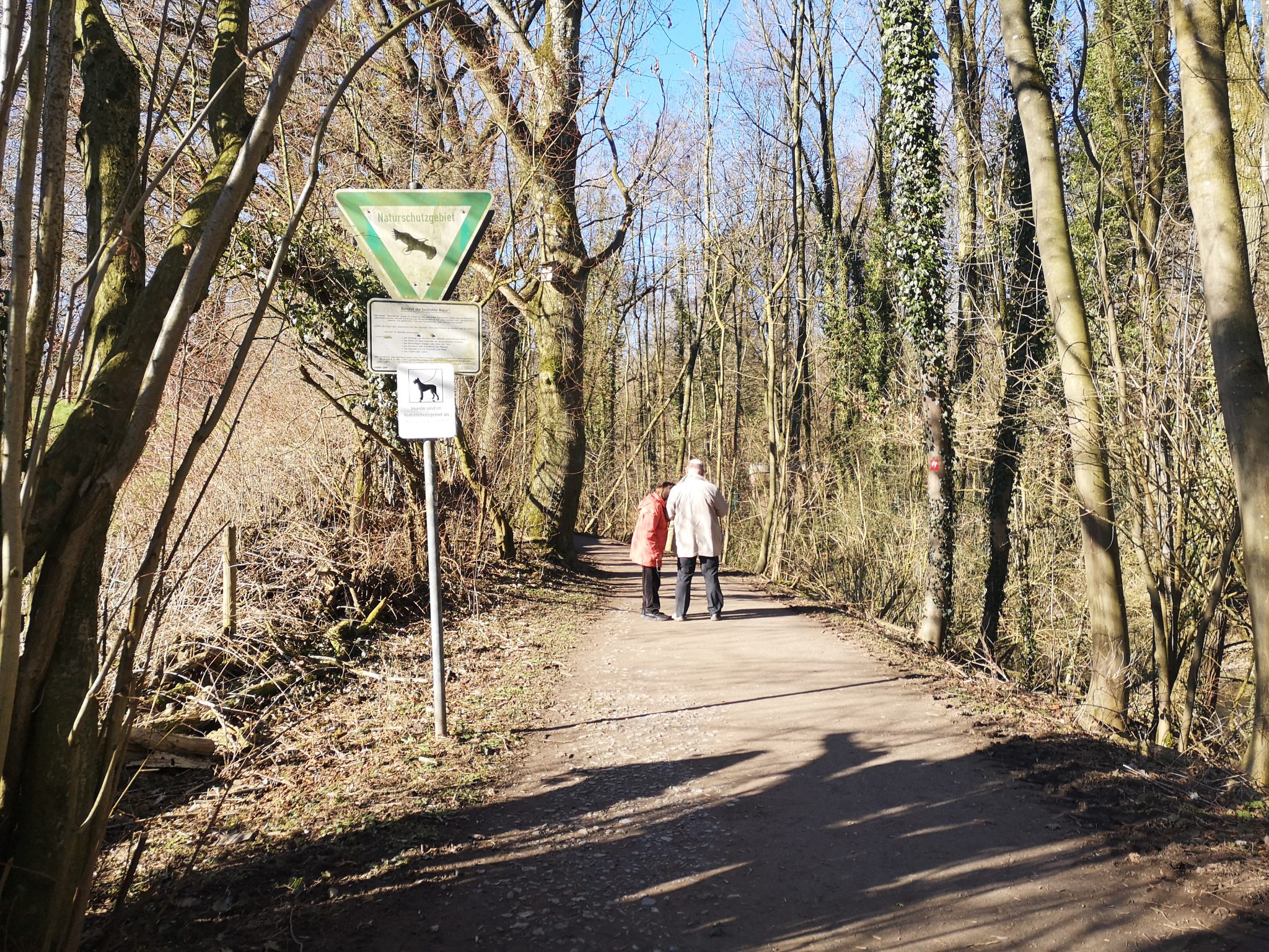 Kein Durchkommen – und das ist auch gut so. Schon ein Blick auf Google Maps hat es uns verraten: In der Nähe des Endpunktes der vorhergehenden (und somit Startpunkts der heutigen) Etappe, Stipps Teich, gibt es keine legalen Parkplätze. Also lieber das Naturschutzgebiet in Ruhe lassen, den Spieß umdrehen und da beginnen, wo wir höchstwahrscheinlich enden würden. Wer diesem Blog schon länger folgt, weiß Bescheid: Wir spazieren heute ausnahmsweise mit dem „Strom“ der Düssel am Ufer entlang – und nicht gegen ihn. Wer nicht sofort versteht, muss das hier lesen.