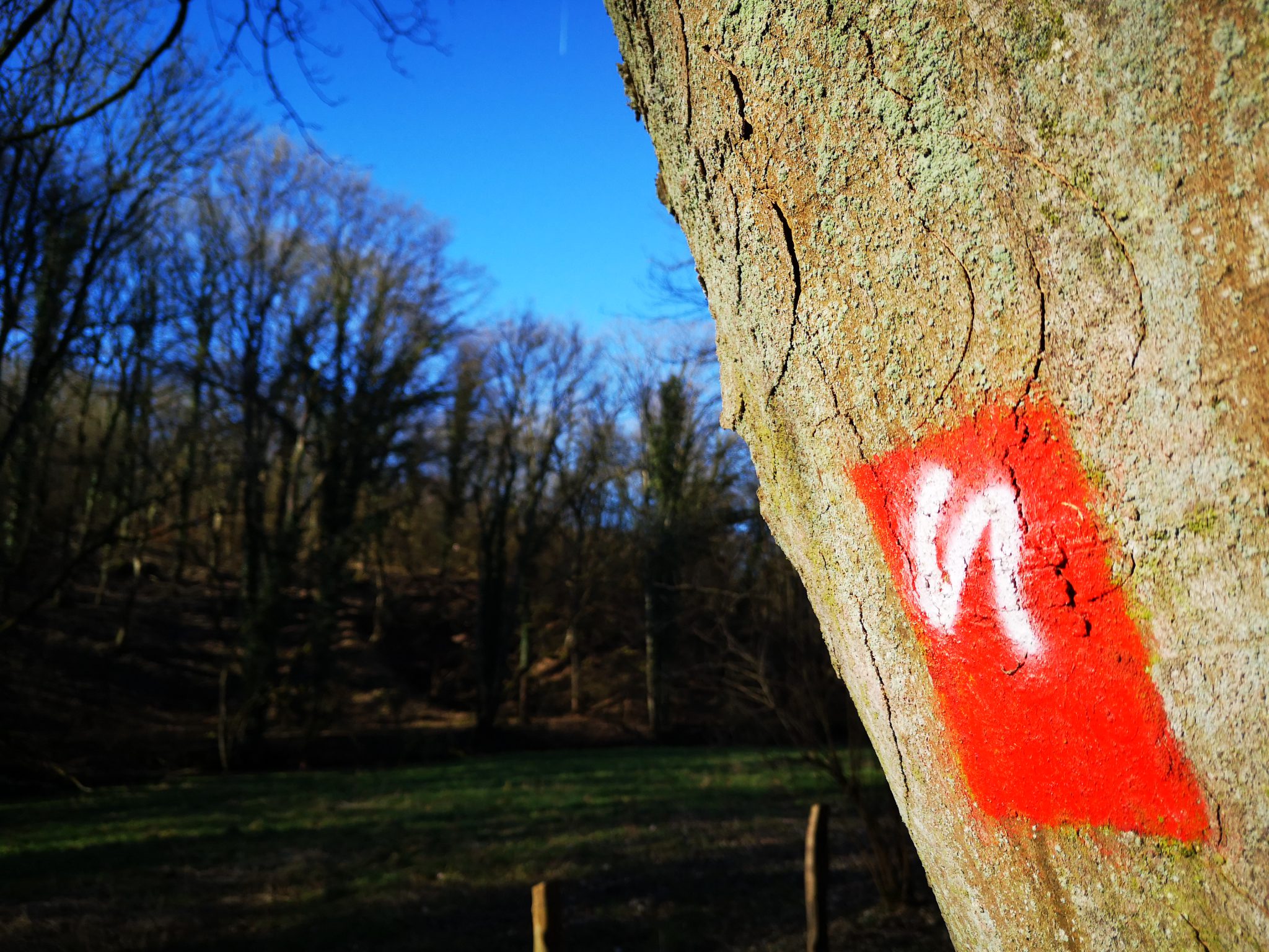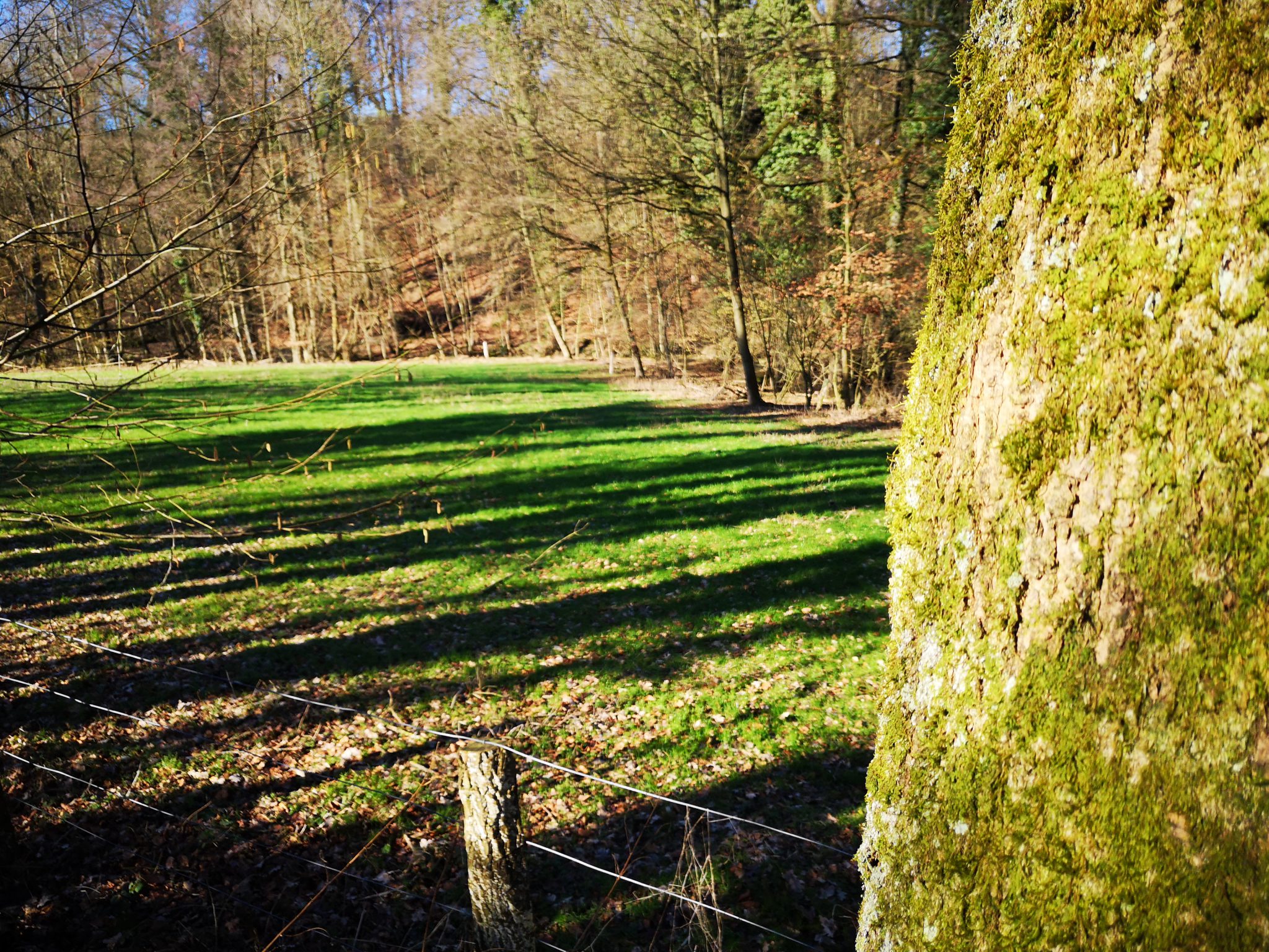 Vorbei an: Einer Streuobstwiese mit Streuobstwiese-Erklärschild. Und an einem Insektenhotel. Der Himmel so blau, die Vorfrühlingsbäume so kahl. Das alles efeugrün kontrastiert.