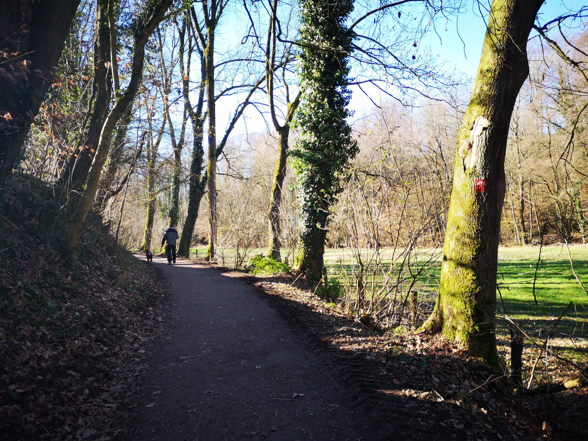 „Gut, dass wir uns nicht mit den ganzen Wanderwegnummern und Wanderwegnamen beschäftigen müssen“, sagt mein bester Freund P. „Einfach dem Fluss nach, das Leben kann so einfach sein.“ In diesem Fall führt am (flussabwärts gesehen) rechten Ufer der Düssel eine Art Wander- und Spazierweg entlang.