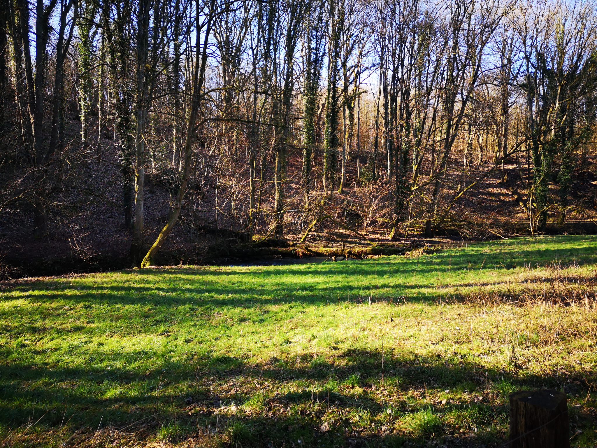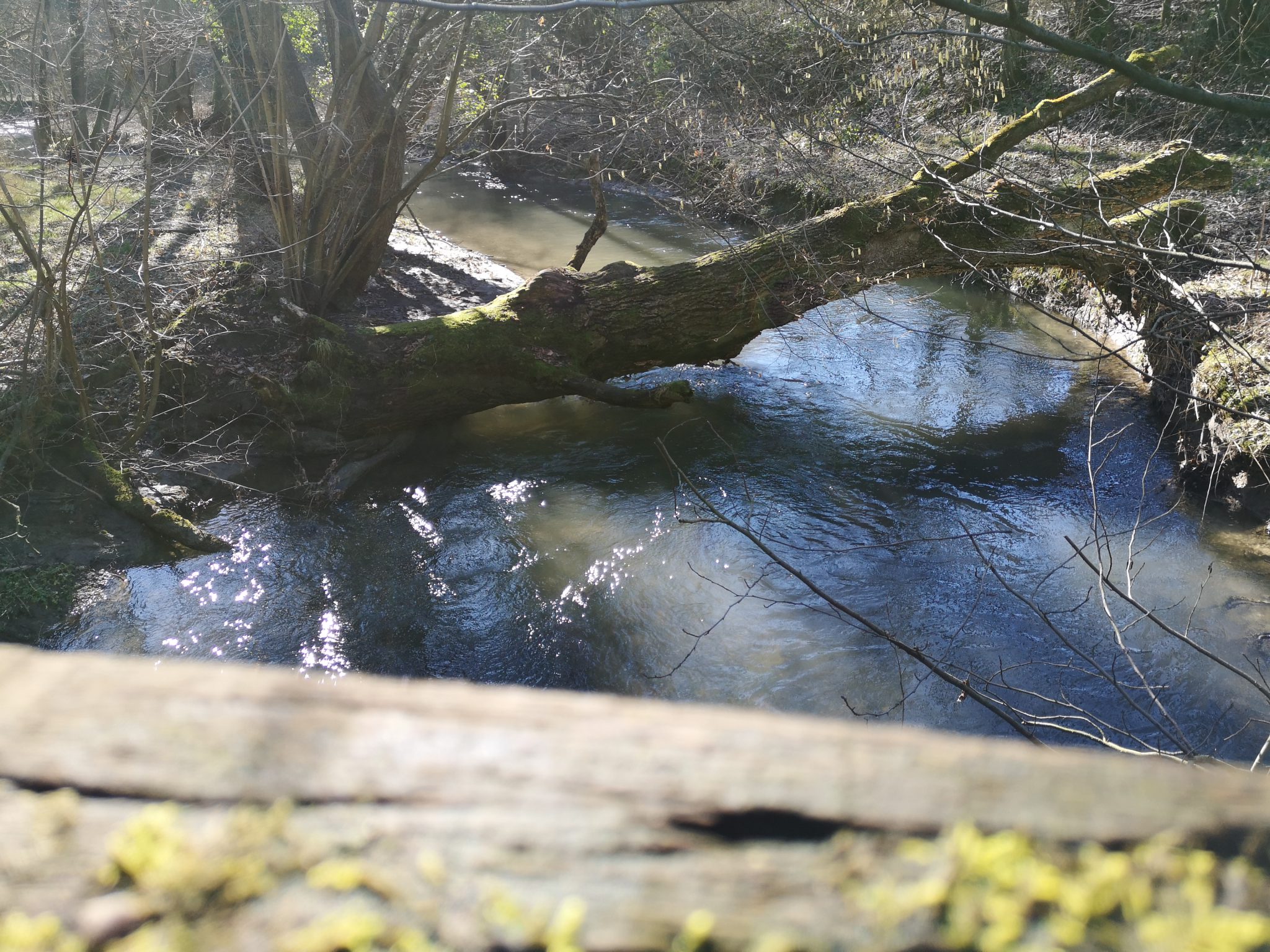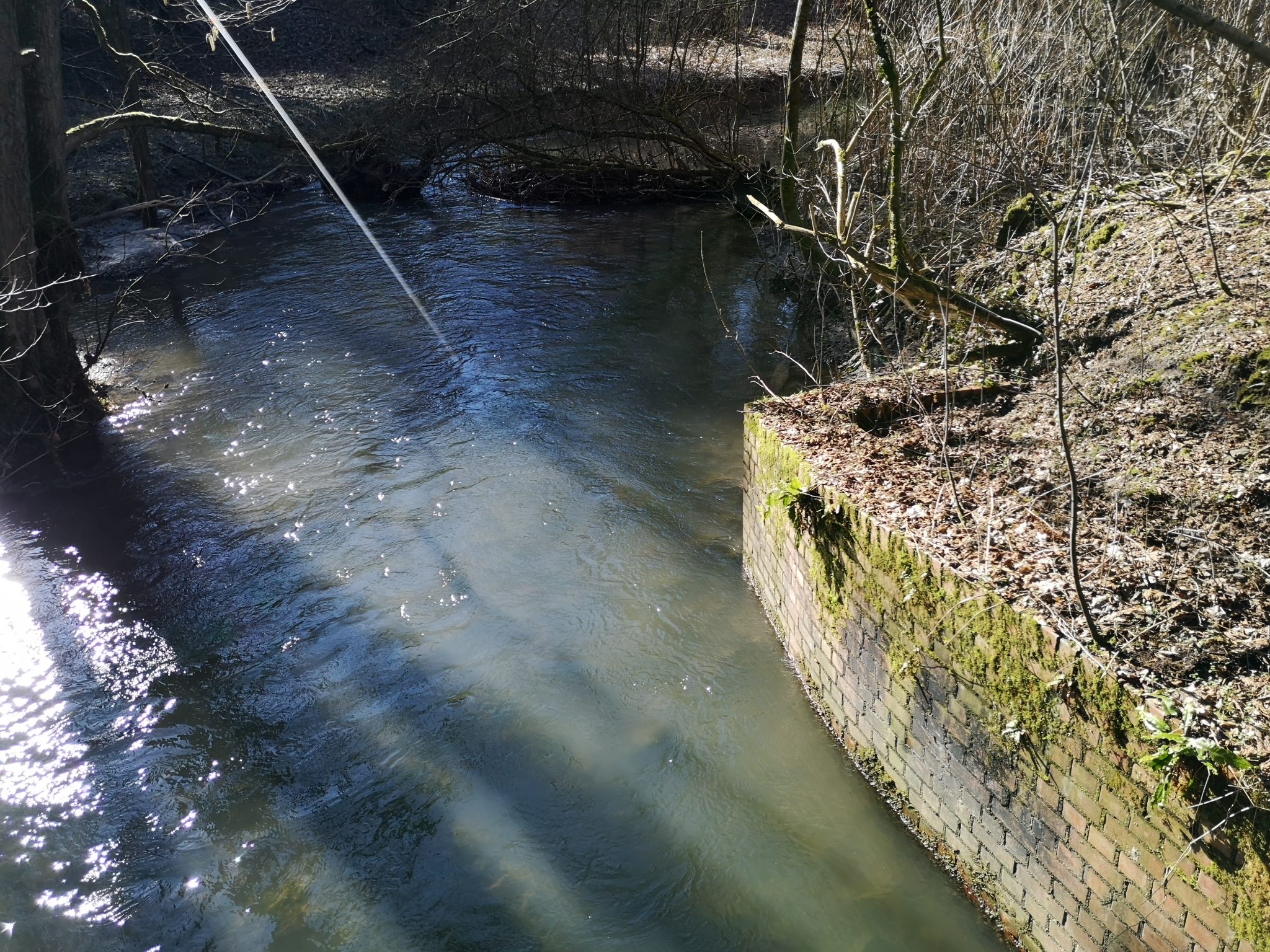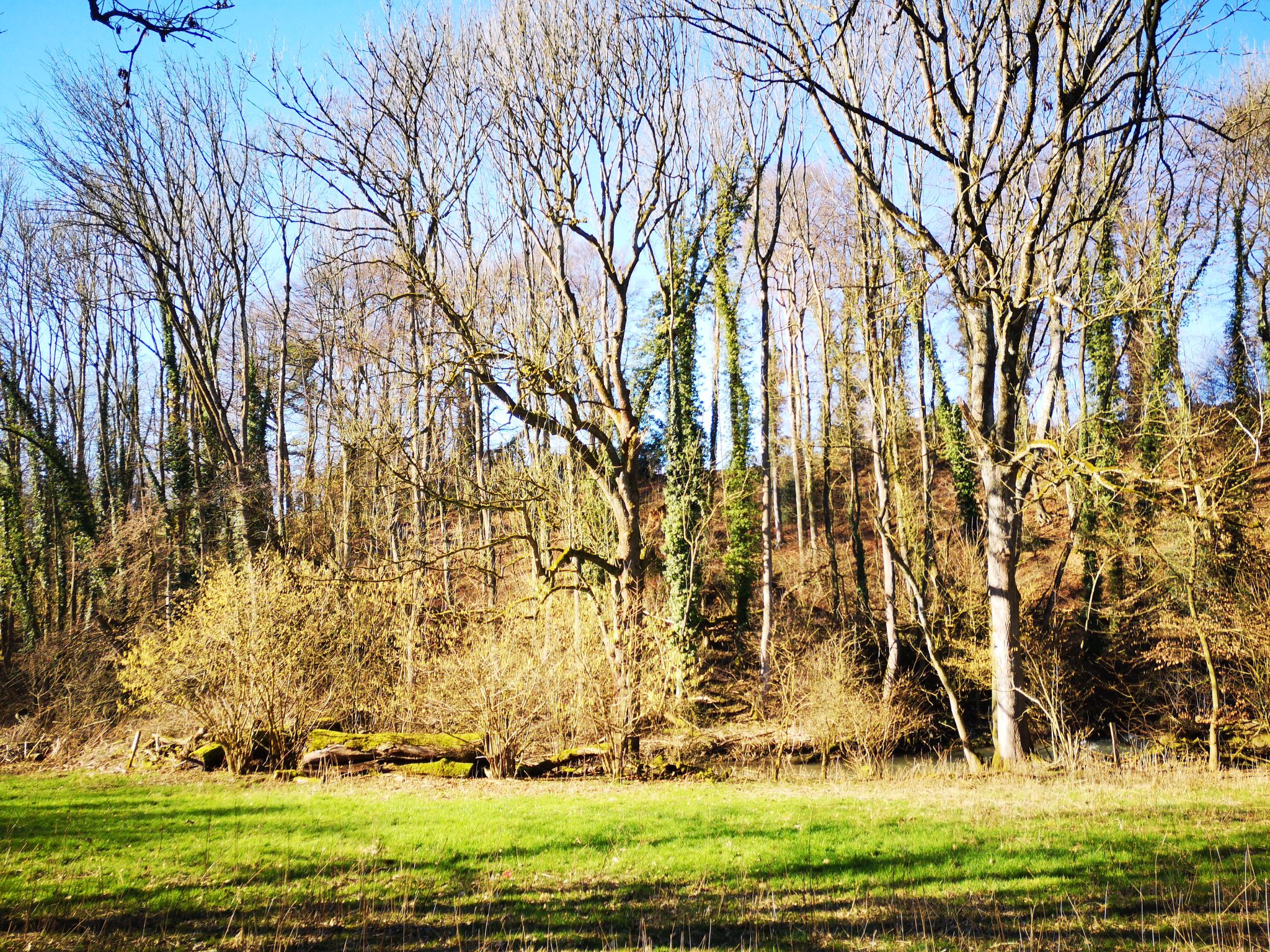 Und dann spazieren und schweigen und genießen wir. Mal fließt die Düssel direkt neben uns, mal verläuft sie hinter einer Wiese am Neandertalhang. In jedem Fall ist sie so schön und so klar, dass man am liebsten seine Füße in sie tauchen würde an diesem so sonnigen wie kaltem Spätwintertag.