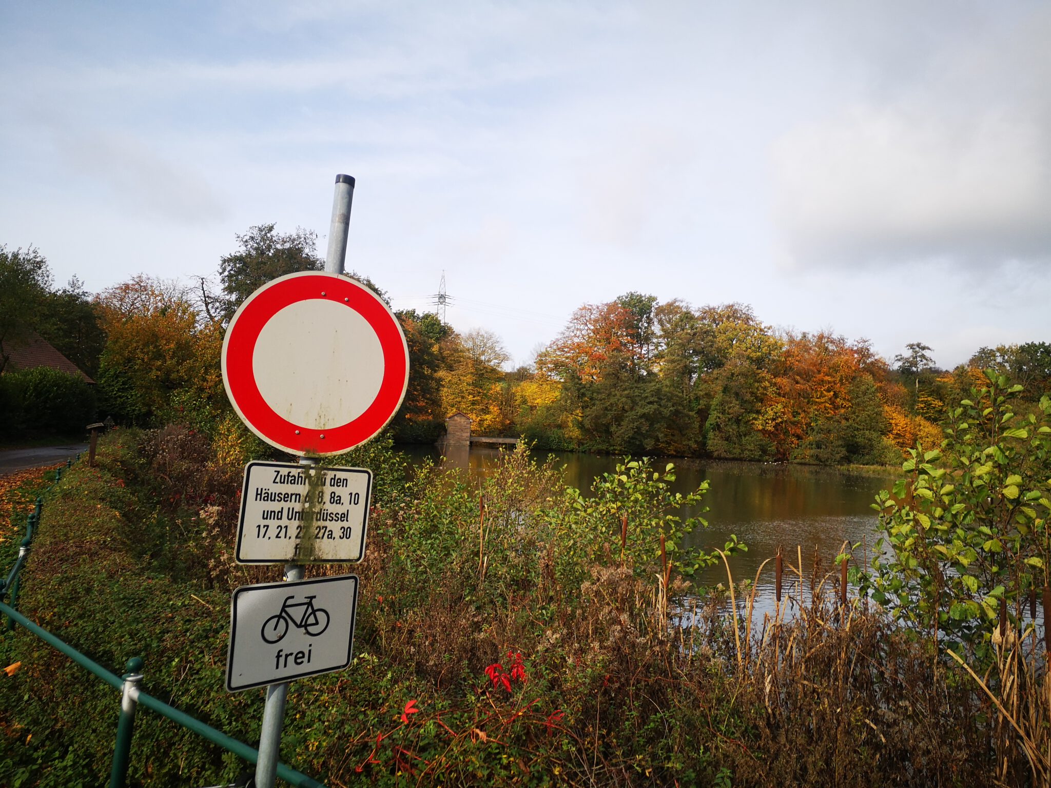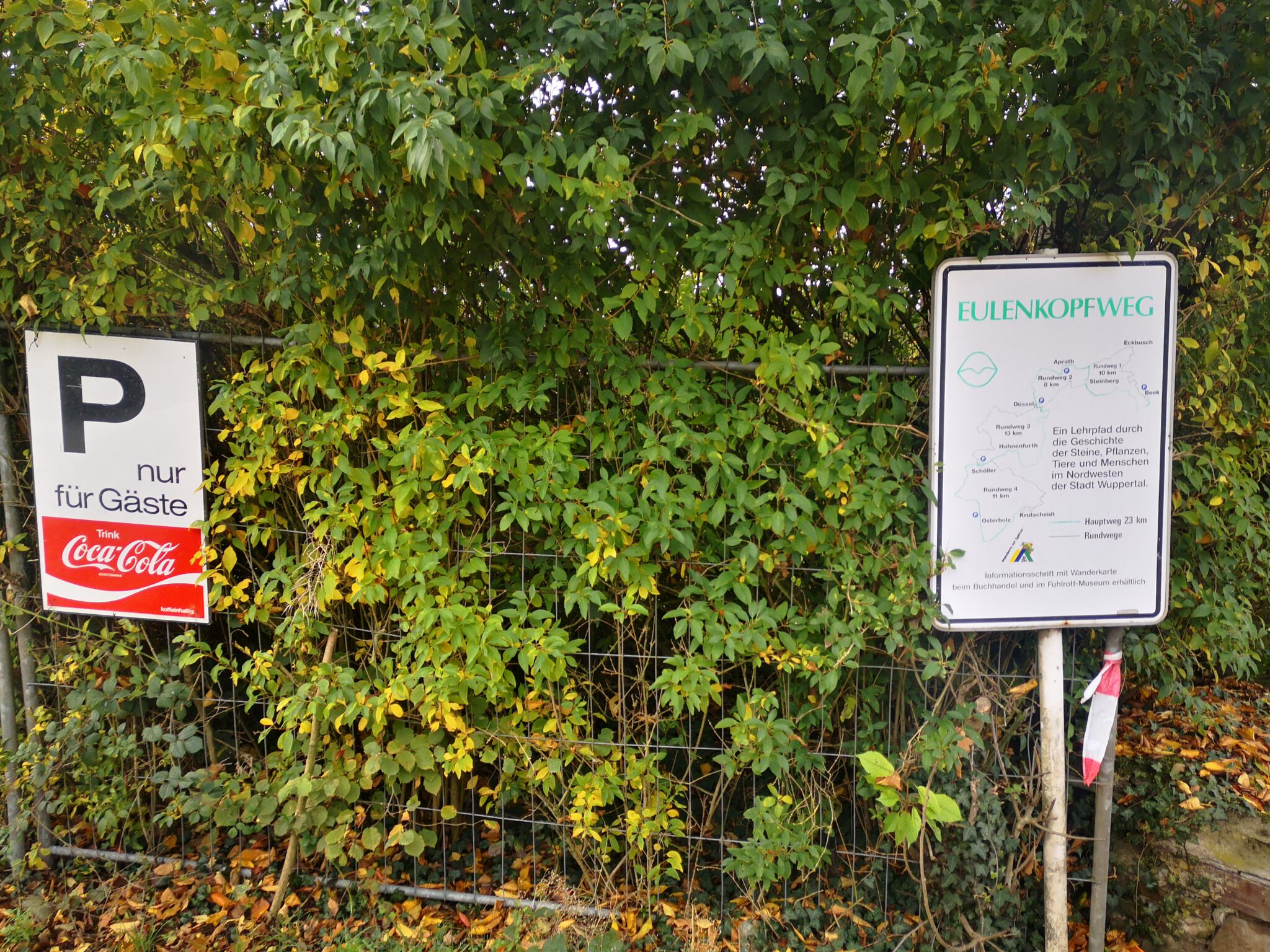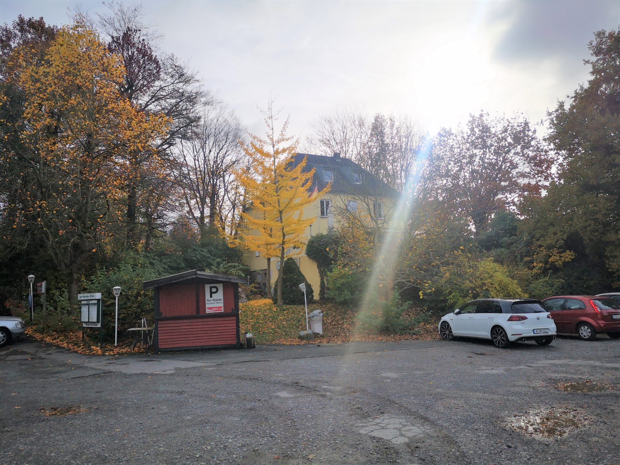 Das Auto auf dem Parkplatz vor der Gaststätte „Aprather Mühle“ abstellen. Einen Blick auf den an einem Wochentag im Herbst (natürlich) geschlossenem Außenkiosk des Lokals und ein Wanderweg-Info-Schild werfen. Und dann am Aprather Mühleteich entlang spazieren, dem Endpunkt unserer vorherigen Etappe.