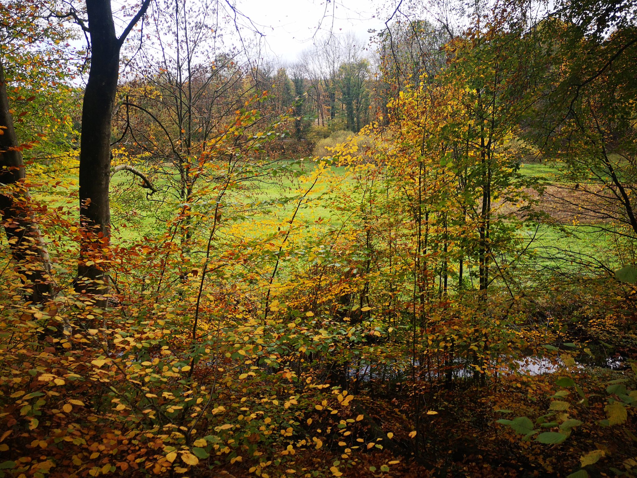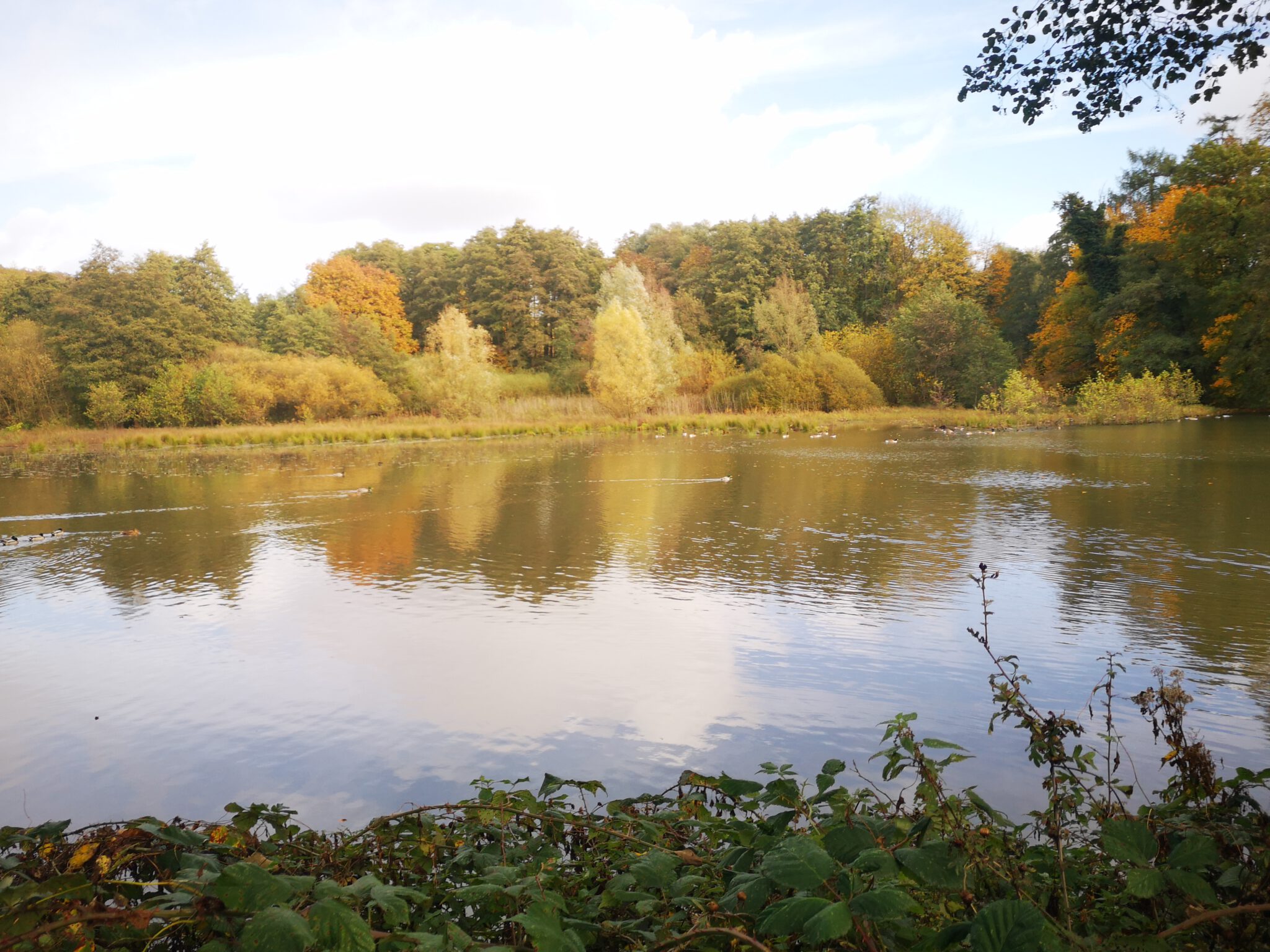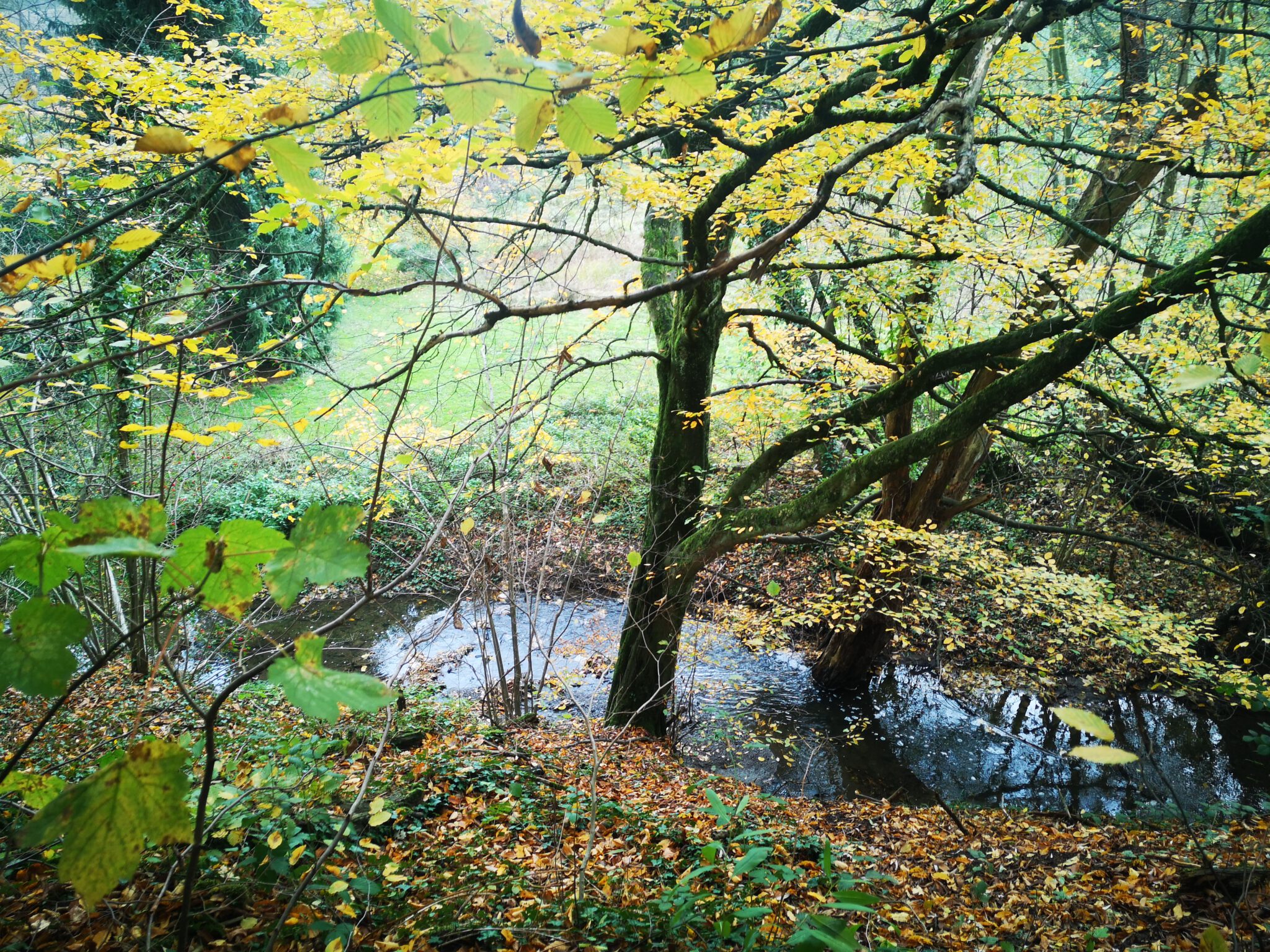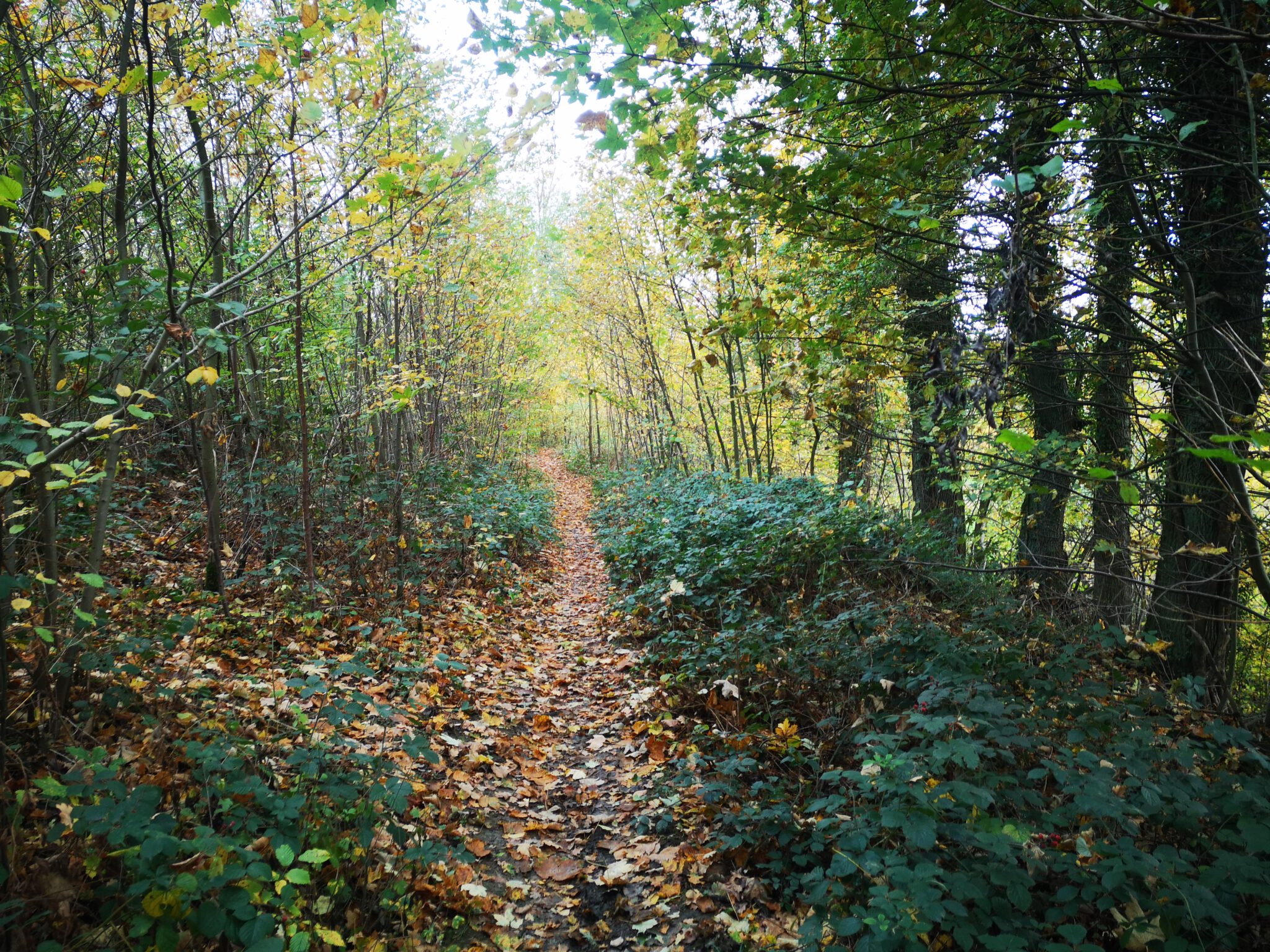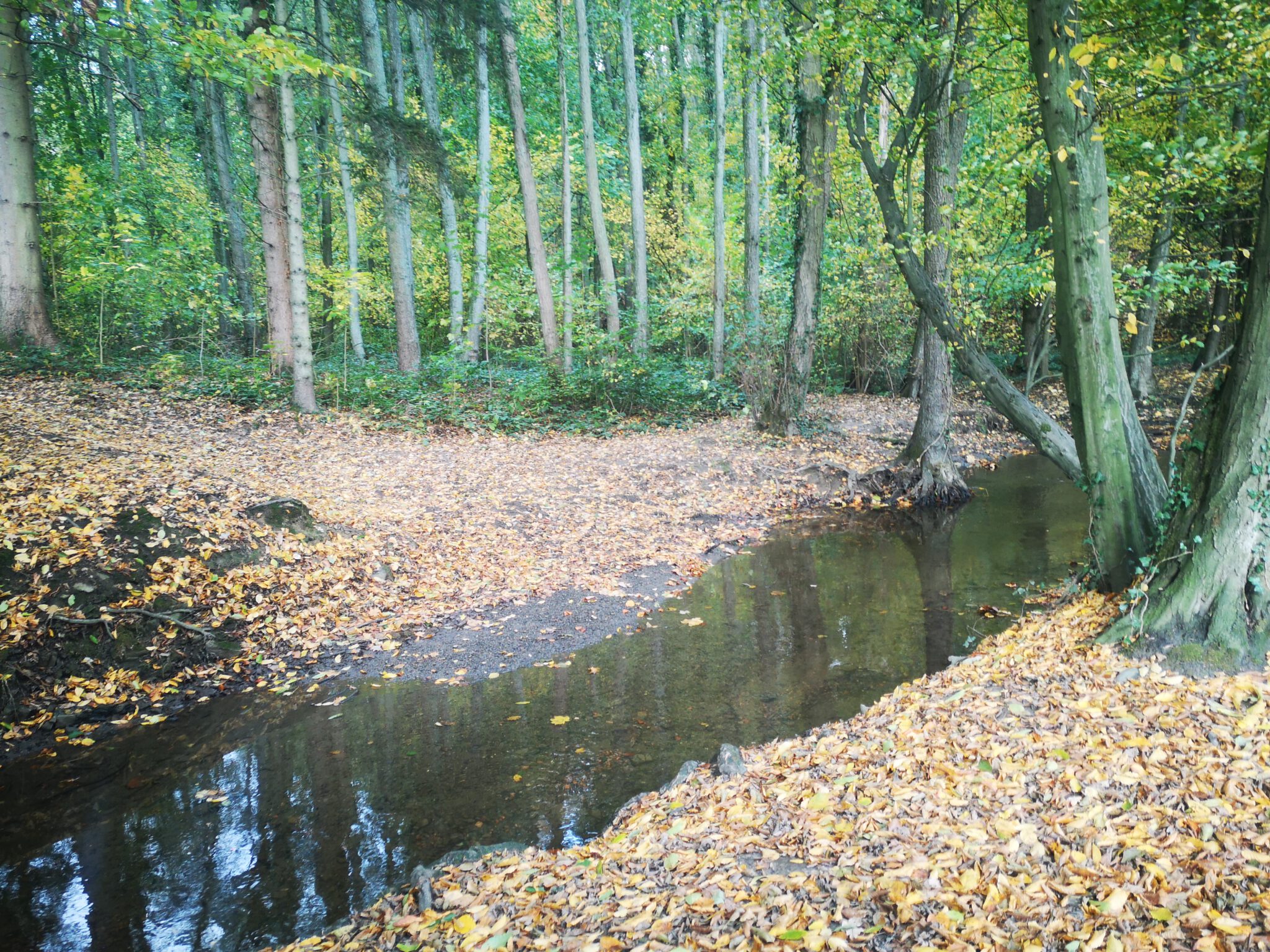 Und so geht es weiter. Links das Wasser, rechts das Naturschutzgebiet, leicht sumpfig, in der Mitte der Waldweg. Herbstdach für Düssel-Flaneure.