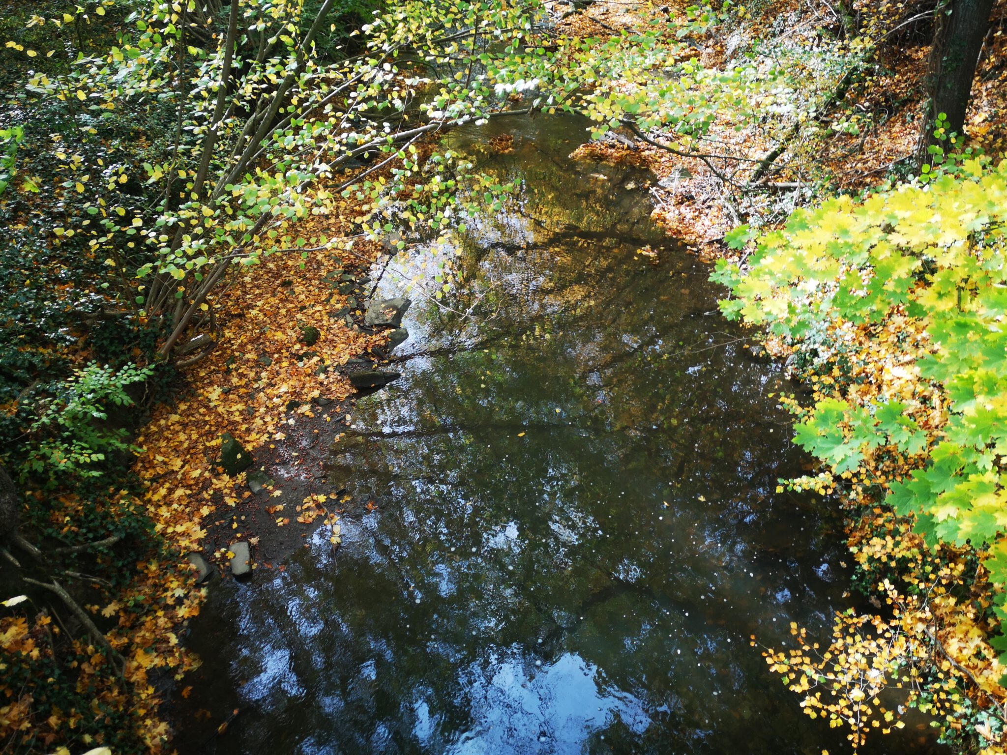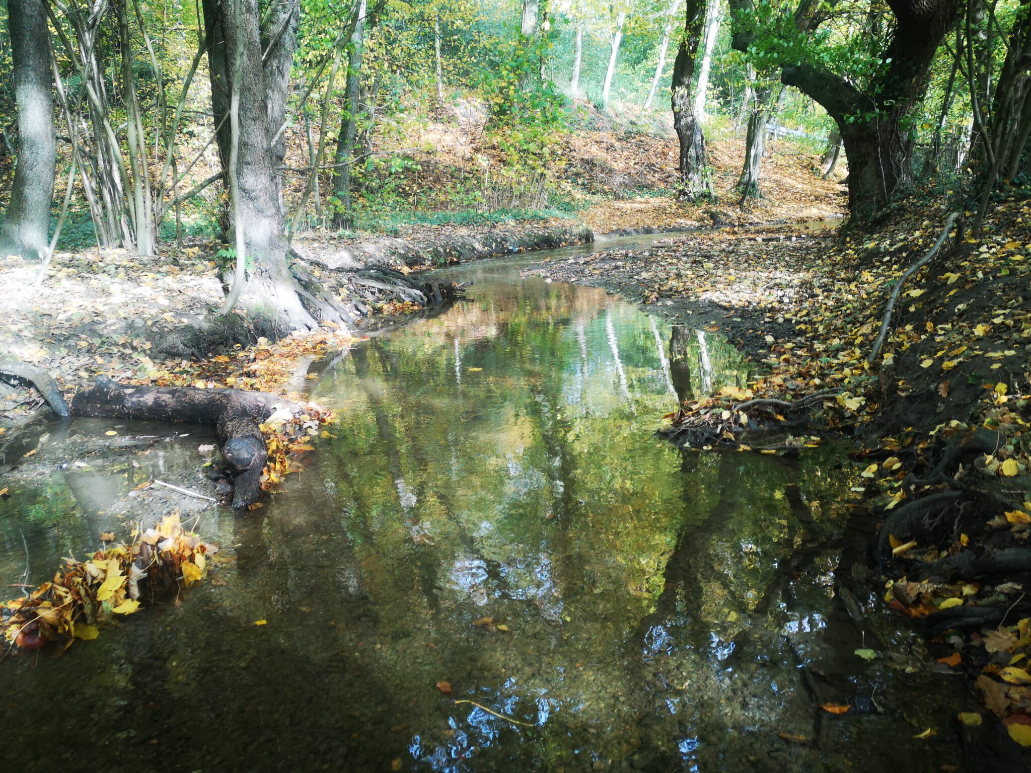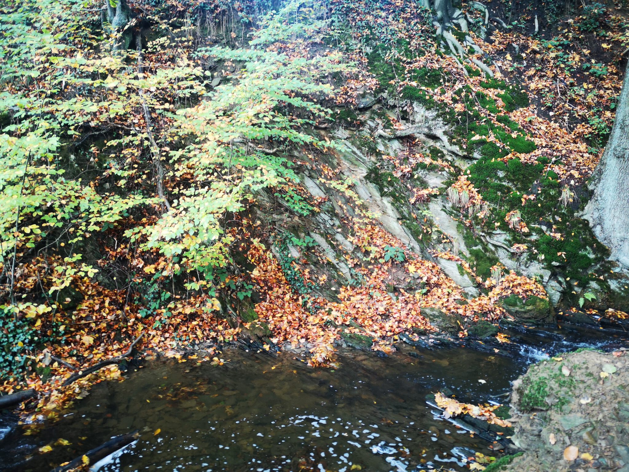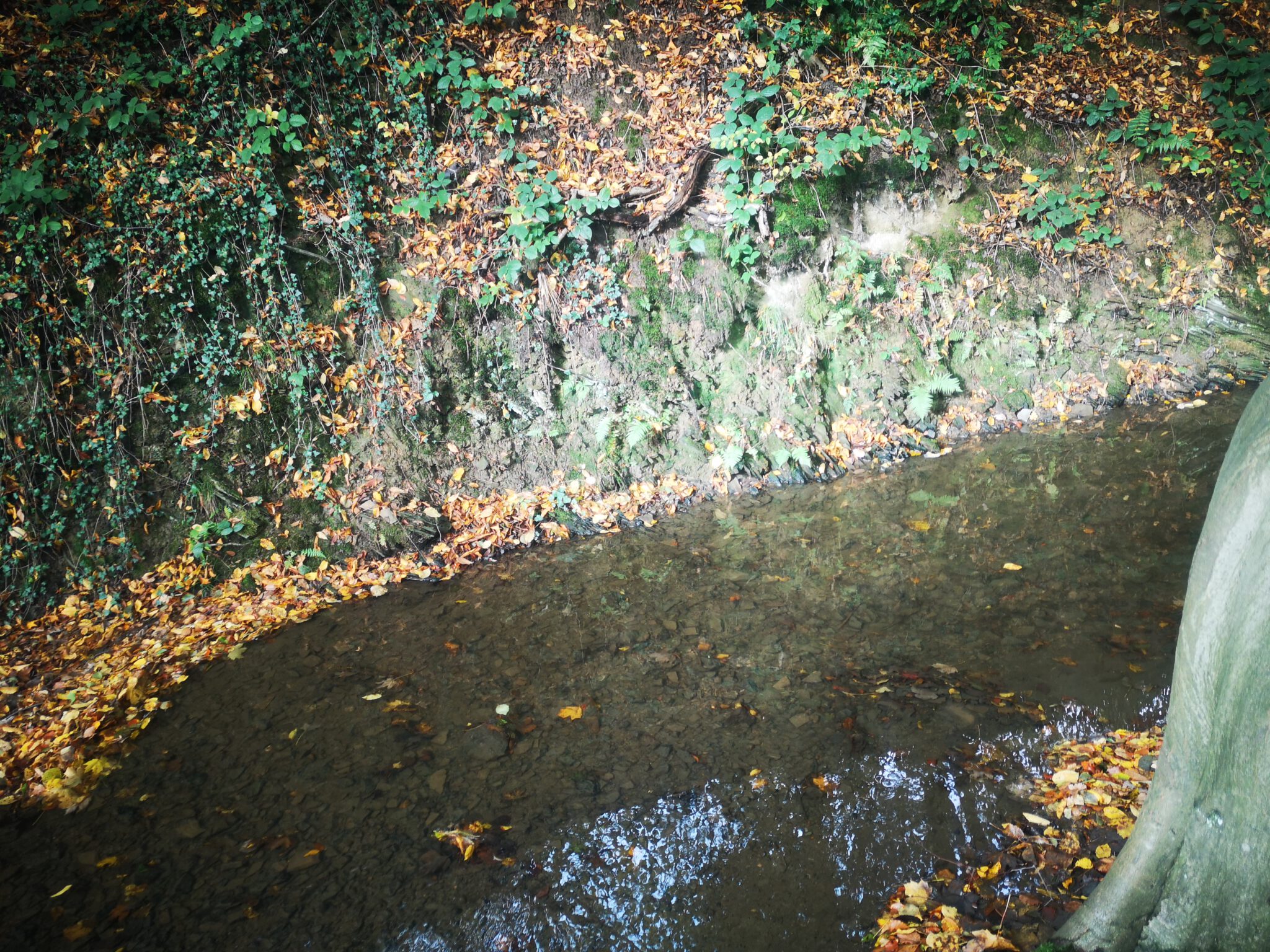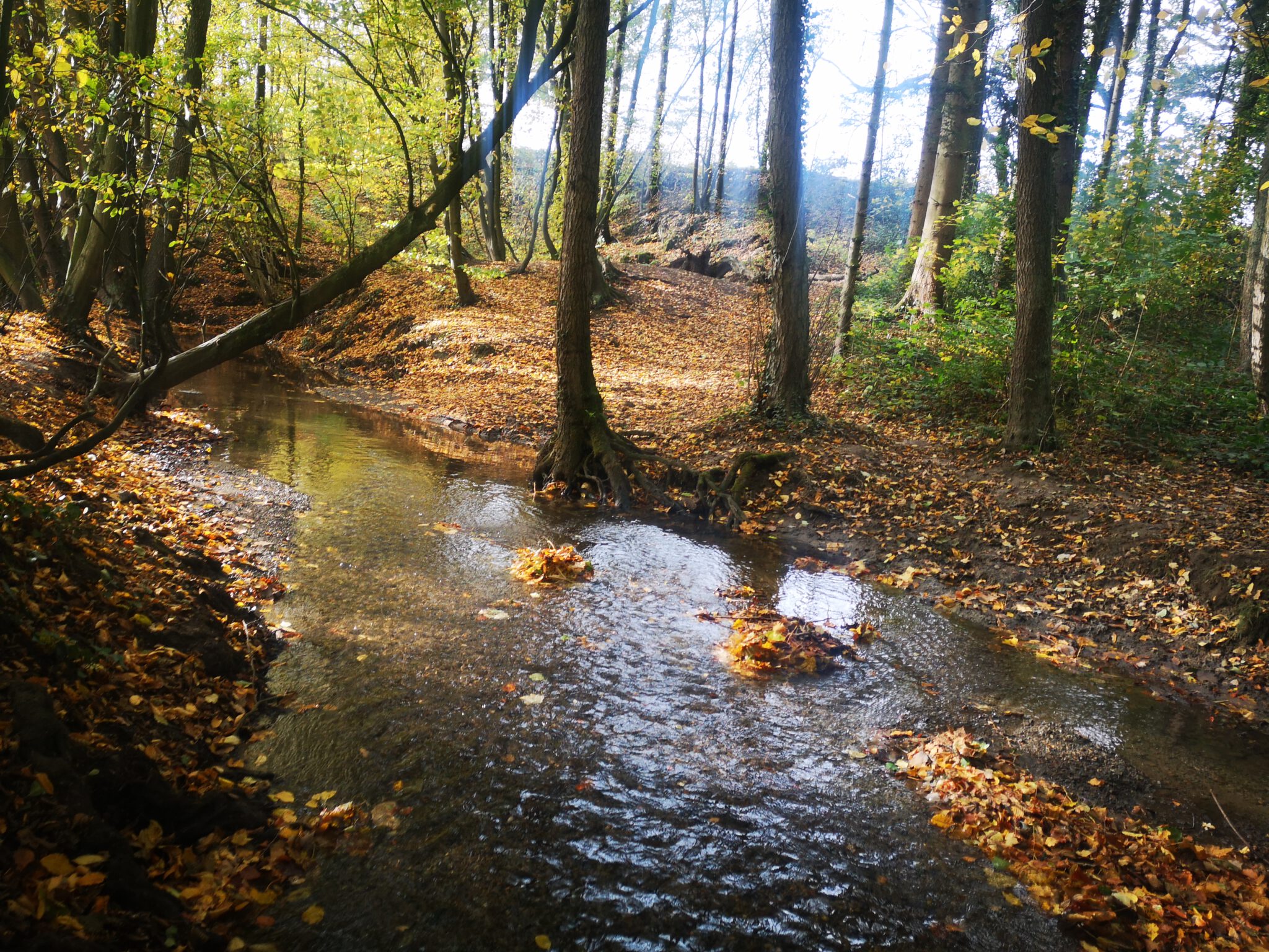 Die andere Uferseite ist recht steil. Die alten Bäume strecken ihre Wurzelzehen hangabwärts bis zum Wasser aus. An einer Steile plätschert die Düssel gebirgsbachig, dann fließt sie wieder ruhig, träge, und das warme Licht durchdringt das klare, dreißig Zentimeter tiefer Wasser bis zum mal sandigen, mal steinigem Boden.