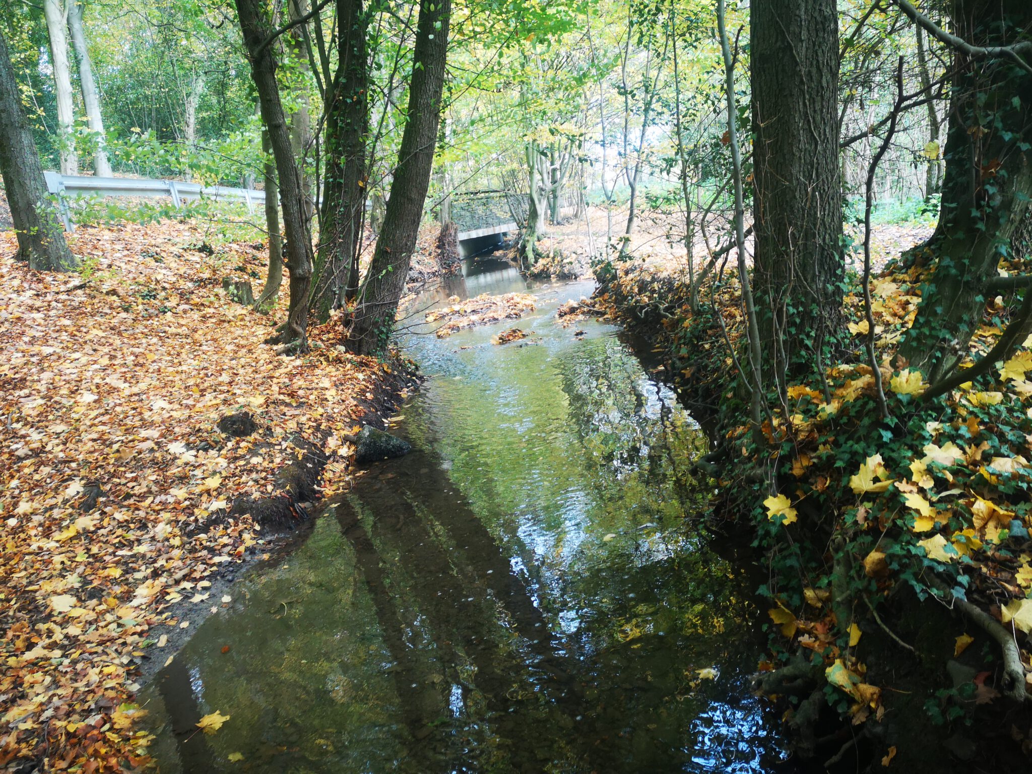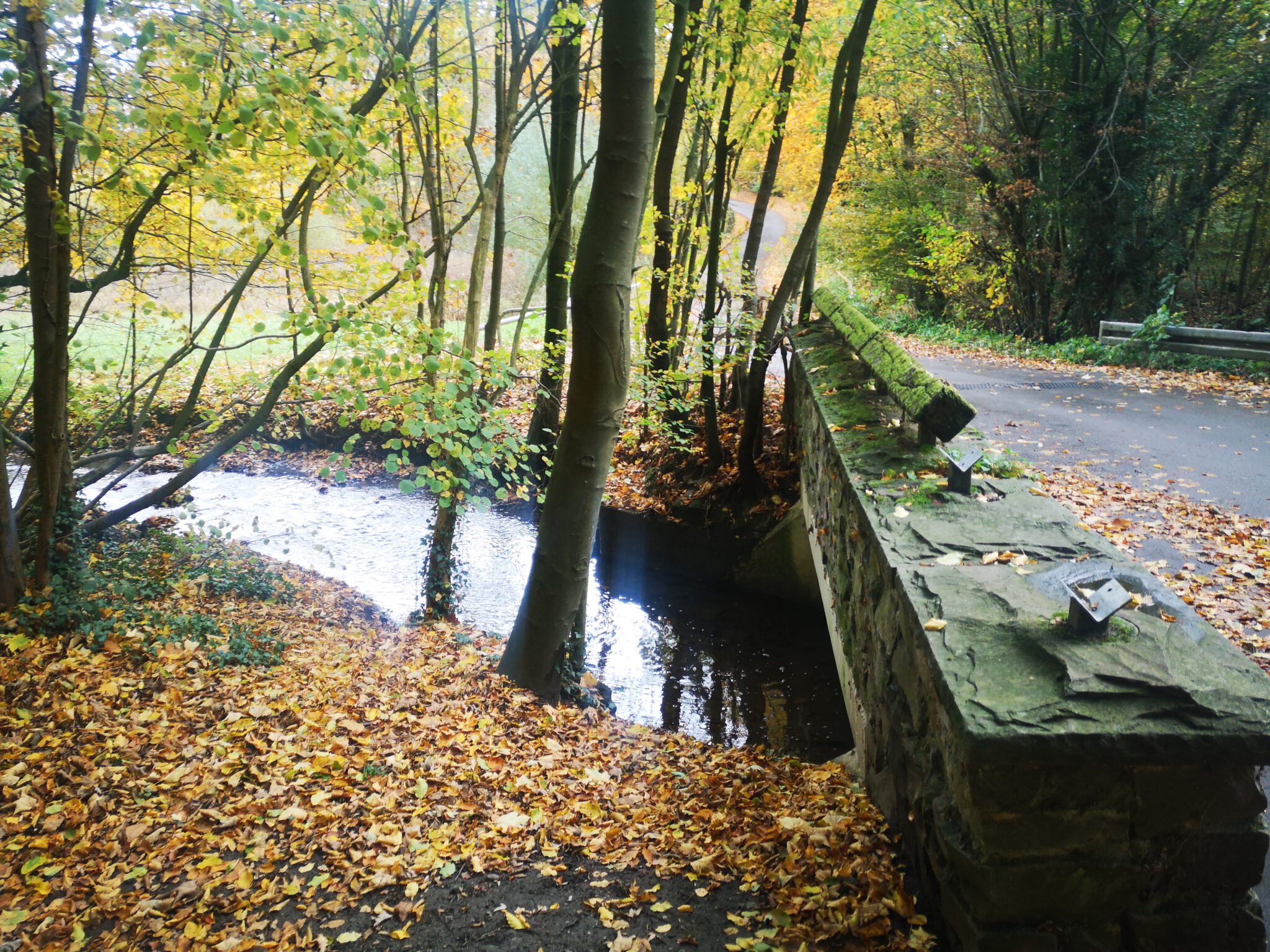 Als wir die Düssel erreichen, halten wir uns rechts, spazieren flussaufwärts an ihrem Ufer entlang, lassen den Mühlenteich rechts liegen.