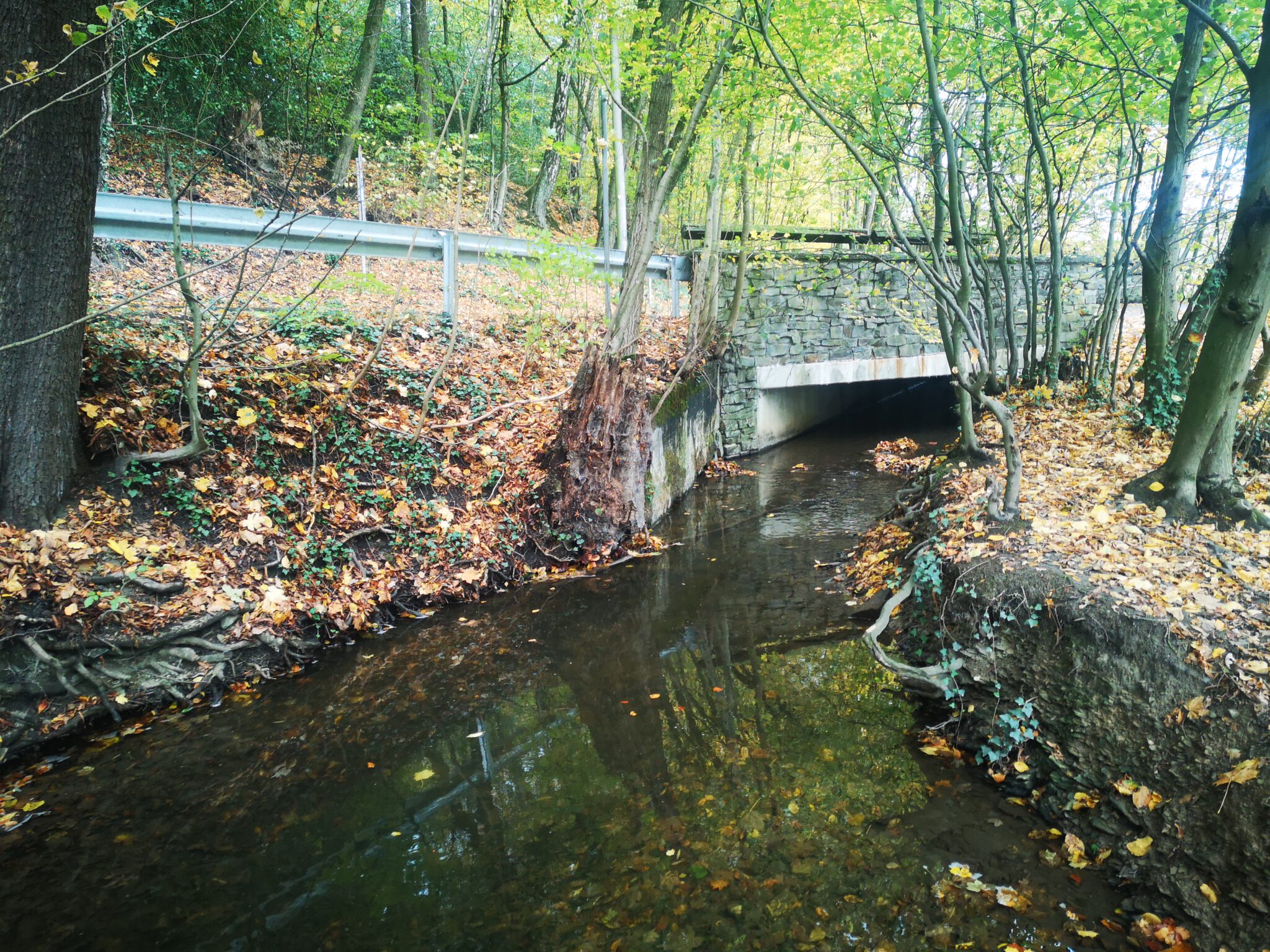 Wir erreichen einen asphaltierten Weg, der die Düssel überquert. Der Weg hat einen erstaunlichen Namen: Klinik Aprath.