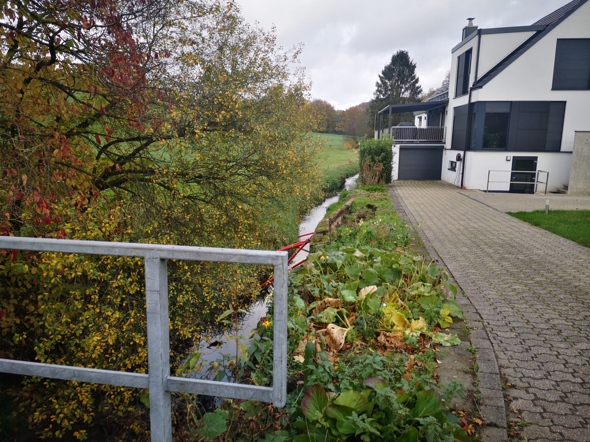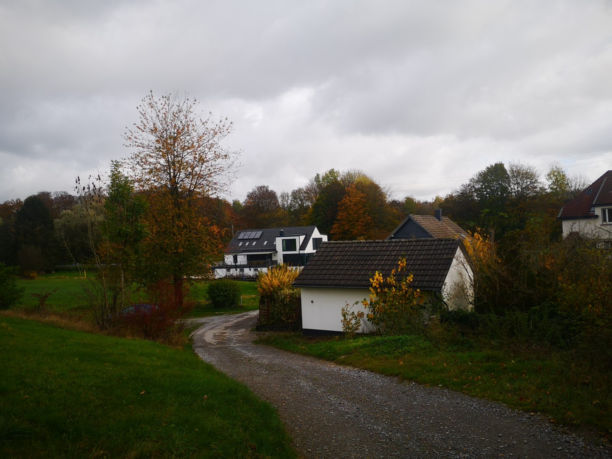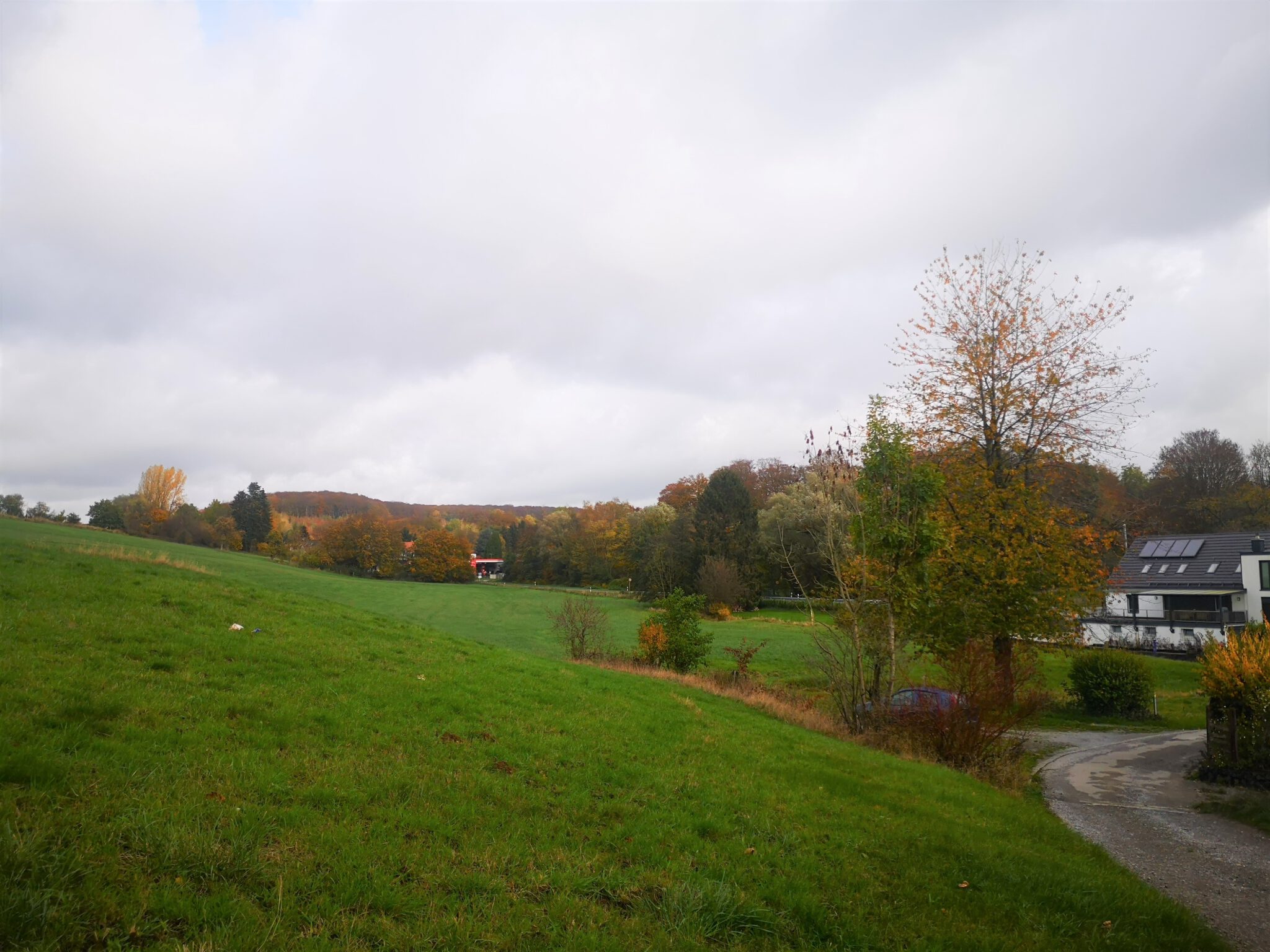 Nach rund 150 Metern schimmern hinter dem Flussbett Häuser durchs Blätterwerk, und dann ist der schmale Pfad zu Ende, und wir blicken auf weitläuf-hügelige Wiesen und Felder. Ein Schotterweg führt Richtung Düsselbett und zu einer kleinen Ansiedlung namens Schlupkothen: Alte Häuser, zum Teil mit Schiefer und Fachwerk, ein neues Haus ohne Fachwerk mit Düssel-Zugang.