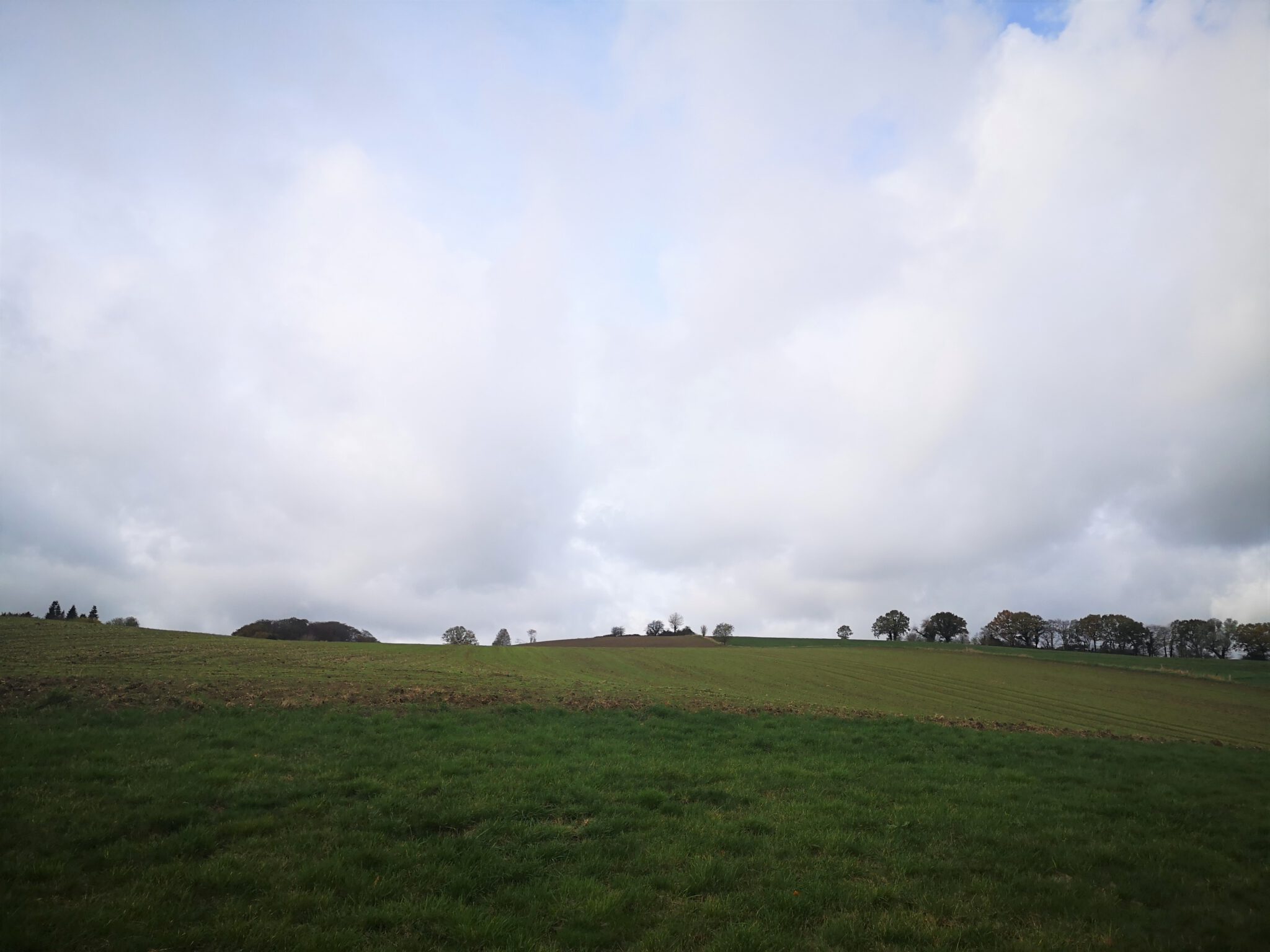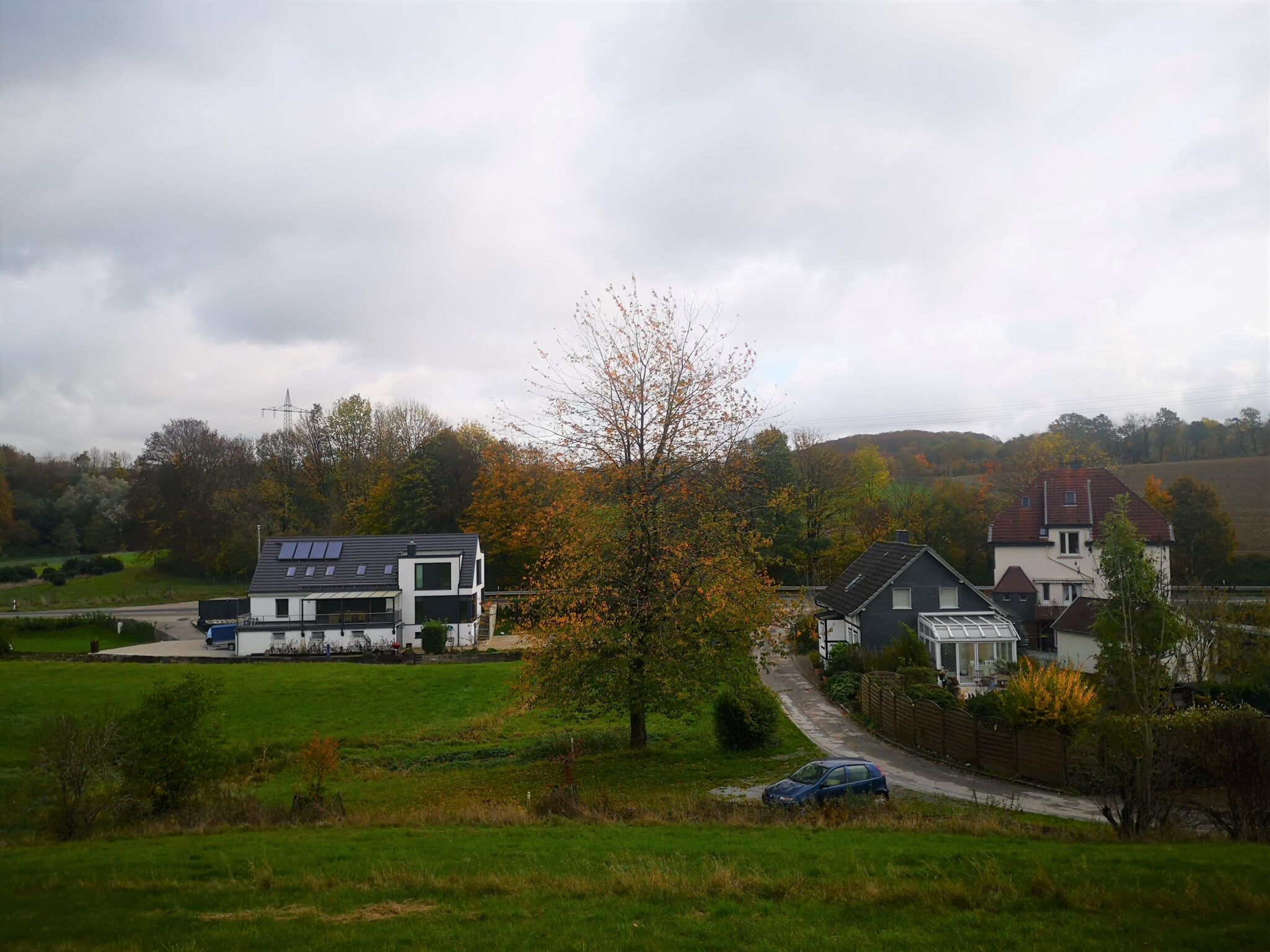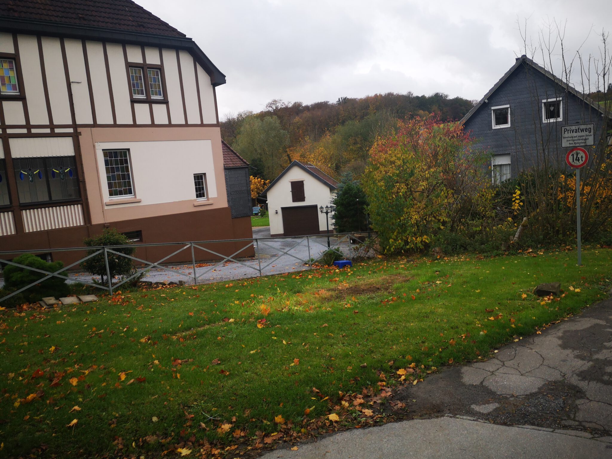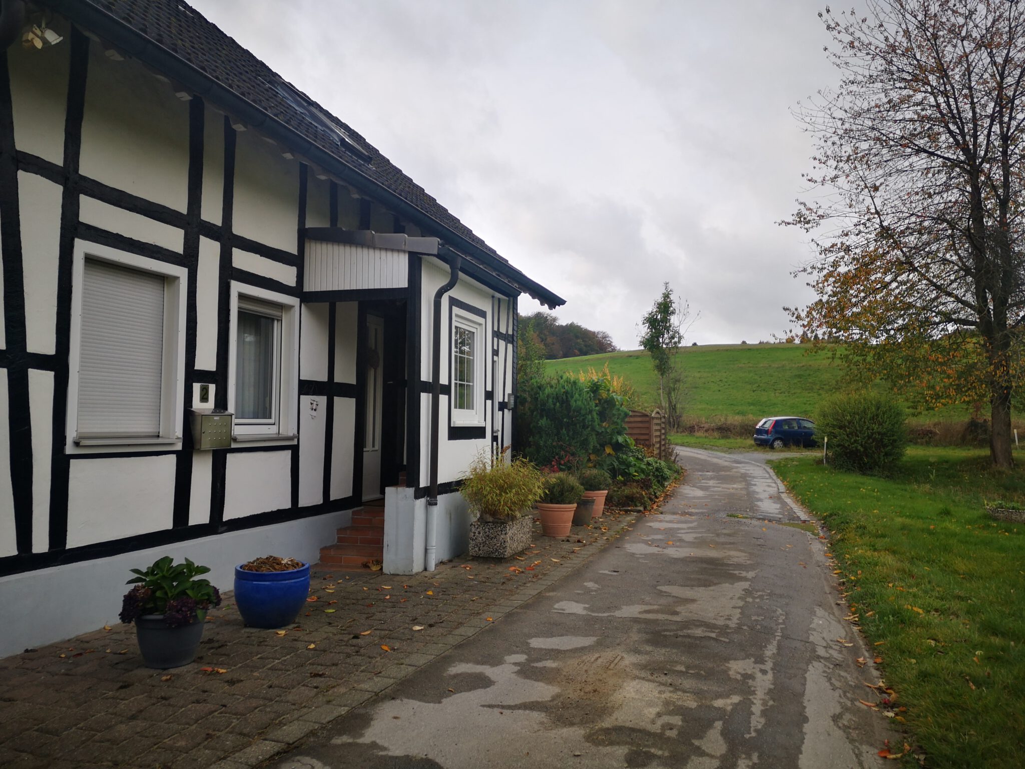 Nach rund 150 Metern schimmern hinter dem Flussbett Häuser durchs Blätterwerk, und dann ist der schmale Pfad zu Ende, und wir blicken auf weitläuf-hügelige Wiesen und Felder. Ein Schotterweg führt Richtung Düsselbett und zu einer kleinen Ansiedlung namens Schlupkothen: Alte Häuser, zum Teil mit Schiefer und Fachwerk, ein neues Haus ohne Fachwerk mit Düssel-Zugang.