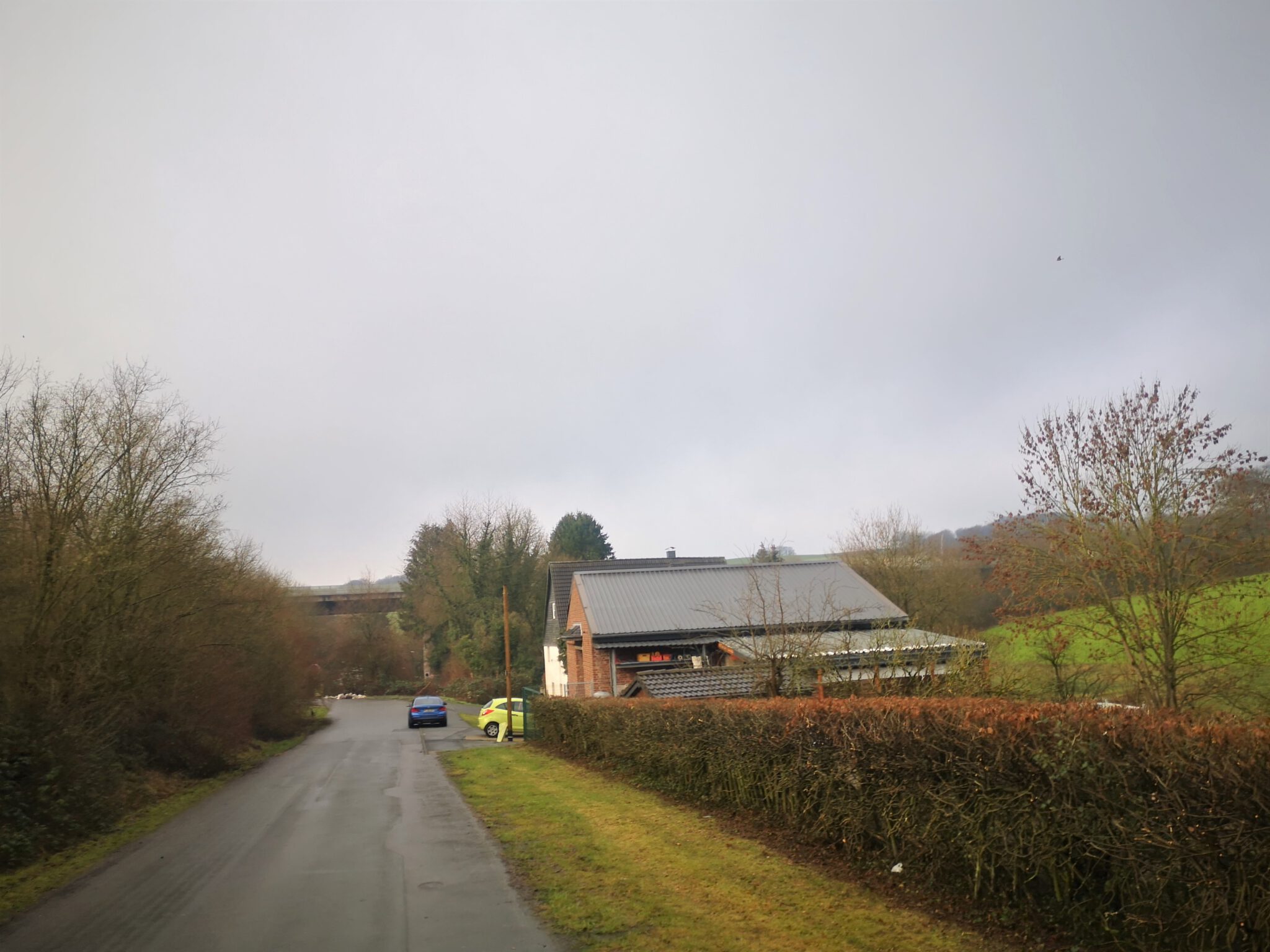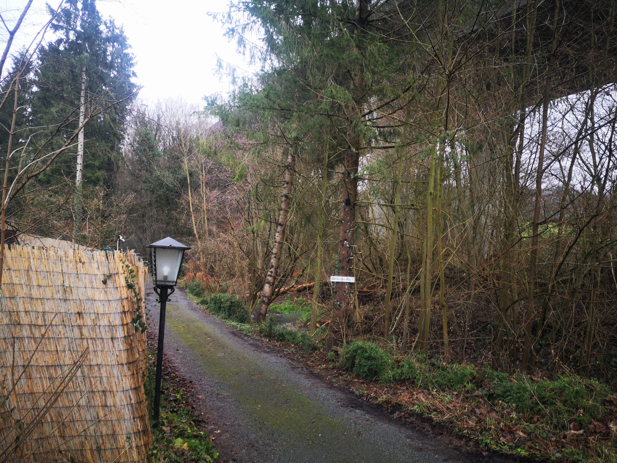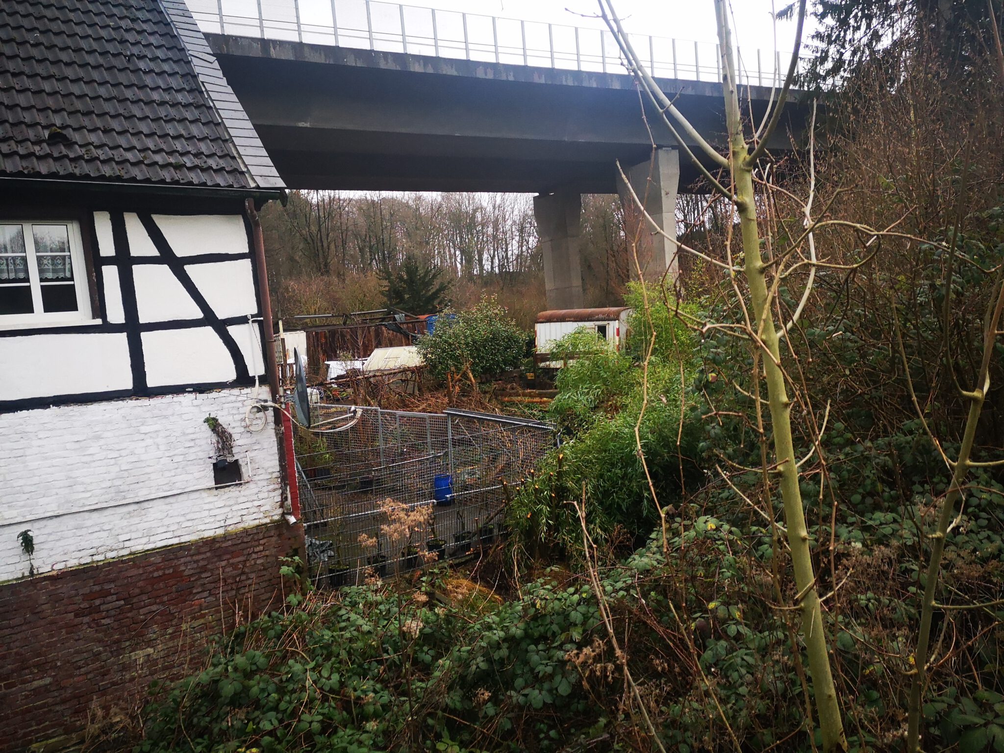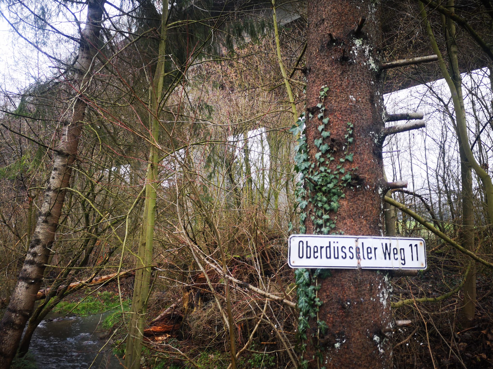 Der Straßenname weist bereits die Richtung: Wir biegen in den Oberdüsseler Weg ein, erreichen nach rund 100 Metern zunächst die Düssel und dann die Autobahn 535, die hoch über uns auf Betonstelzen durch das Tal wandert. Wir unterqueren sie, nehmen danach die erste Abbiegung links, ein schmales Sträßchen, immer noch als Oberdüsseler Weg firmierend und parken den Wagen vor einem der wenigen Wohnhäuser. Hier ist es ein wenig trist, aber auch ein Bisschen schön.
