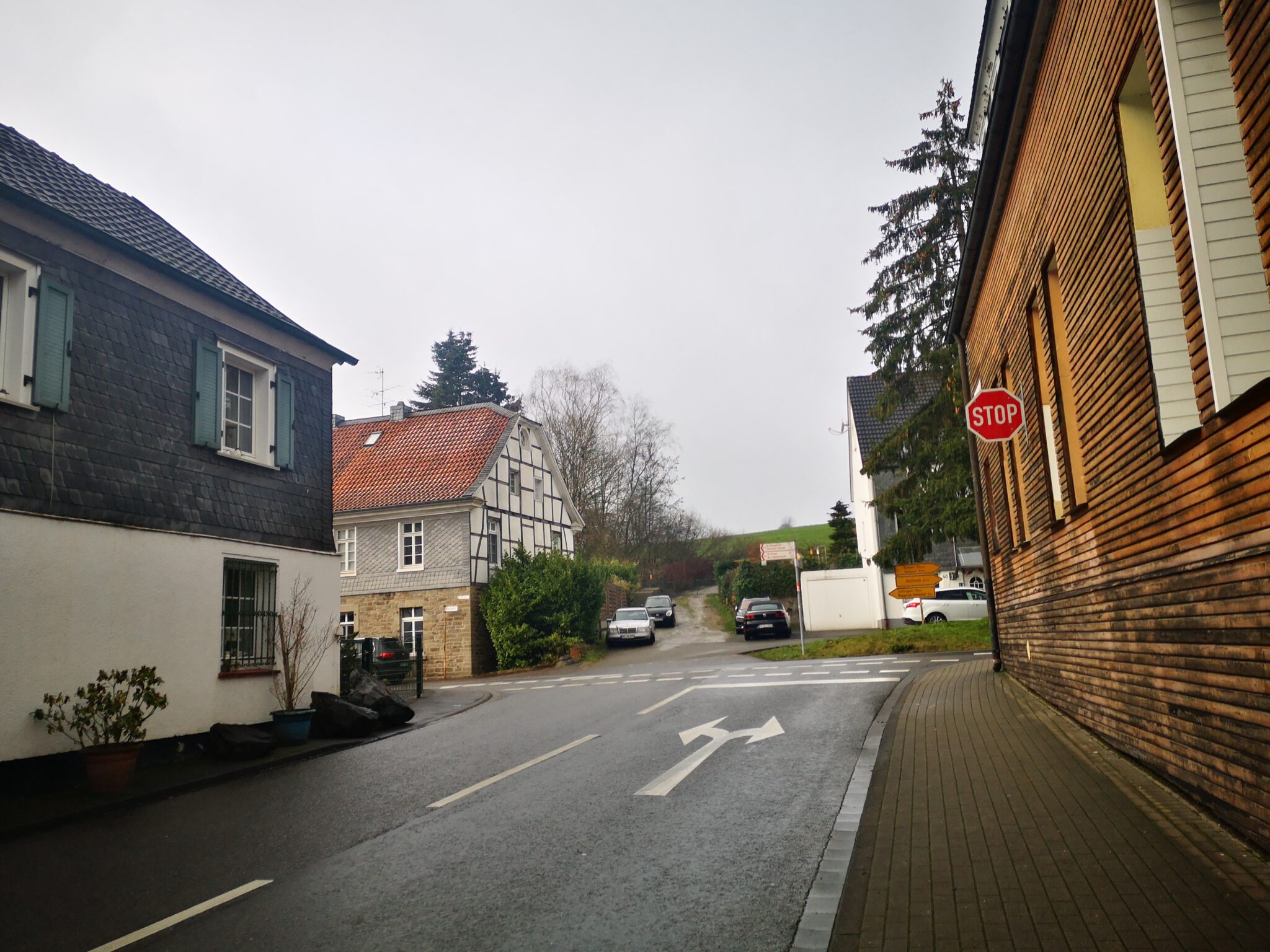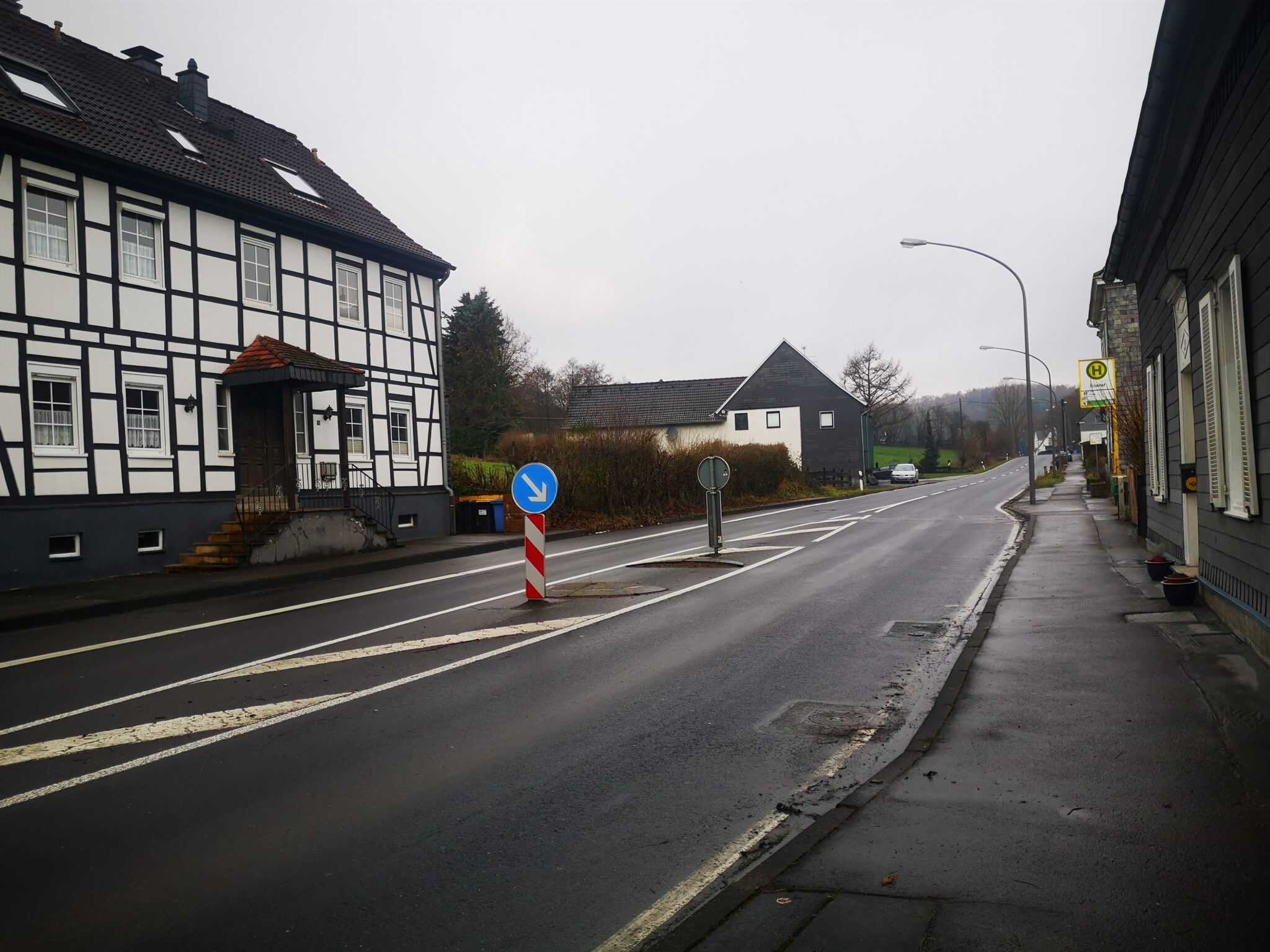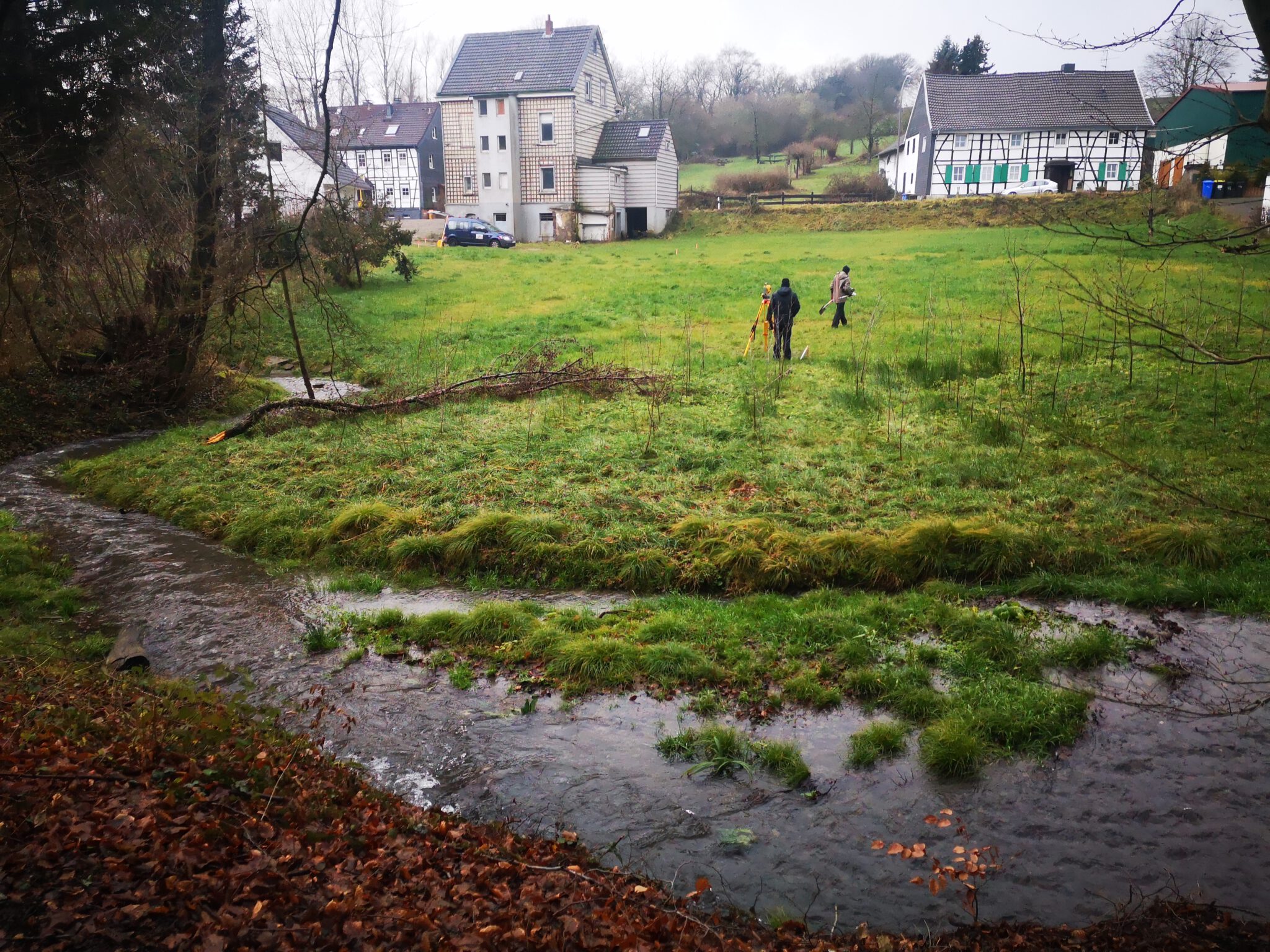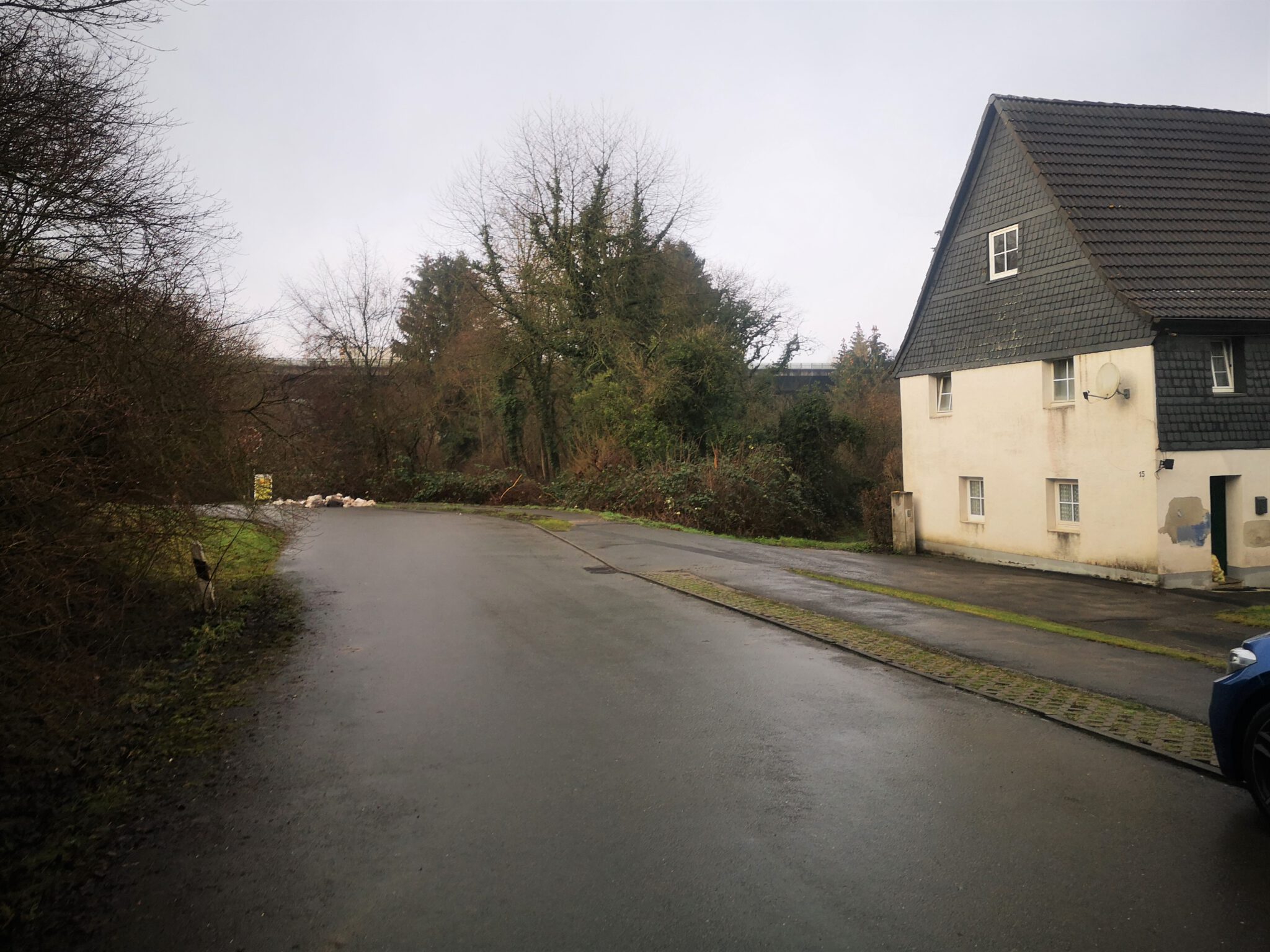 Ein Bisschen Fachwerk, ein Bisschen Schiefer, keine Menschen. Nach hundert Metern geht zwischen zwei Häusern ein Trampelpfad Richtung Düssel ab, der auf Google Maps weitaus größer aussieht als in der Realität. Auf einer Wiese daneben führen zwei Männer Entfernungsmessungen durch.