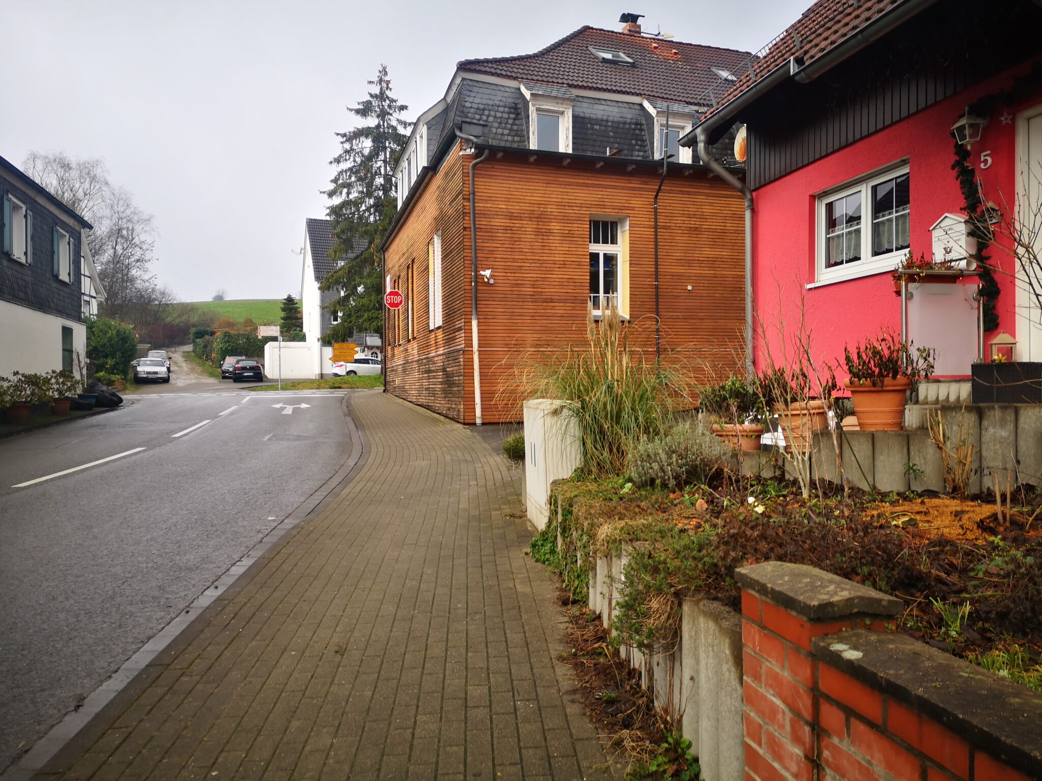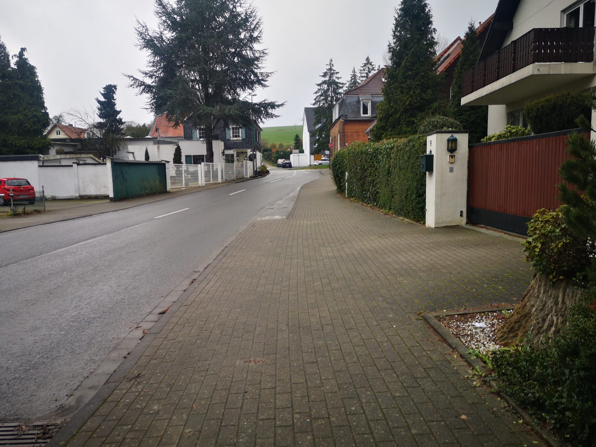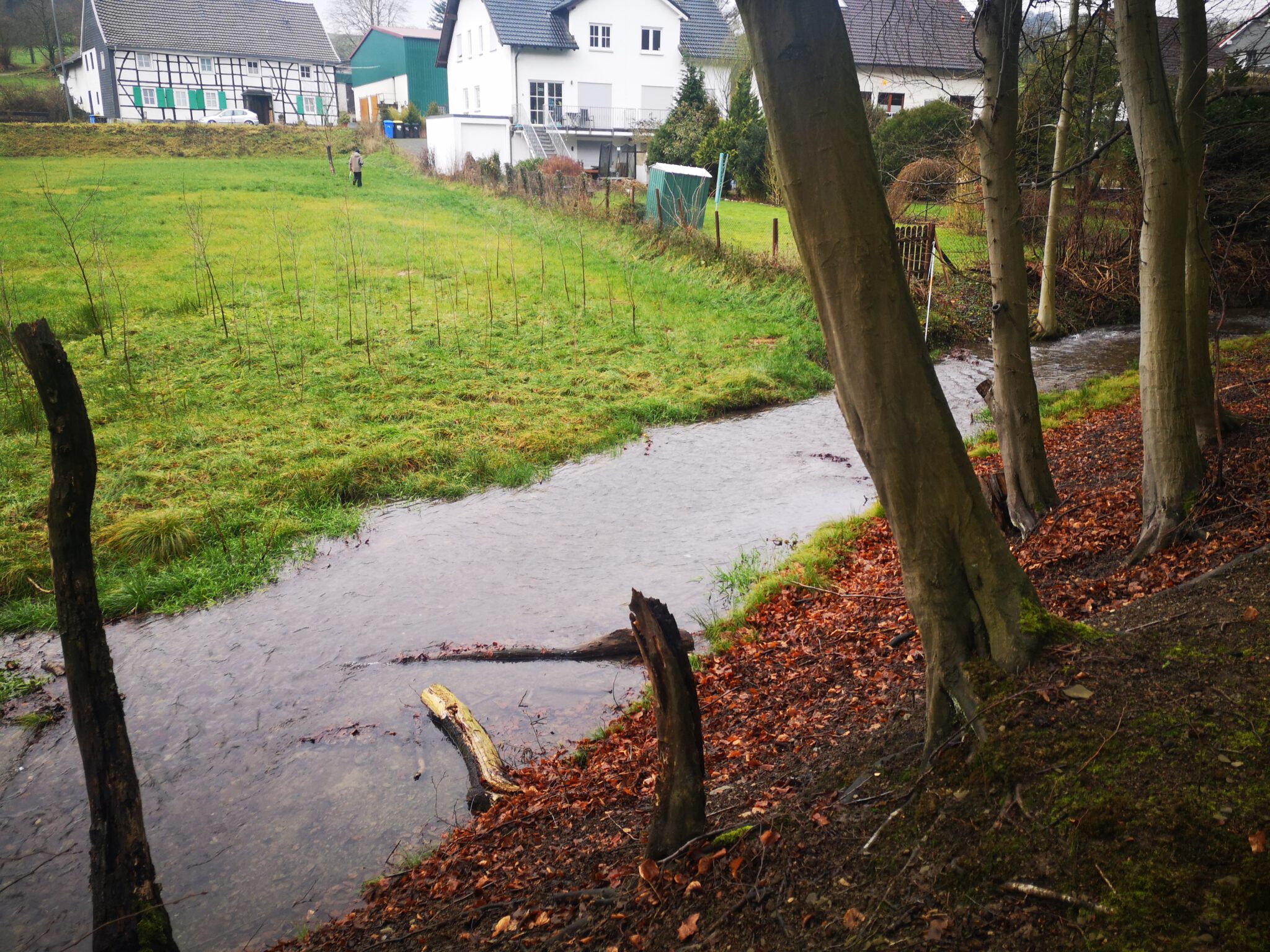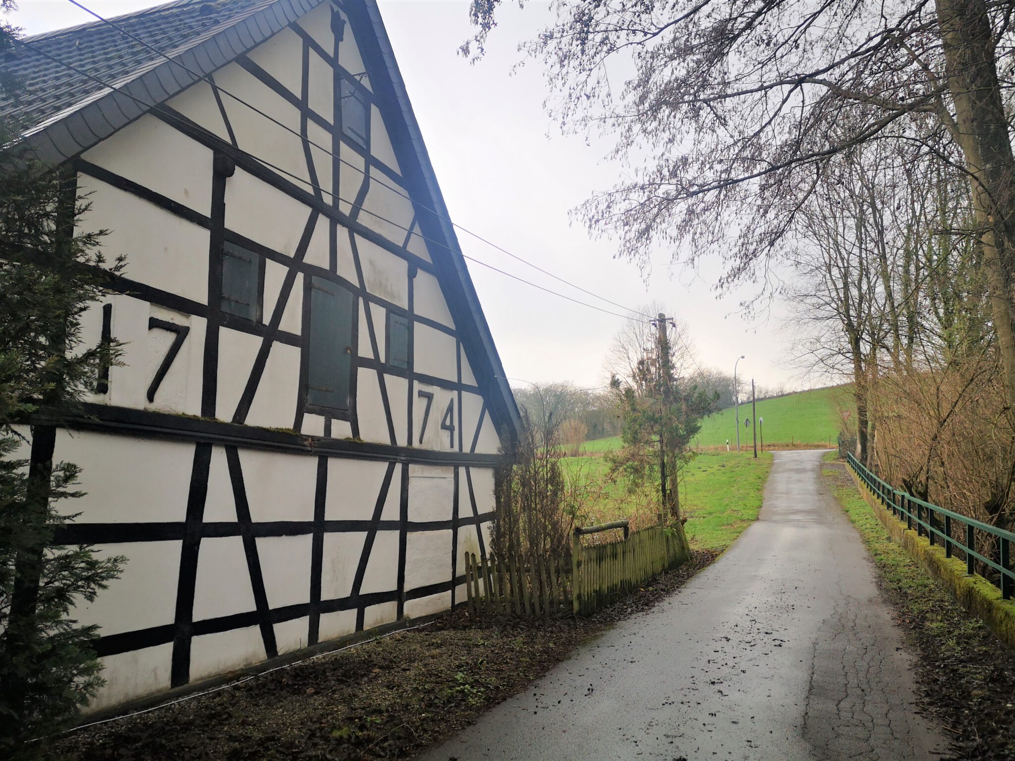 Ein Bisschen Fachwerk, ein Bisschen Schiefer, keine Menschen. Nach hundert Metern geht zwischen zwei Häusern ein Trampelpfad Richtung Düssel ab, der auf Google Maps weitaus größer aussieht als in der Realität. Auf einer Wiese daneben führen zwei Männer Entfernungsmessungen durch.