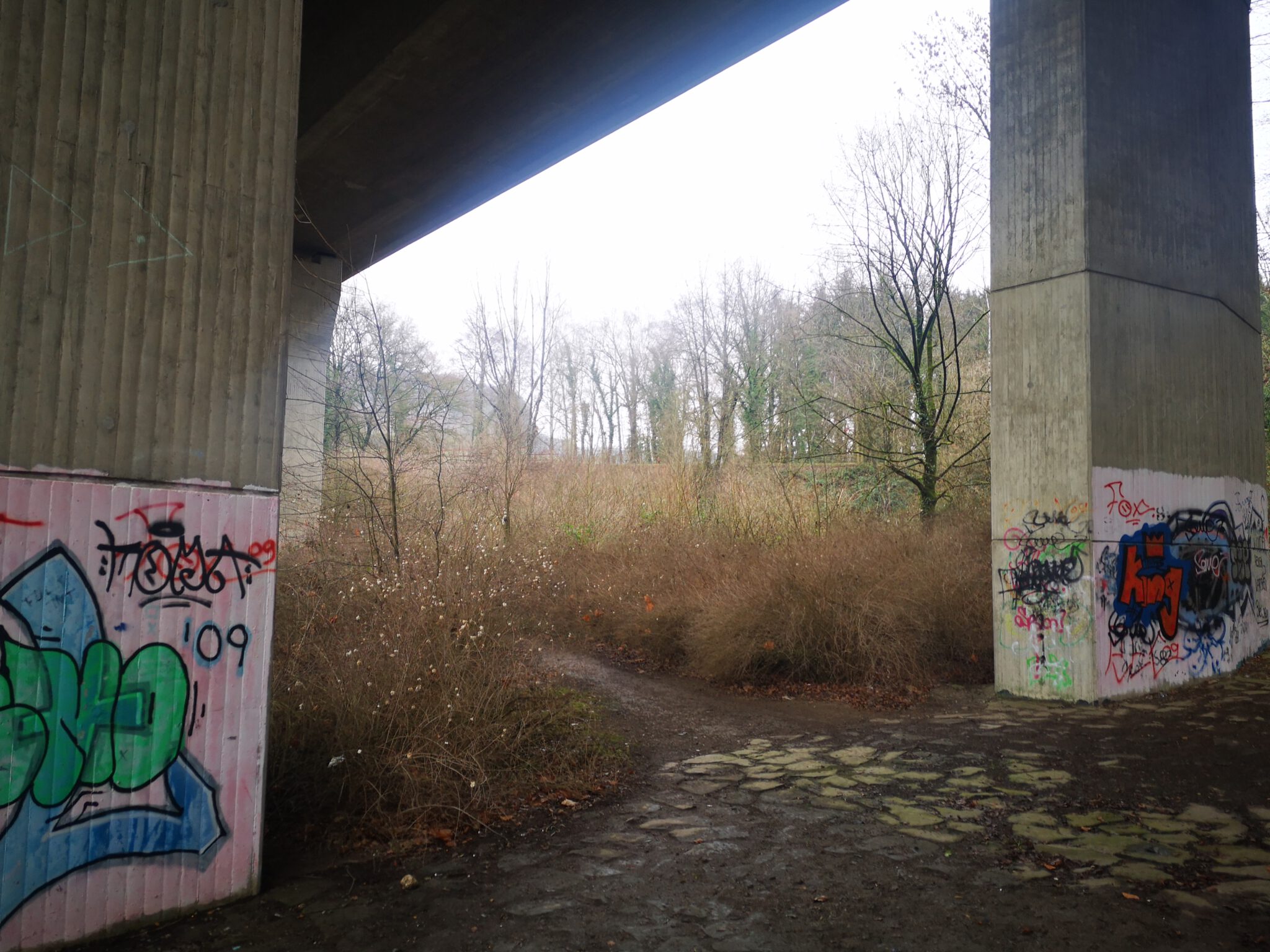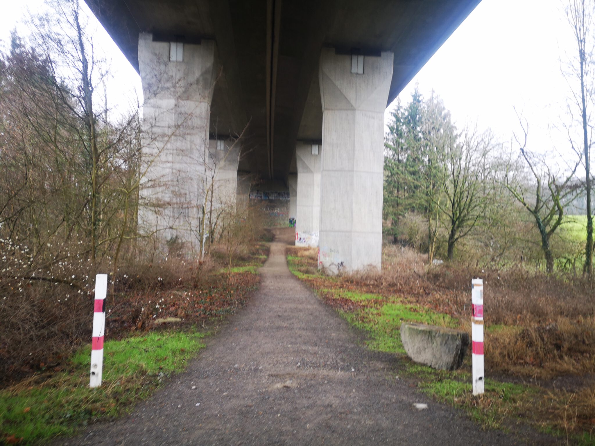 Wir könnten nun dem Pfad folgen, der in der Mitte des Unter-der-Brücke-Geländes verläuft, gekennzeichnet durch zwei weiß-rote Pöller.