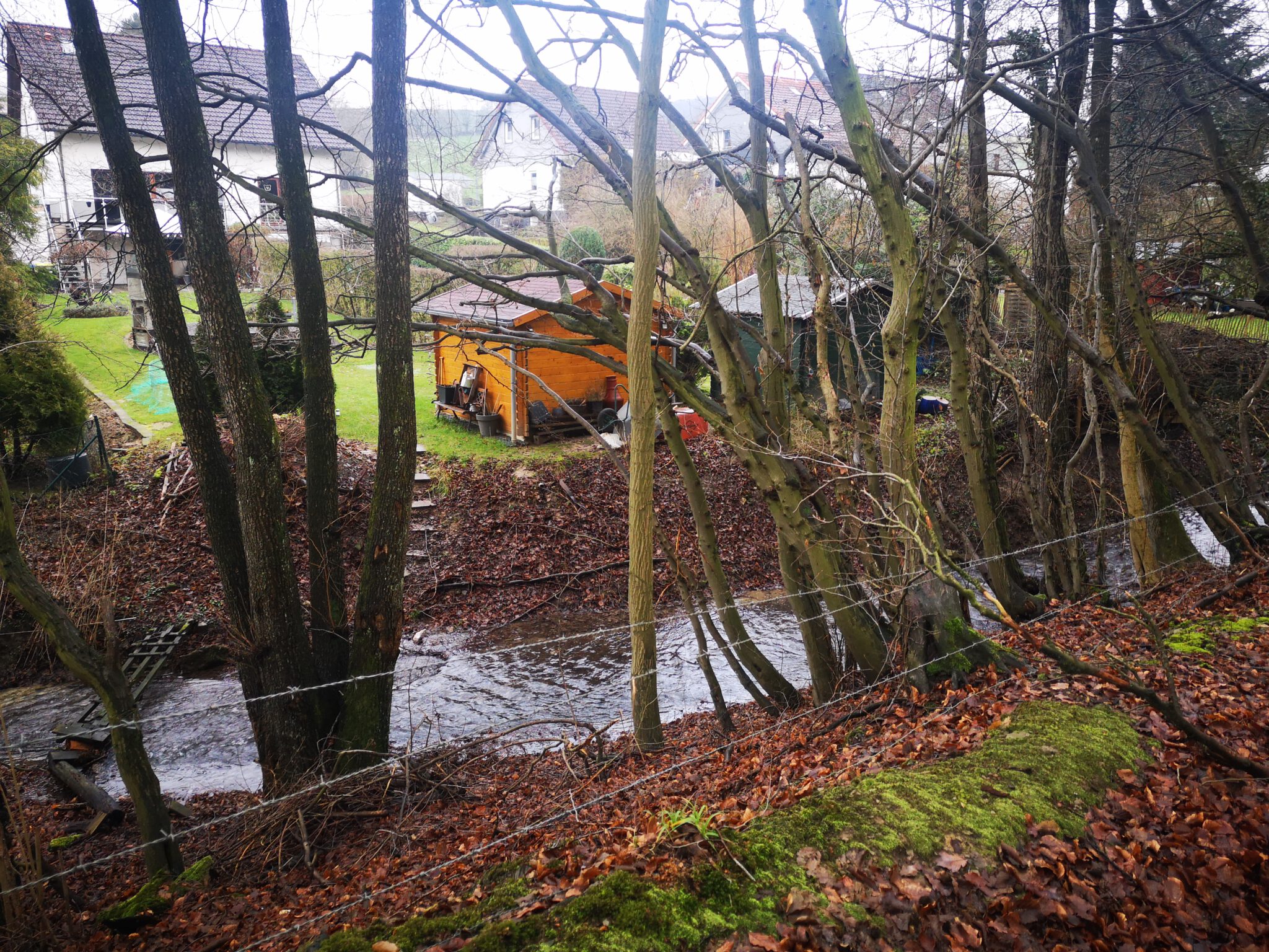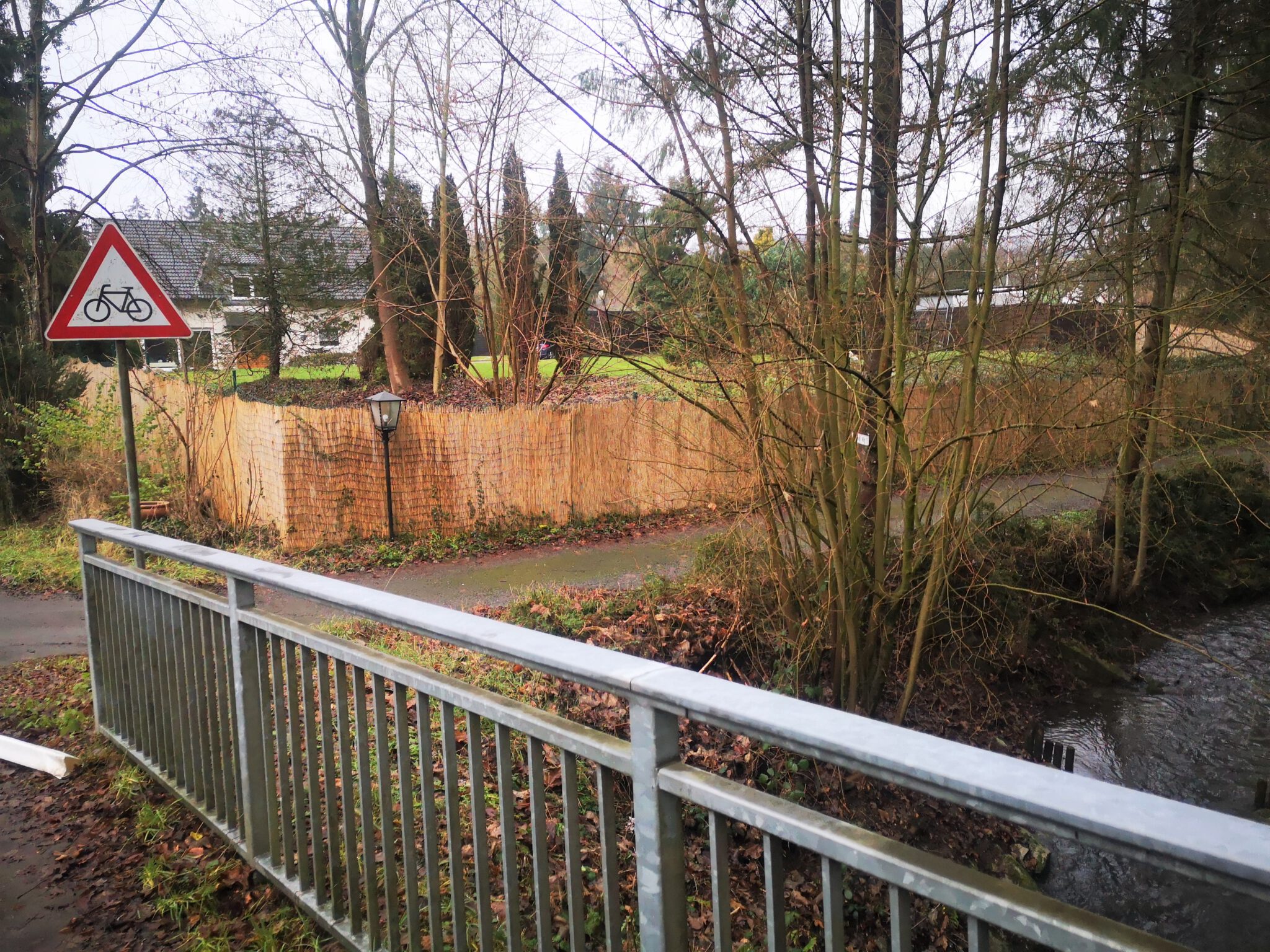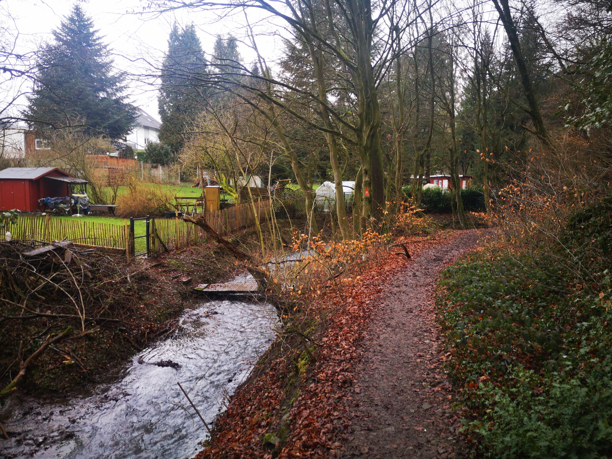Weiter flussaufwärts. Am anderen Ufer grenzen diverse Grundstücke mit ihren Gärten direkt an unser Flüsschen. Und zwei Mal haben die Garten-Inhaber eine Behelfsbrücke über die Düssel gelegt. In Düsseldorf waren wir noch fasziniert, als wir in Unterbilk die ersten privaten Gärten mit Düssel-Zugang entdeckten, nach mehr als 30 Kilometern haben wir uns daran gewöhnt.
