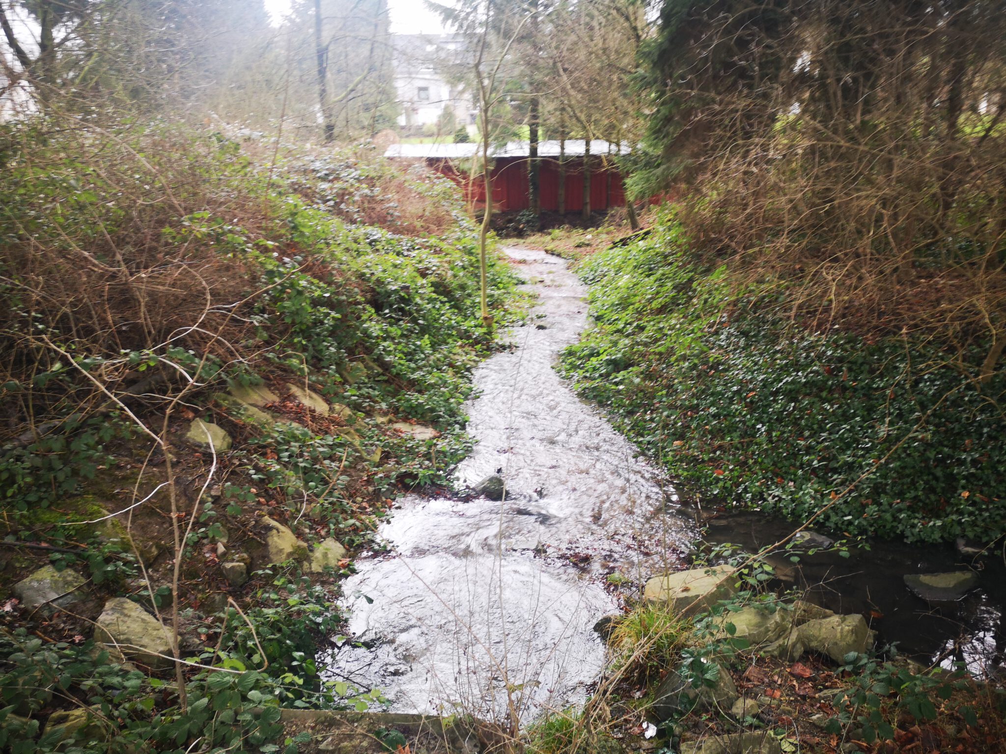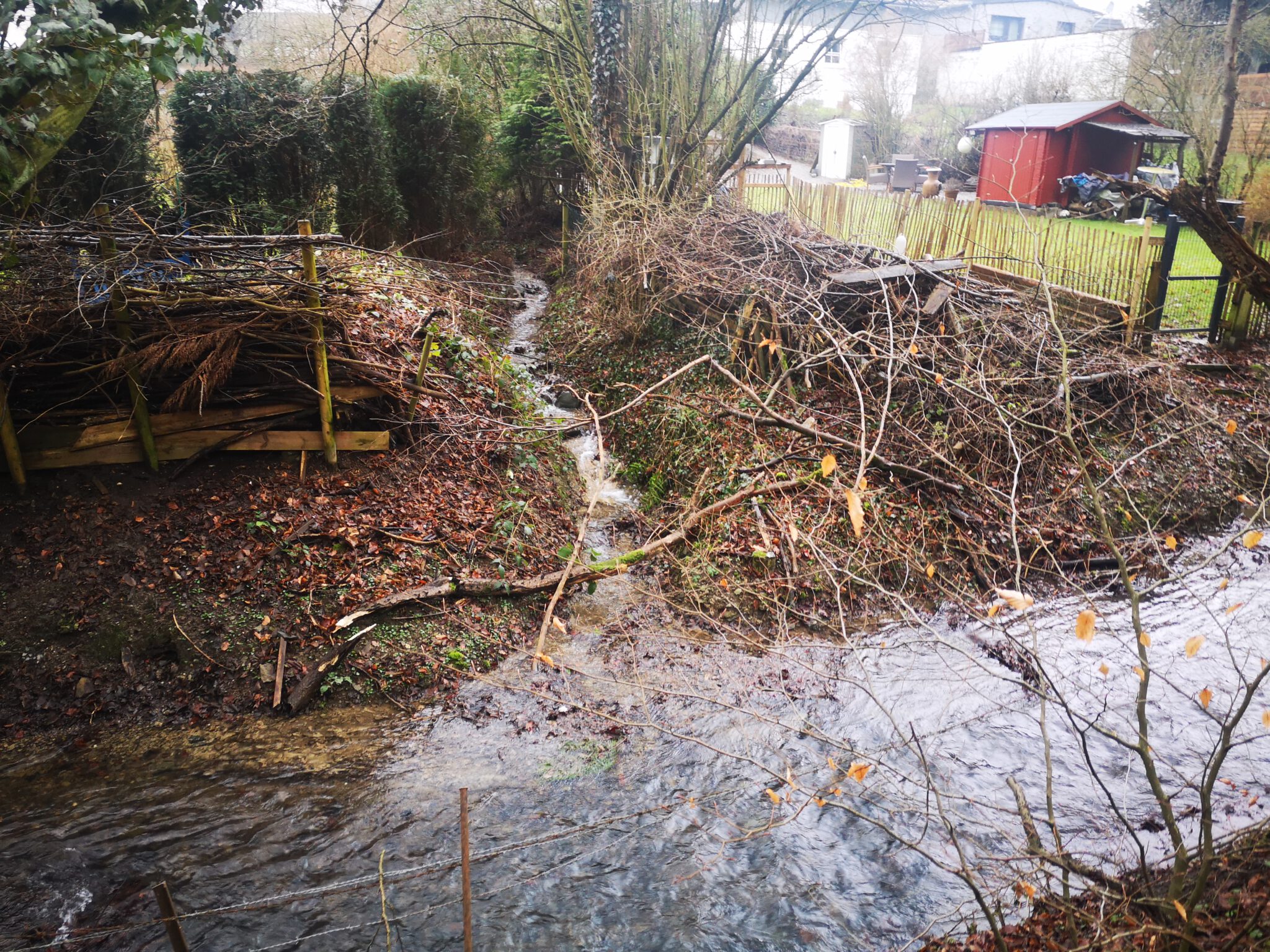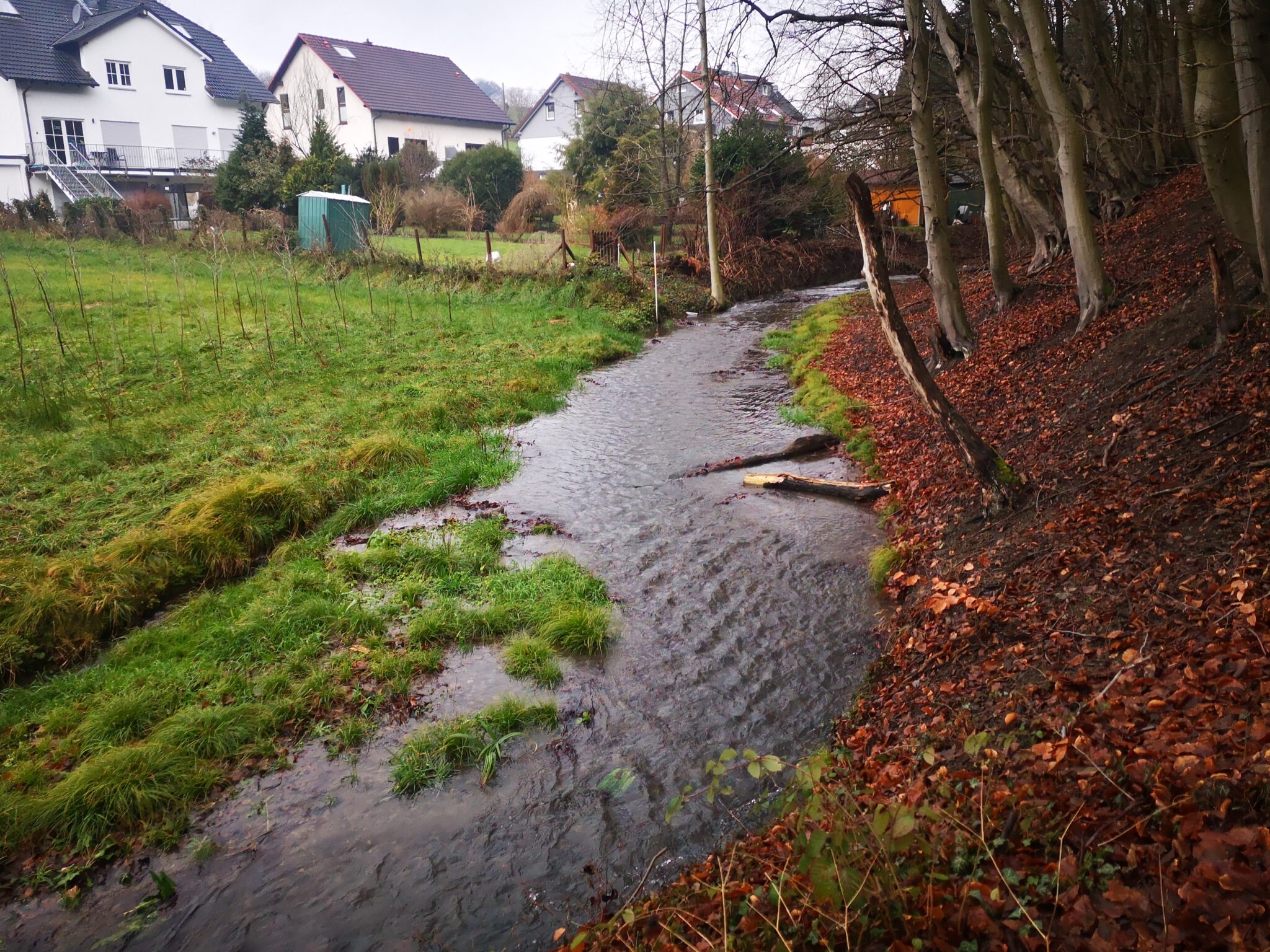 Weiter flussaufwärts. Am anderen Ufer grenzen diverse Grundstücke mit ihren Gärten direkt an unser Flüsschen. Und zwei Mal haben die Garten-Inhaber eine Behelfsbrücke über die Düssel gelegt. In Düsseldorf waren wir noch fasziniert, als wir in Unterbilk die ersten privaten Gärten mit Düssel-Zugang entdeckten, nach mehr als 30 Kilometern haben wir uns daran gewöhnt.