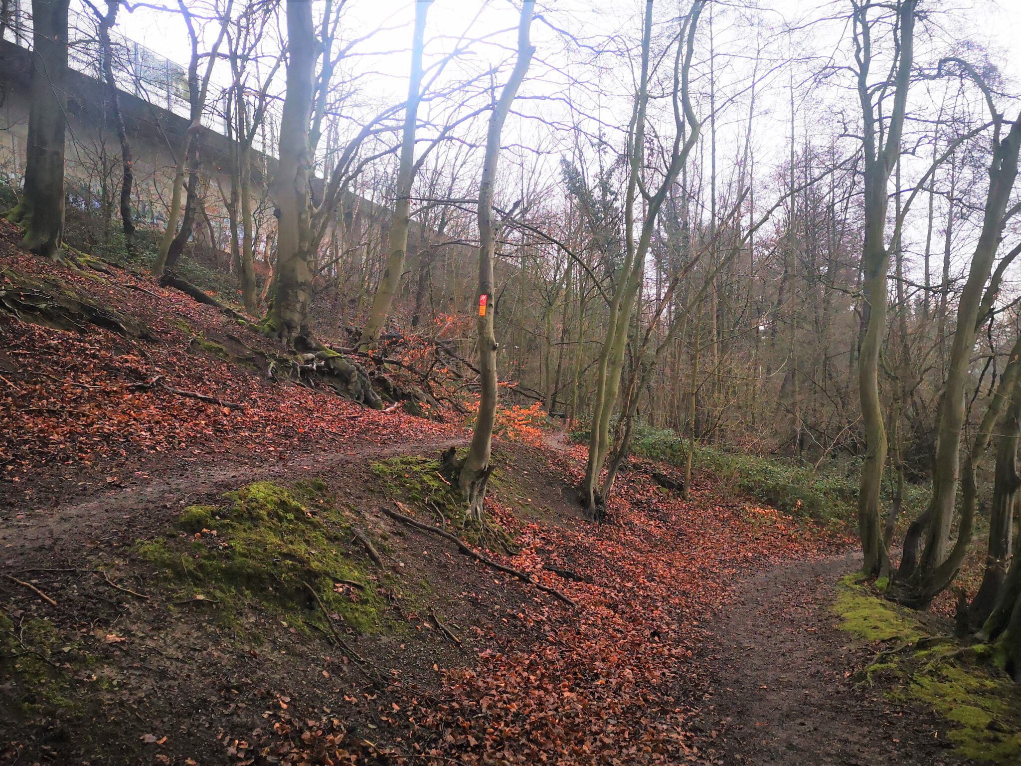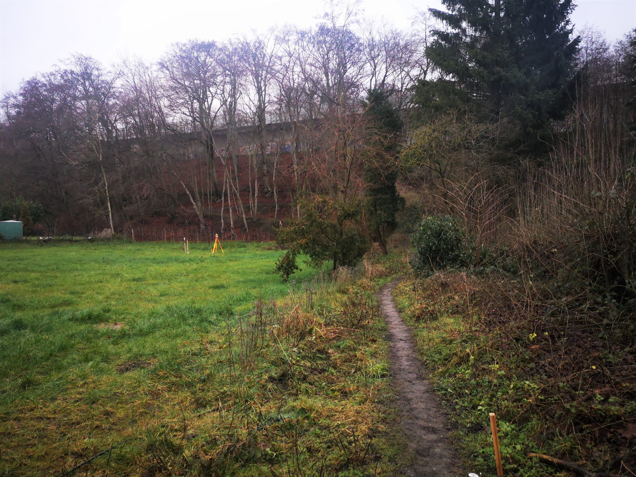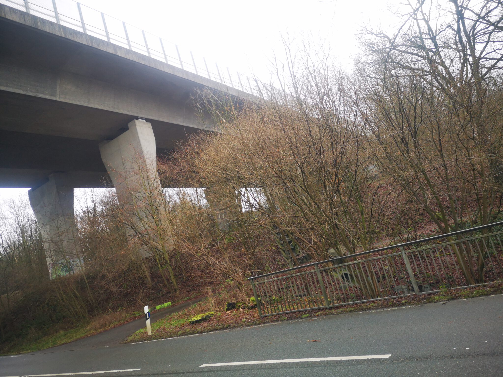 Wir überqueren die Düssel, gelangen an den Hang der Autobahntrasse (hier ohne Stelzen). Der Weg am Hang wird breiter, verläuft flussaufwärts parallel zum Flussbett, scheint ein offizieller Wanderweg zu sein. Und es gibt auch einen Weg-Knick, der flussabwärts abzweigt.