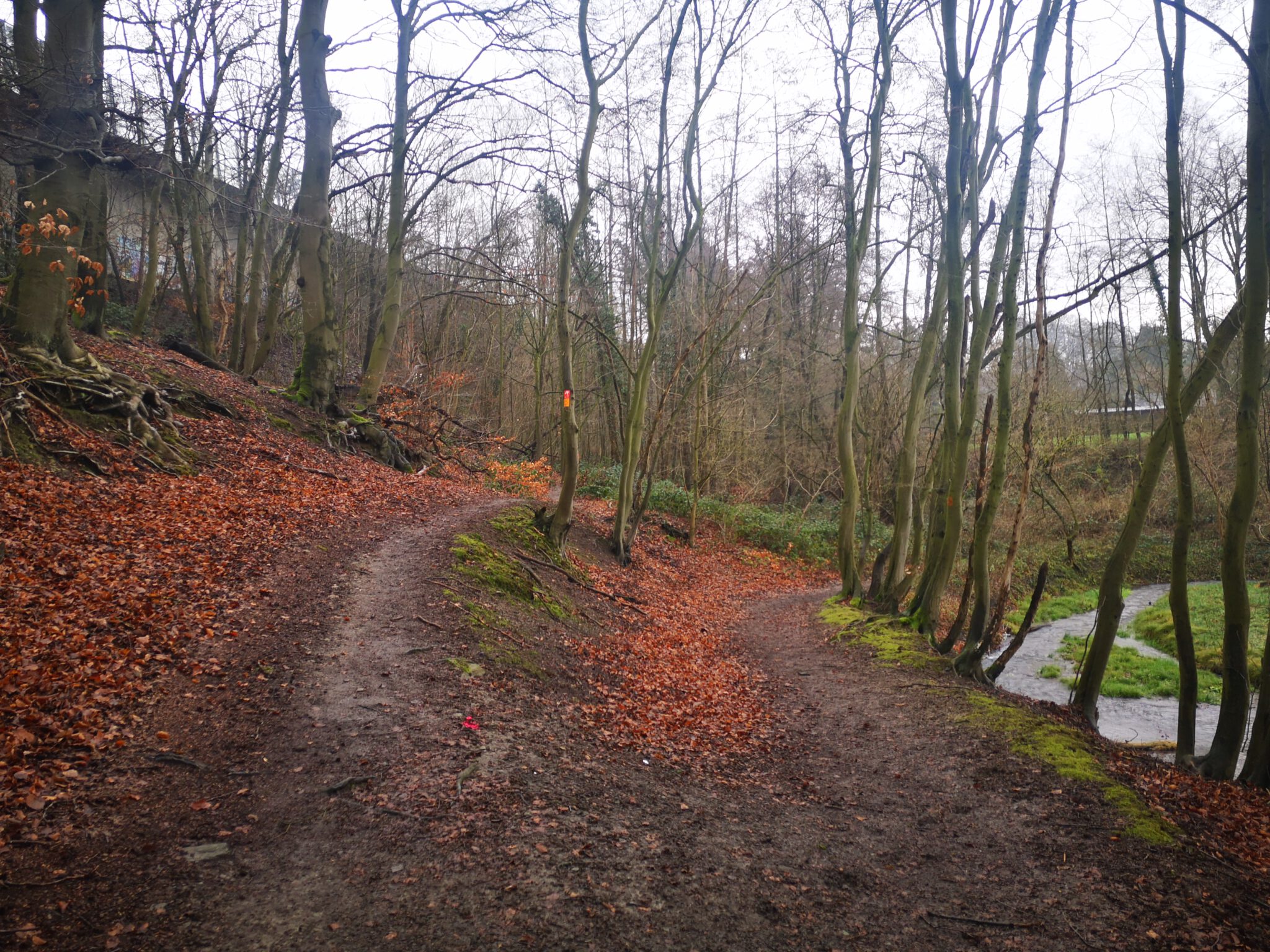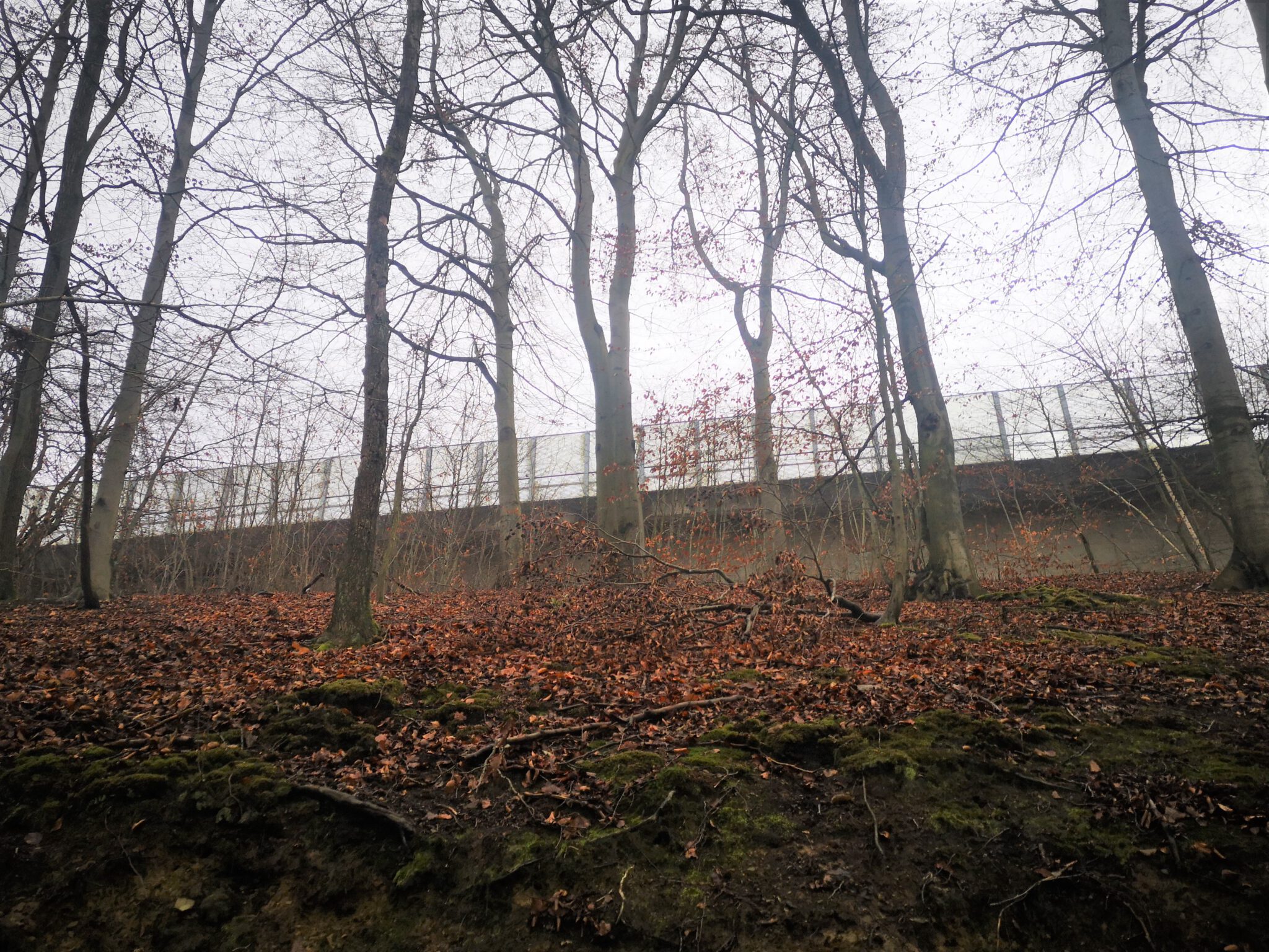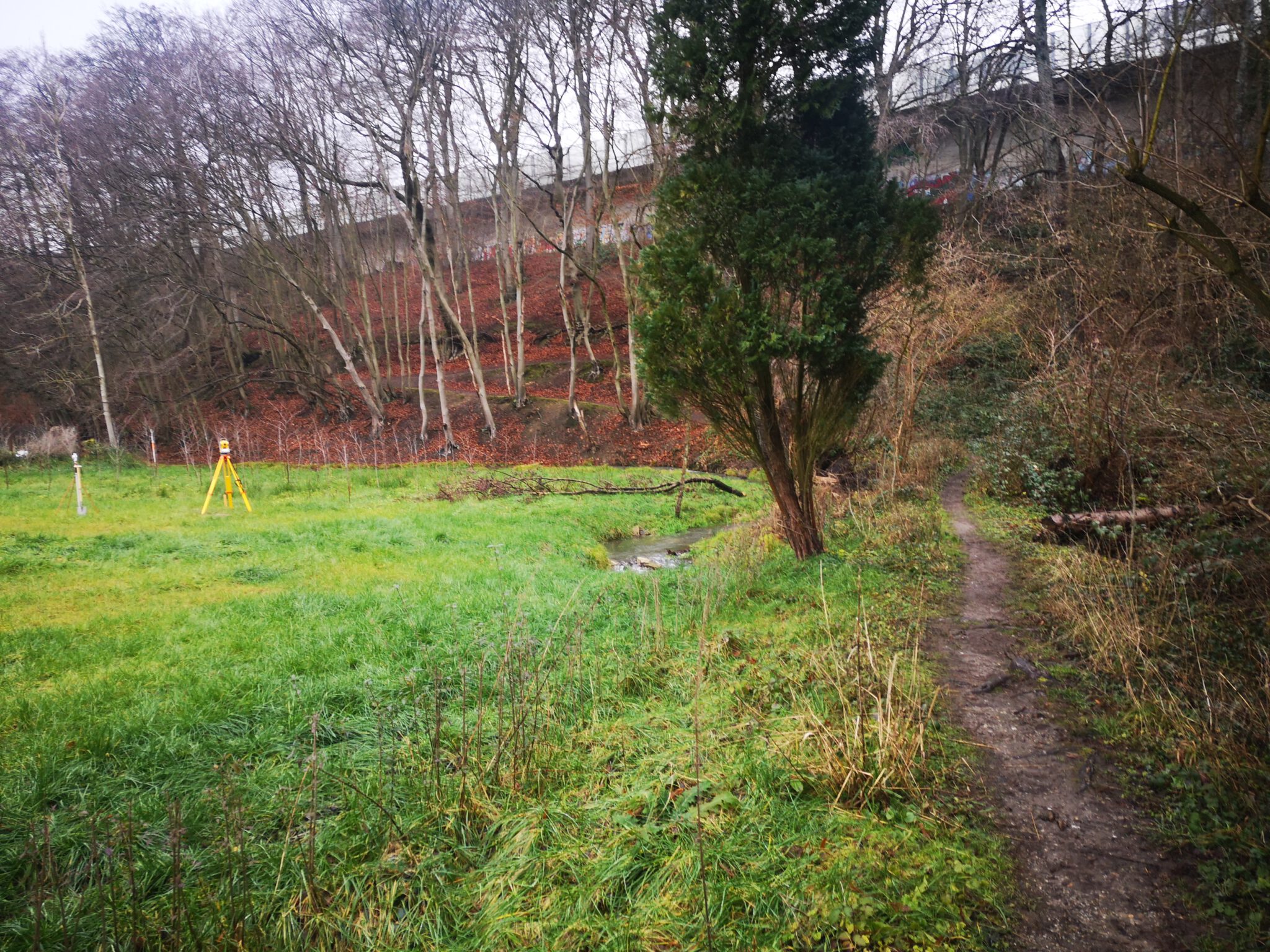Wir überqueren die Düssel, gelangen an den Hang der Autobahntrasse (hier ohne Stelzen). Der Weg am Hang wird breiter, verläuft flussaufwärts parallel zum Flussbett, scheint ein offizieller Wanderweg zu sein. Und es gibt auch einen Weg-Knick, der flussabwärts abzweigt.