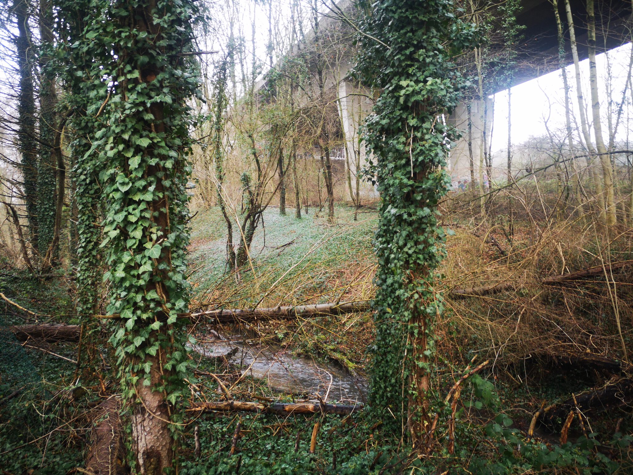 Parallel zum Ufer ist kein Durchkommen. Unzugängliches Gelände. Wir spazieren in knapp fünfzig Meter Entfernung, parallel zum Fluss, unter der Autobahnbrücke. In der Zwischenzeit hat die Düssel mehrere kleine und gar nicht so kleine Bäche aufgenommen, die bei Google Maps erneut namenlos bleiben. Auch hier fließt ihr ein weiterer zu.