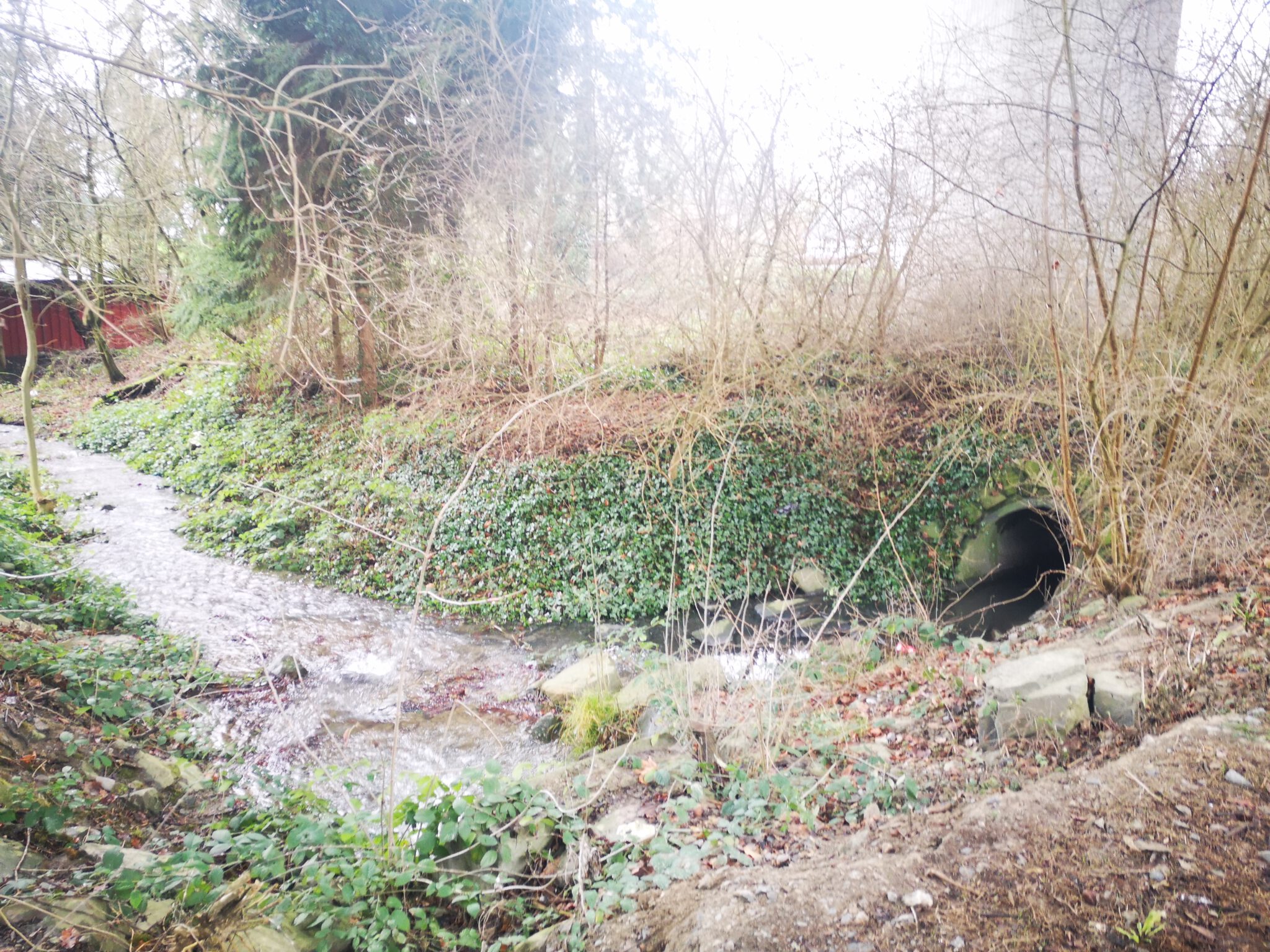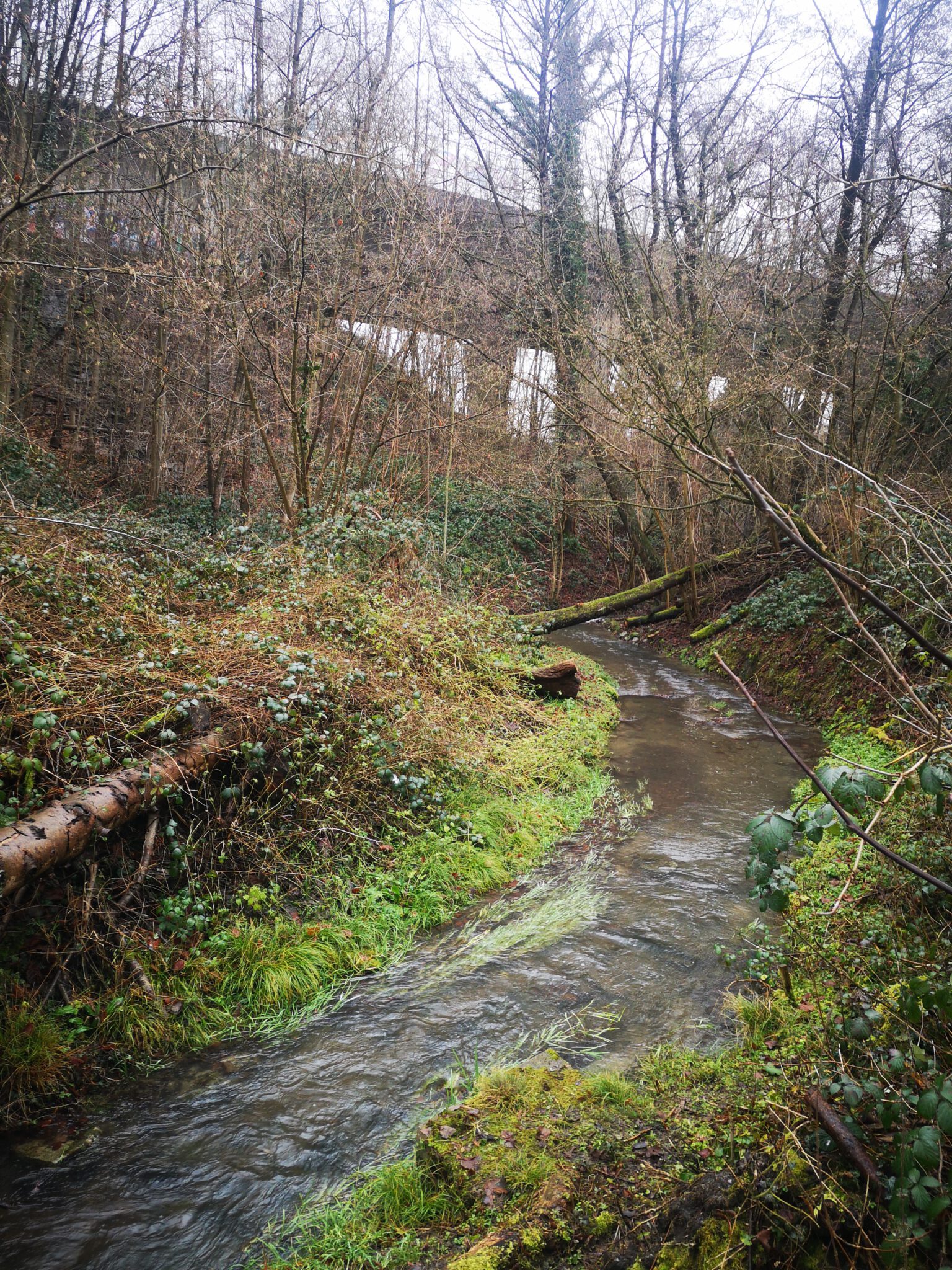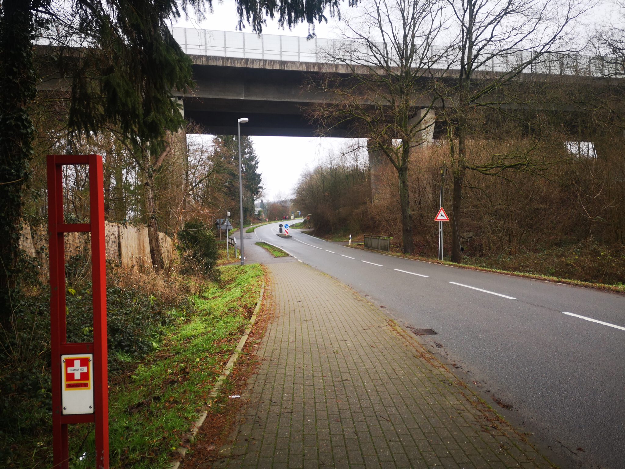 An der Ecke zur Landstraße schmilzt ein Rest Schnee, und unser Flüsschen ist nicht weit. Bevor wir es erreichen stoppen wir unter der A535, sind erneut Unter-der-Autobahn-Flaneure: Denn auf dem Weg von der Düssel-Mündung in den Rhein bis hierhin haben wir bereits am Werstener Kreuz die A46 und bei Erkrath die A3 unterquert.