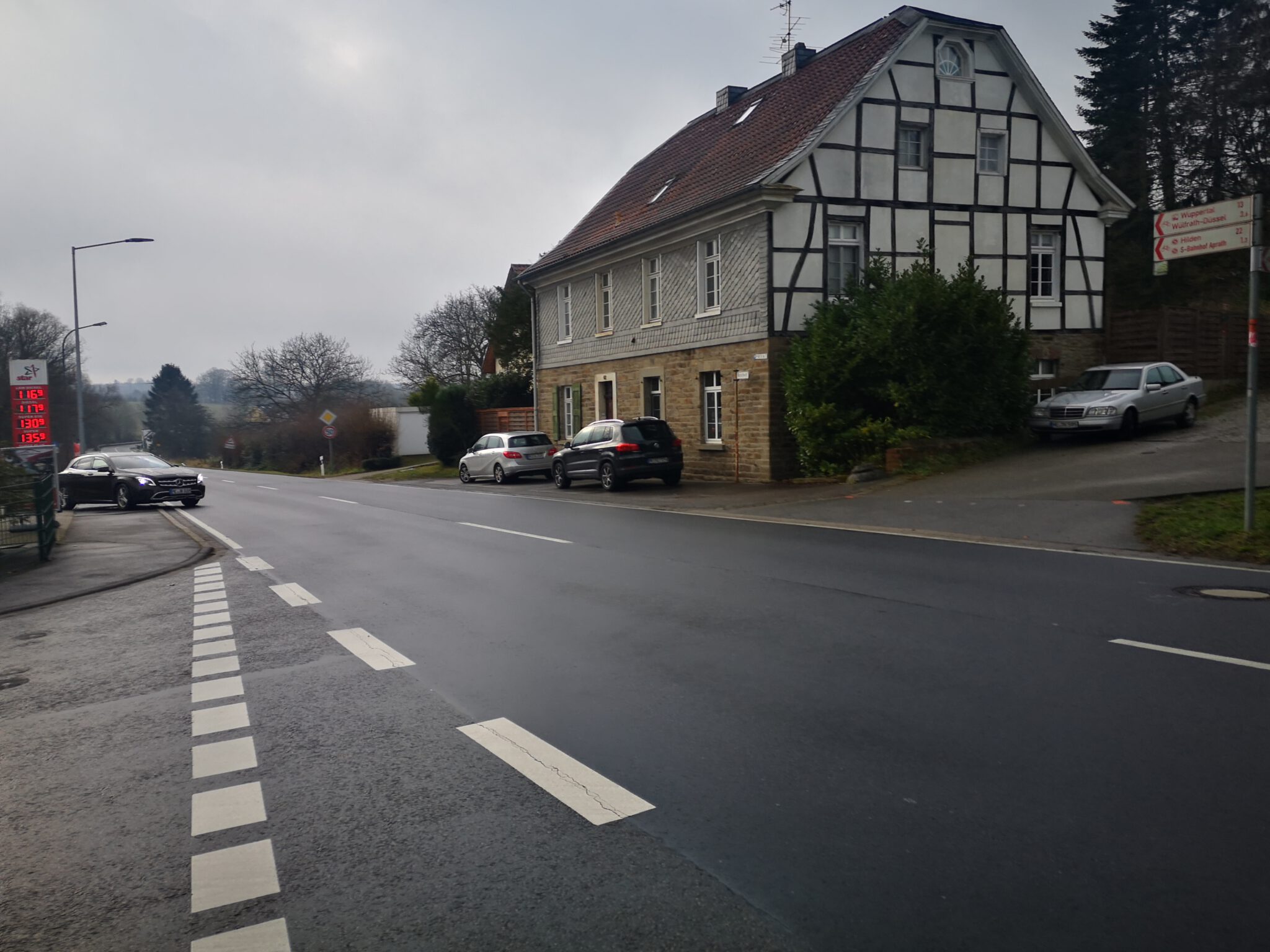 An der Star-Tankstelle halten wir kurz an, orientieren uns mit Google Maps. Hier beginnt eine kleine Siedlung, circa 50 Häuser. Vermutlich heißt sie so wie die Straße, Koxhof, und gehört offiziell zu Schlupkothen, was wiederum ein Ortsteil der Stadt Wülfrath ist. Radwechsel ab 20 Euro …