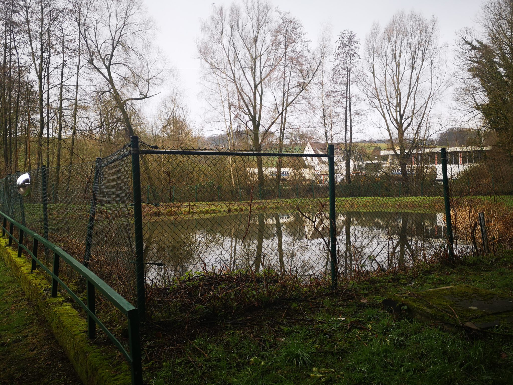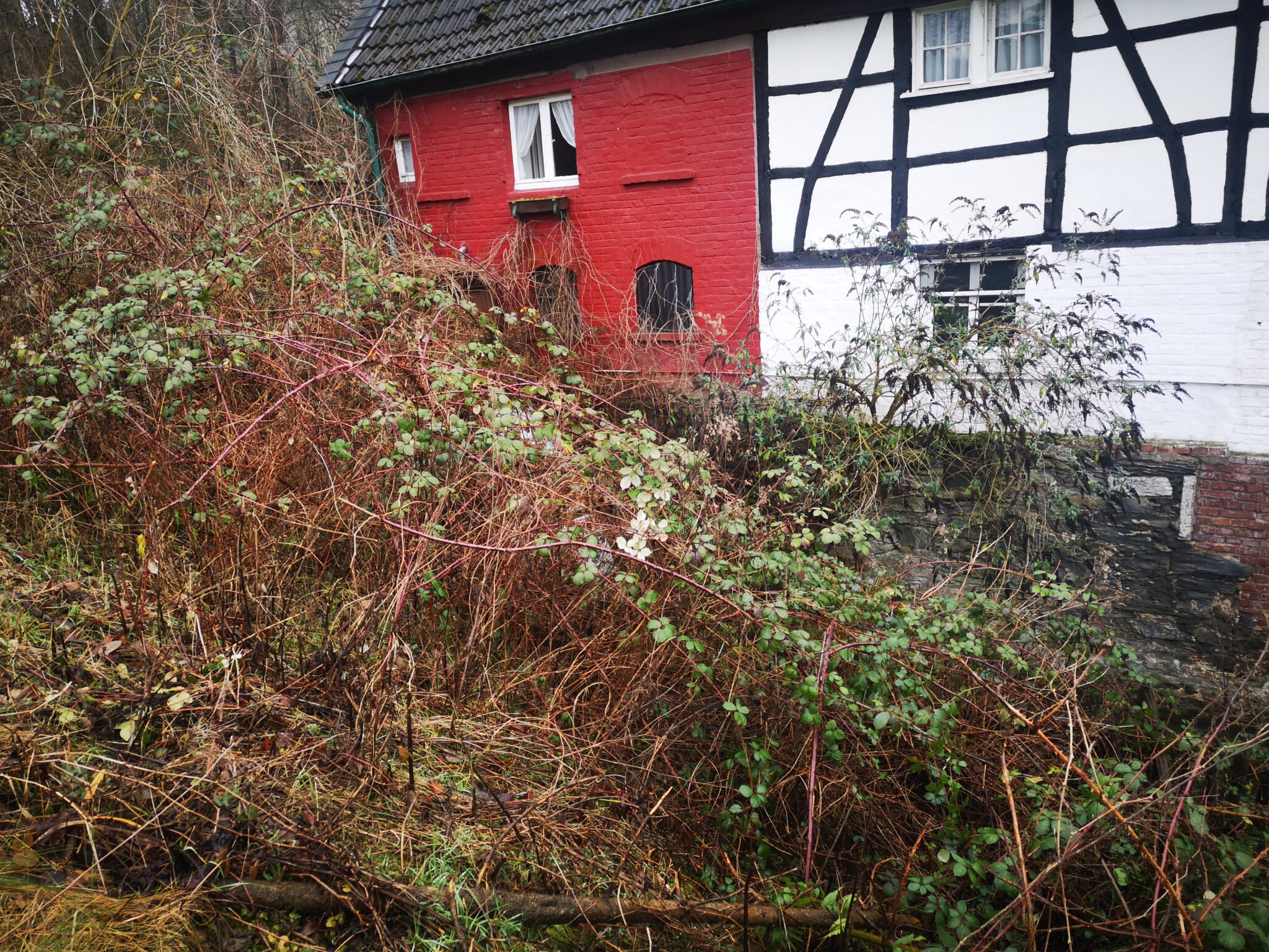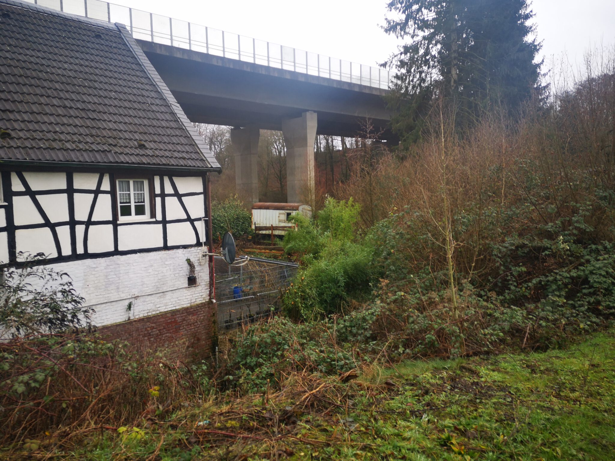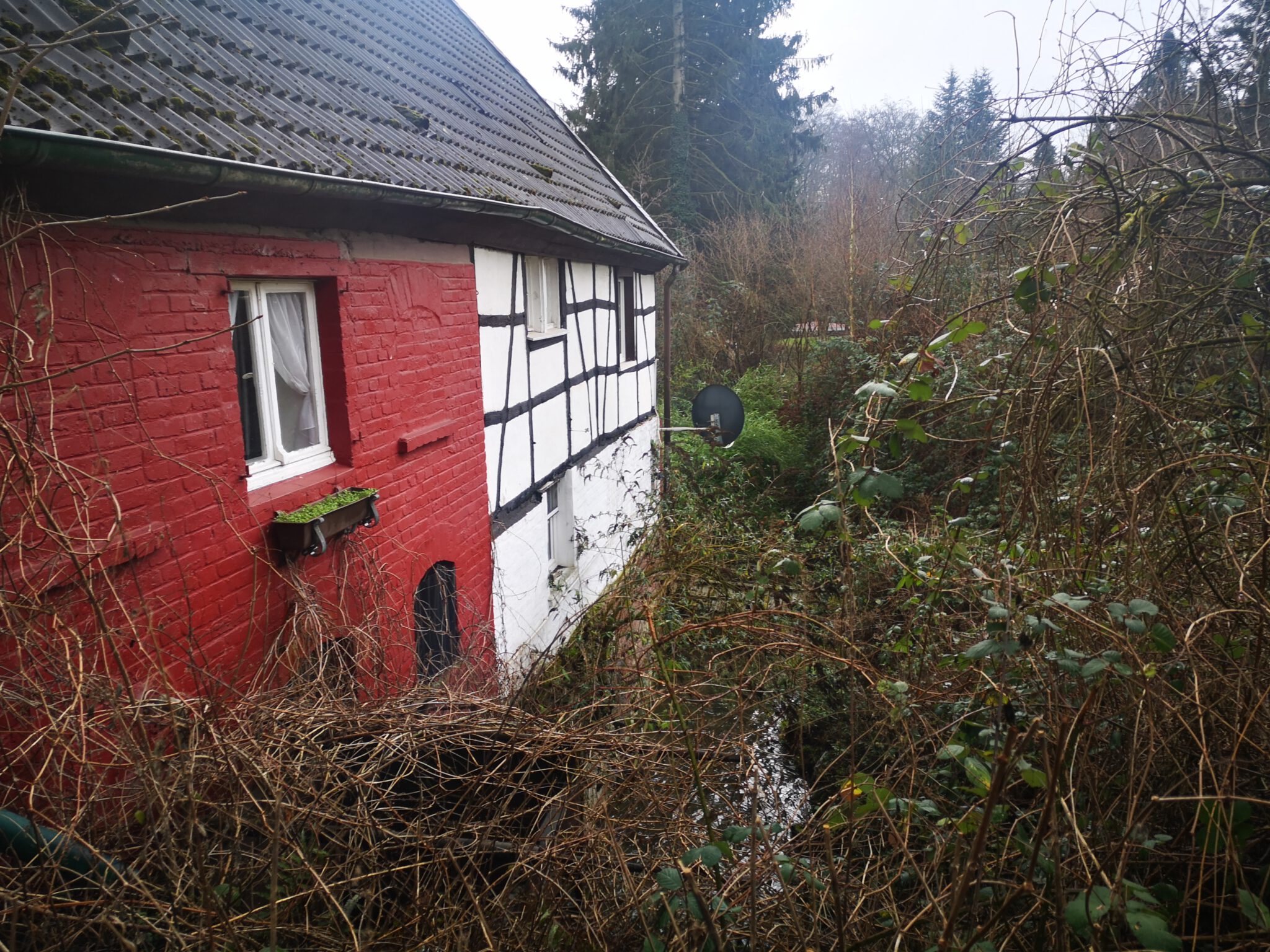 Wir erreichen einen asphaltierten Weg, der unter der Autobahn verläuft und halten uns Richtung Düssel, passieren einen maschendrahtzaunbegrenzten Teich. Und dann stehen wir an einem Fachwerkhaus von 1774, direkt am Ufer erbaut, und trotz Büschen und Gestrüpp erahnt man, dass das Gebäude früher als Mühle diente.