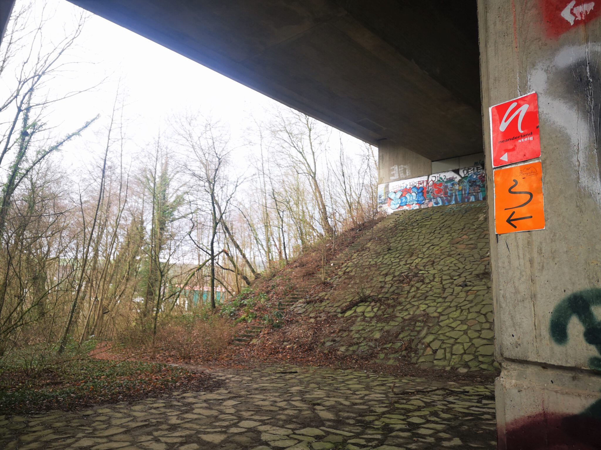 Etappenende unter der Autobahnbrücke. Da, wo wir anfangs den Street-Art-Elefanten fotografierten. Nun entdecken wir auch hier das Neanderlandsteig-Schild am Rande des Brückenpfeilers, nur etwa einen halben Meter vom Elefanten entfernt, das für einen ganz anderen Verlaufe der heutigen Etappe hätte sorgen können. Es ist kaum zu entdecken, verschwindet im rot-gelb-bunten Street-Art-Teppich.