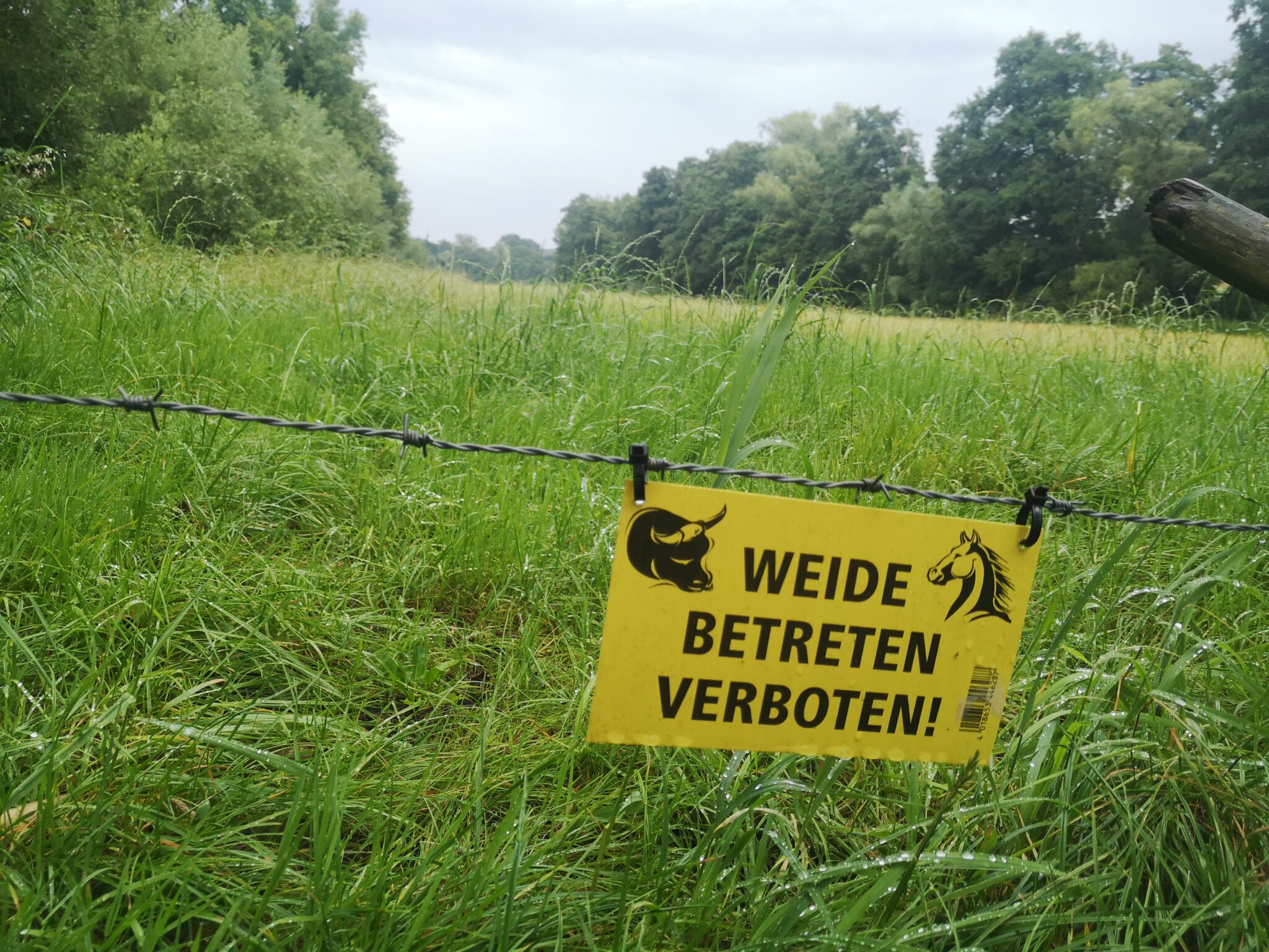 Schließlich erreichen wir das Ortausgangsschild. Wird natürlich fotografisch festgehalten so etwas. Wo sonst sieht man das Wort „Düssel“ so prägnant auf einem Schild. Die Düssel verläuft etwa fünfzig Meter von uns entfernt hinter der grünen Wiese, auf der eines dieser untersetzen Pferde grast, das – wir sind Pferde-Laien – ein wenig so aussieht, wie Louis de Funes mit langer Mähne und ganz viel Muskeln.