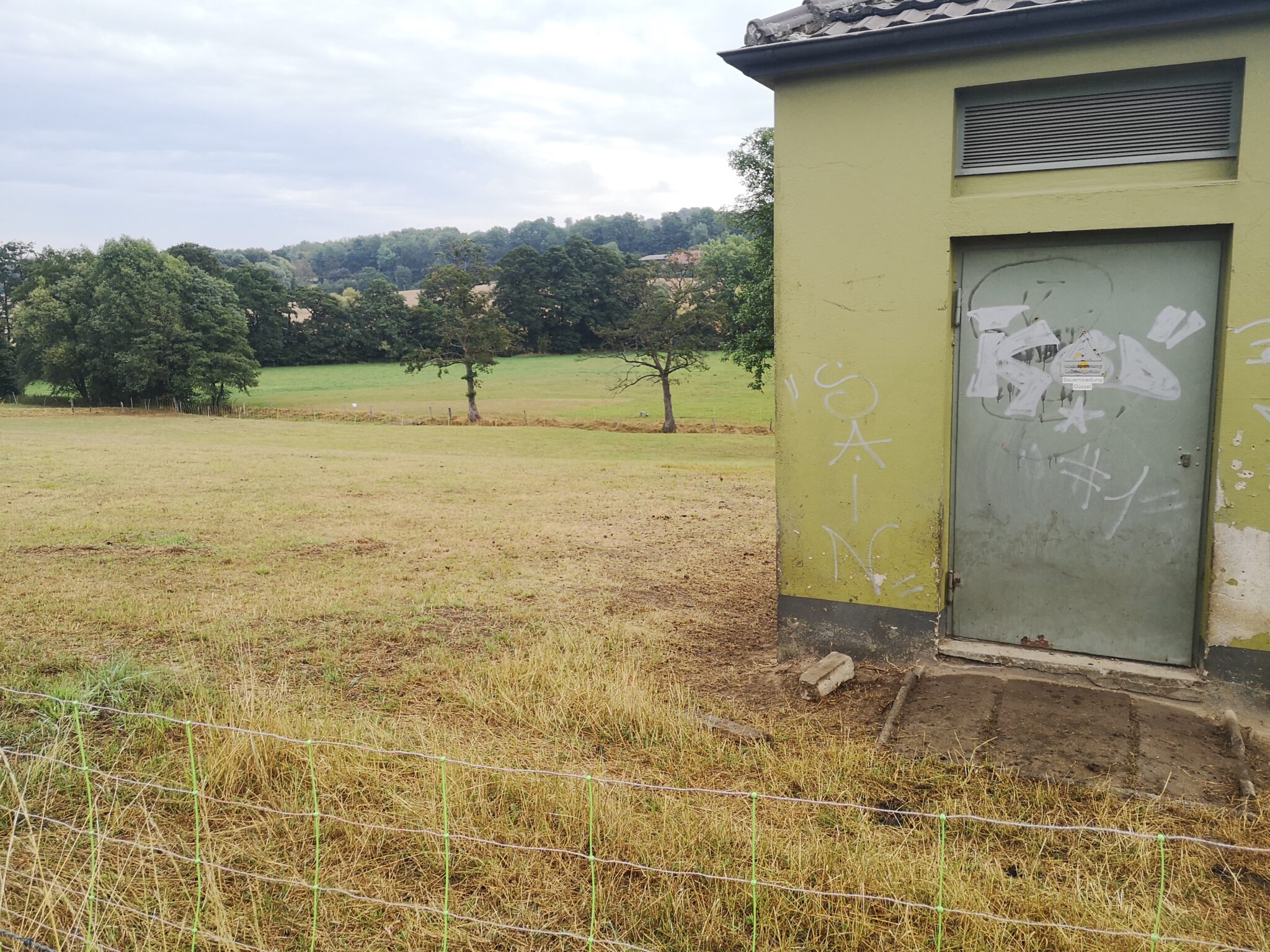 Mein Begleiter fotografiert noch schnell einen weiteren Aufkleber, wieder ist er grün, aber diesmal weist er auf „Vacation Records“ hin, und eine Smartphone-Sofort-Recherche ergibt, dass es sich um einen Plattenladen im nahen Wuppertal handelt. An eben dieser Stelle ändert die omnipräsente Dorfstraße endlich ihren Namen: Düsseler Feld heißt sie fortan, und auch dieser Name ist treffend. Ein aphaltierter Feldweg eben. Links: Feld, dezent ansteigend. Rechts Feld: dezent abfallend. Im „Tal“ ist ein Bachbett zu erkennen, und Google Maps verrät uns, dass die von Bäumen und Sträuchern gesäumte Düssel auf der von Schafen begrasten Wiese zweigeteilt verläuft. Näher zu uns und zum Weg der „schmalere“ Düssel-Arm, etwas weiter entfernt der „breitere“.