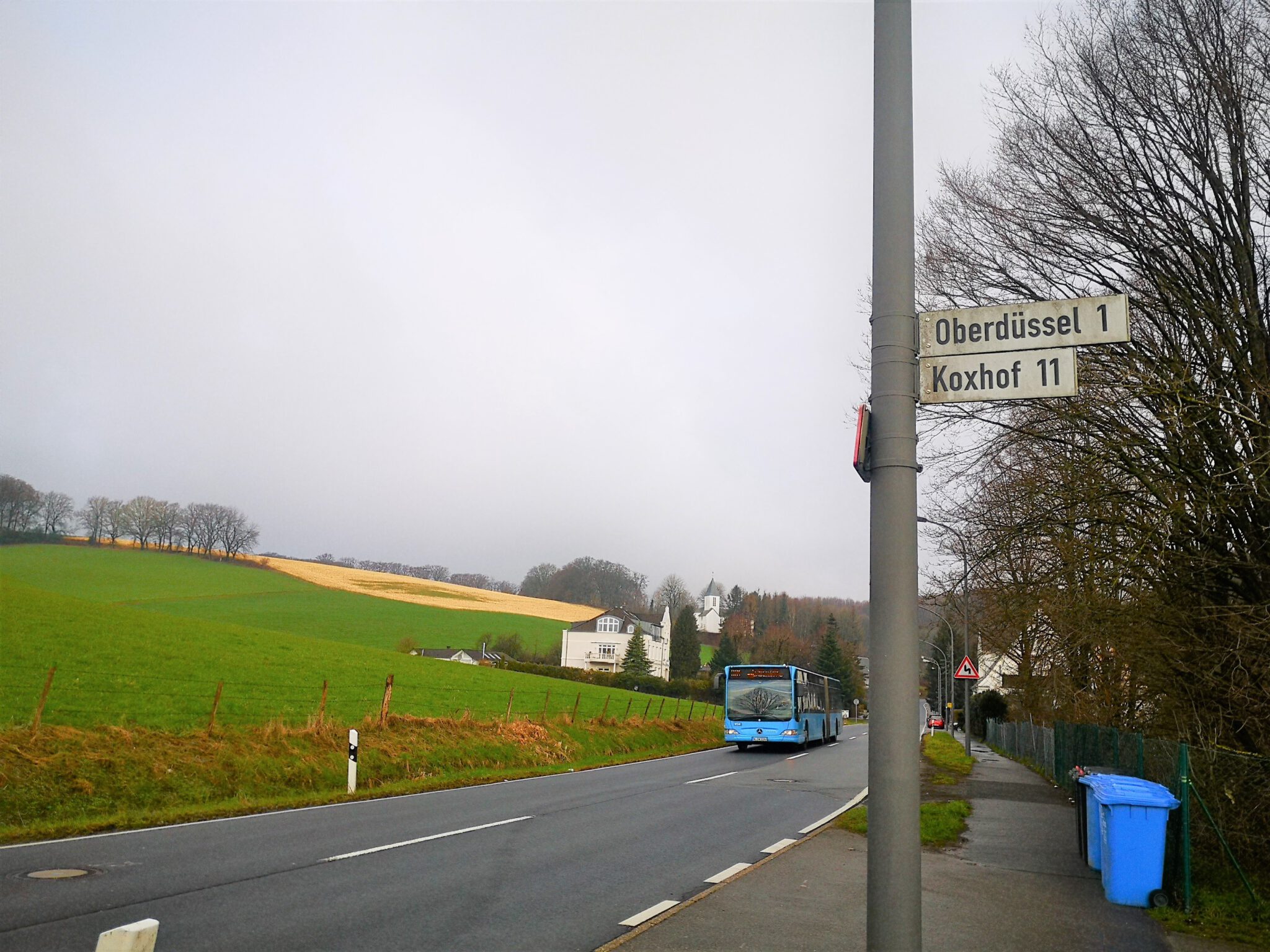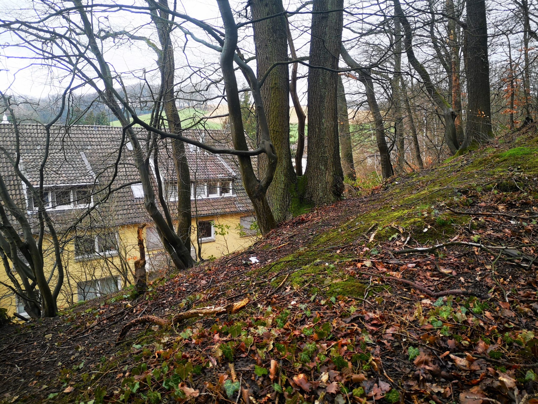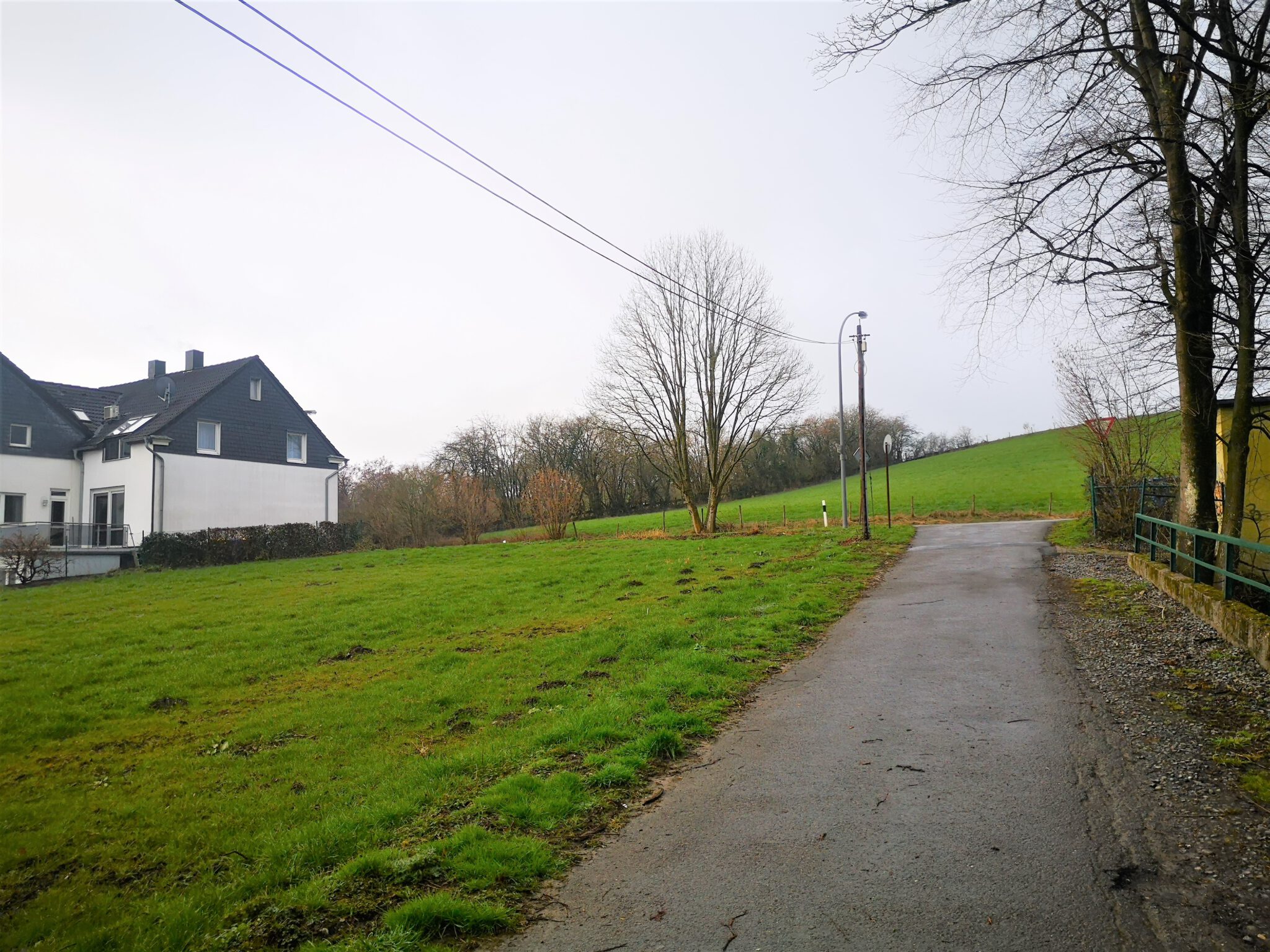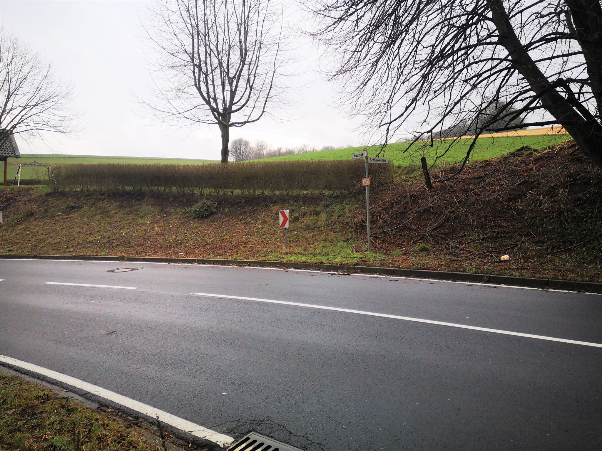 Schließlich noch eine Entdeckung: Bei unserem ersten Besuch hier fielen uns zwei Männer auf, die auf einer von der Düssel flankierten Wiese Messungen durchführten. Jetzt wissen wir, warum: Auf einer Hauswand prangt ein Werbeplakat für das offenbar bald auf eben dieser Wiese entstehende Neubauprojekt „Gut Koxhof“. Motto: „Ihr Wohnraum in den Düssel-Auen“.