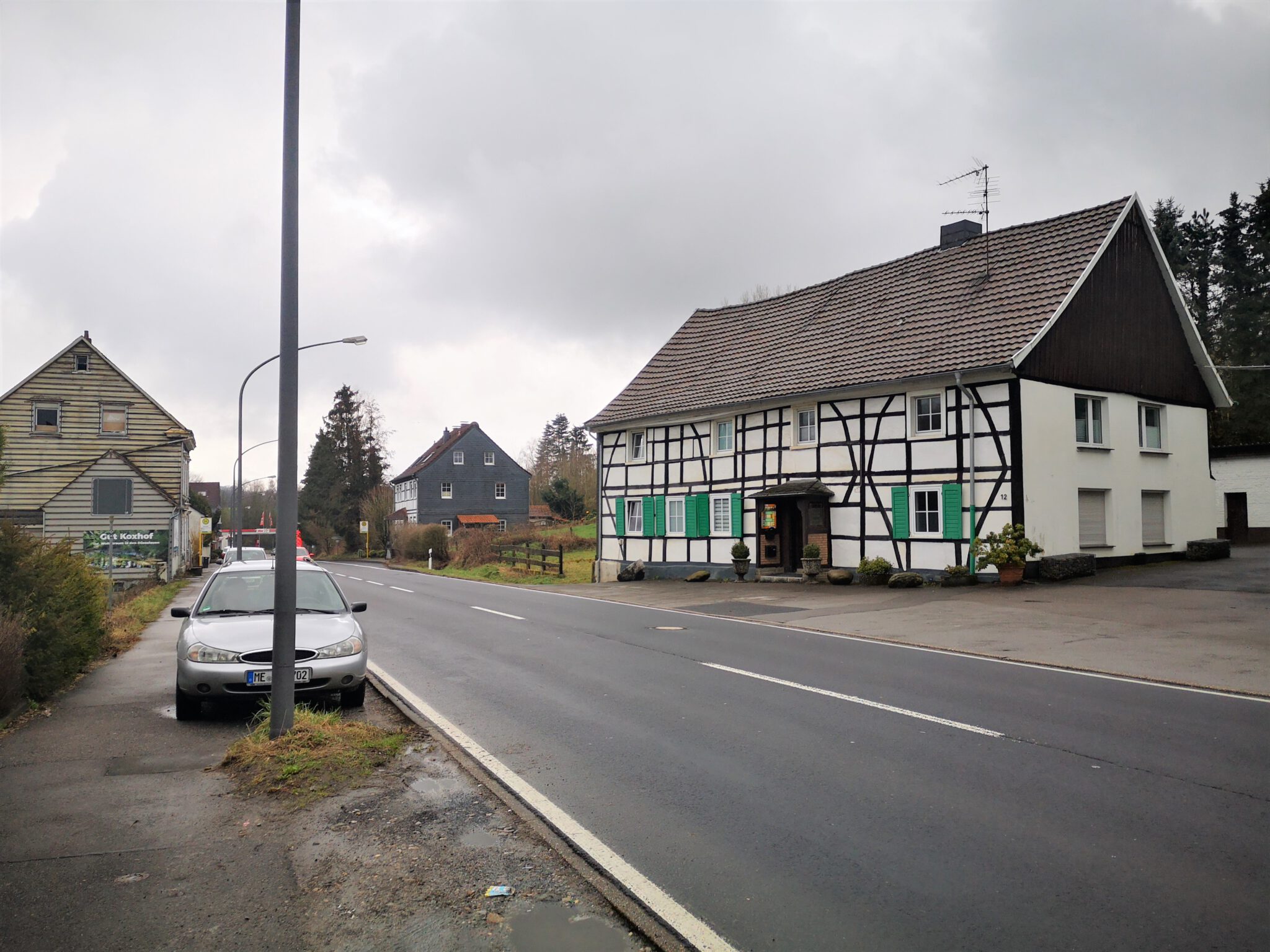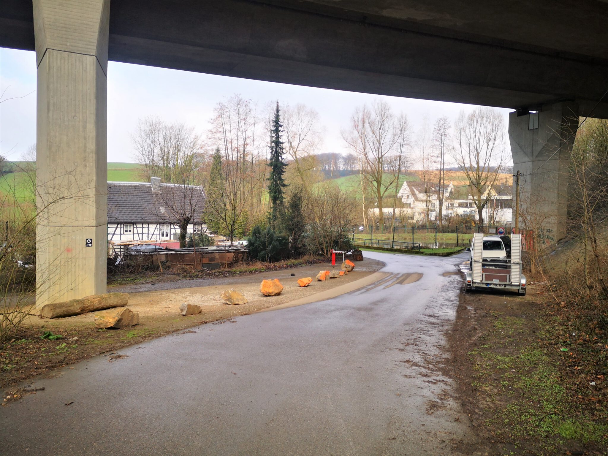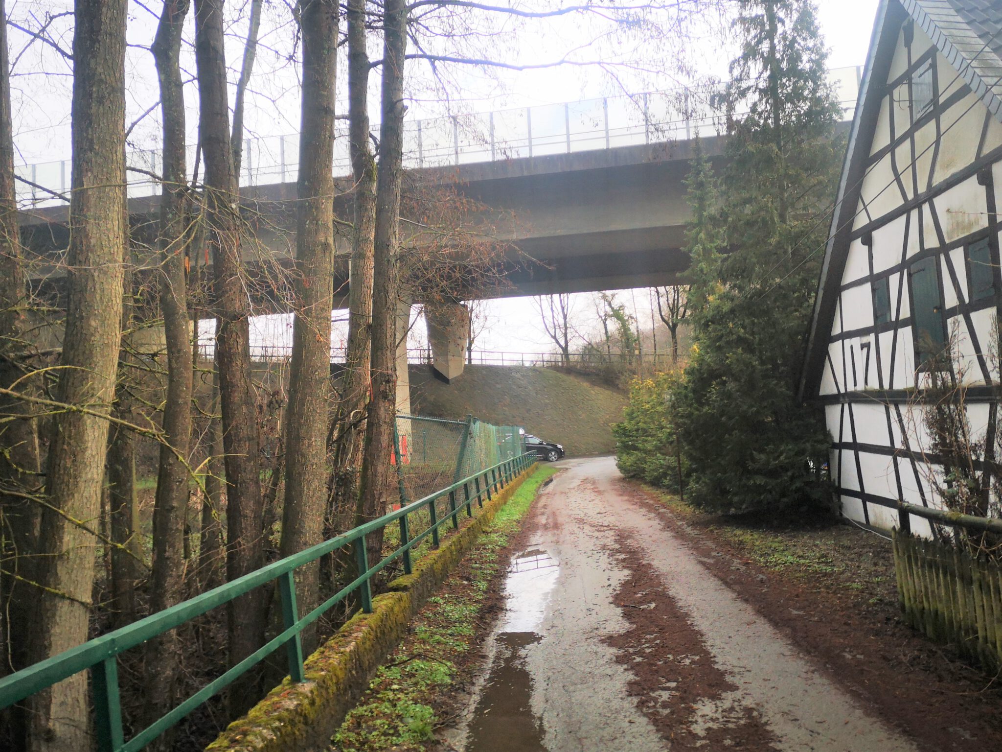 Das kleine Fachwerkhaus unter der großen Autobahnbrücke: So geht es los, nicht mal 1000 Meter Luftlinie von dem Ort entfernt, den wir 2014 als Ziel auserkoren haben. Im Jahr 2021 werden wir die Düssel-Quelle ganz sicher erreichen – heute allerdings noch nicht. Vielleicht werden mein bester Freund P. und ich den „Endspurt“ sogar in zwei bis drei weitere Episoden aufspalten. Dieses Blog hat keine Eile. Wobei: Irgendwie schon. Manchmal und ein Bisschen. Nämlich, wenn wir – wie gerade – maximal eine Stunde Zeit haben für unsere Blog-Ausflüge.