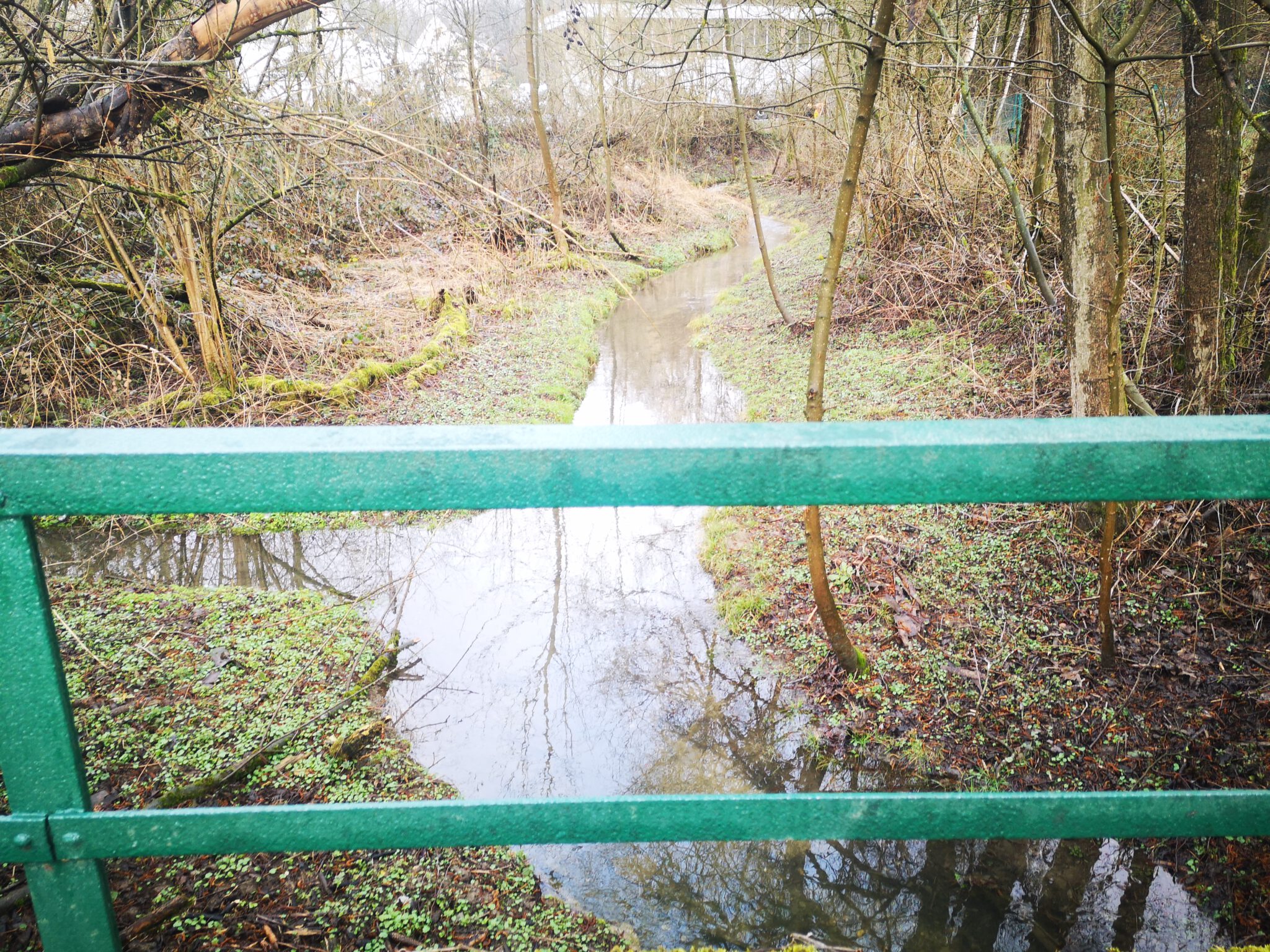 Wir biegen also von der Koxhof genannten Landstraße, wo wir geparkt haben, in einen namenlosen asphaltierten Weg ein. Vor uns das Fachwerkhäuschen aus dem Jahr 1774 direkt am Düssel-Ufer: Das ist die ehemalige Mühle, an der wir bei unserer vorhergehenden Etappe umkehrten und deren Namen wir inzwischen recherchiert haben: Stippelsmühle. Tatsächlich handelte es sich um die erste Mühle am Düssel-Lauf auf dem Weg Richtung Rhein. Die Düssel kreuzt den Weg, verschwindet danach flussaufwärts in einem nicht begehbaren grünen Dickicht – moosgesäumt. Auf Google Maps haben wir bereits geplant, wie wir unserem Flüsschen folgen können: Vorbei am Mühlenteich zur Linken, unter den Autobahnstelzen hindurch. Auf der anderen Seite der Autobahn verläuft eine Panorama-Radweg-Trasse. Die müssen wir erreichen.