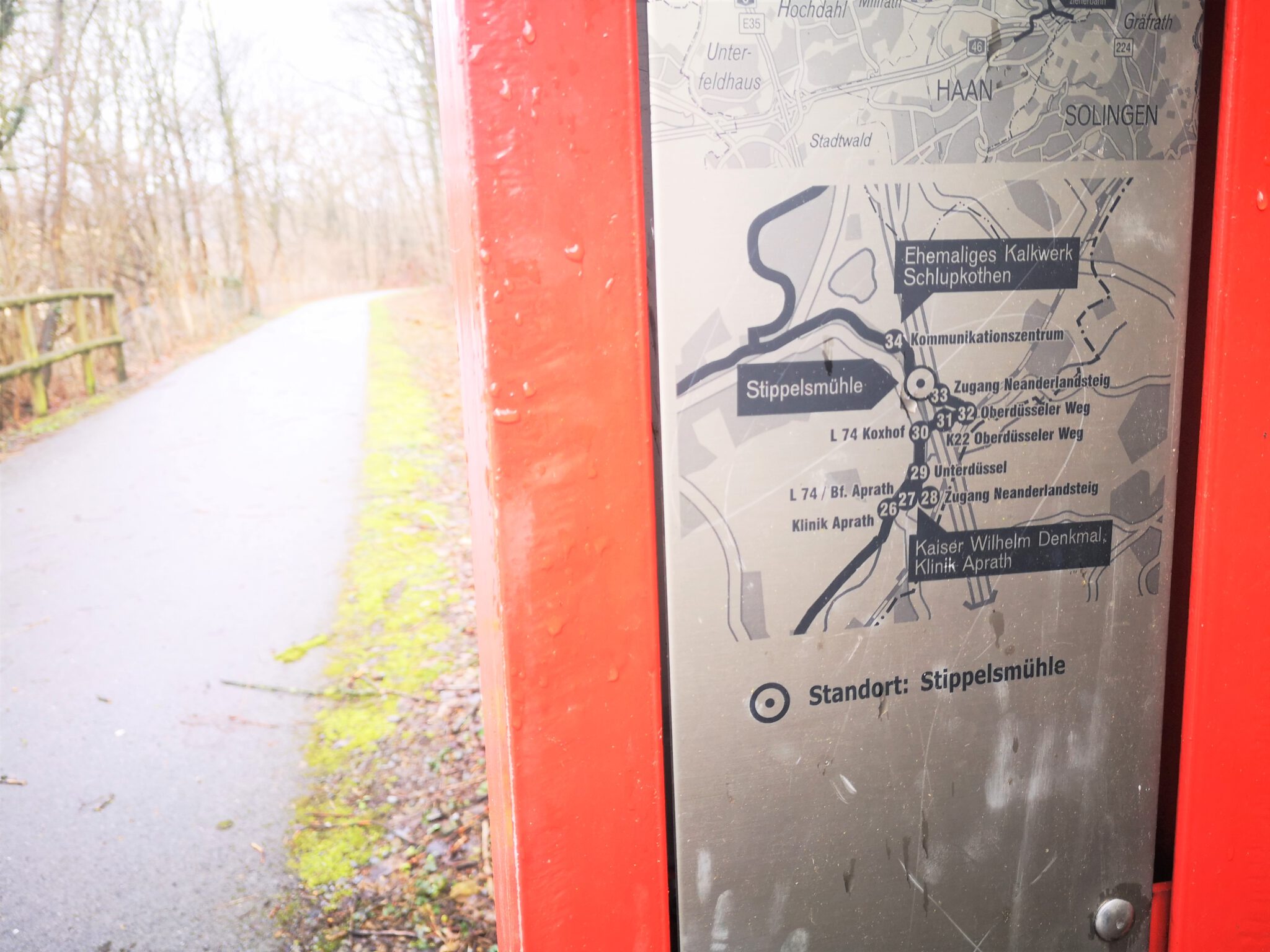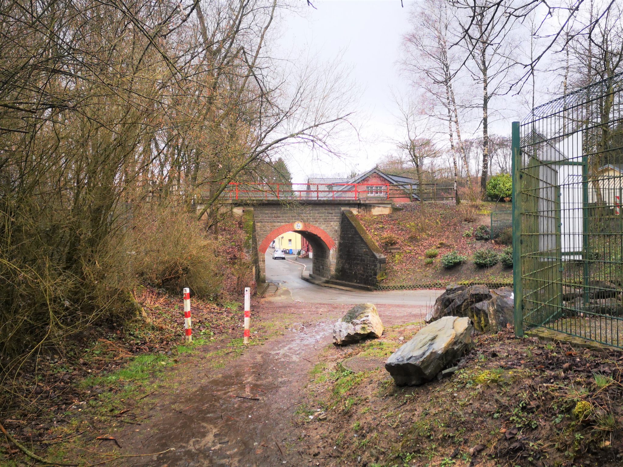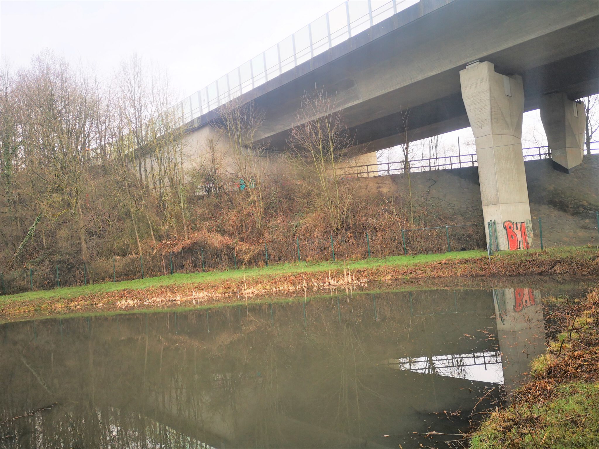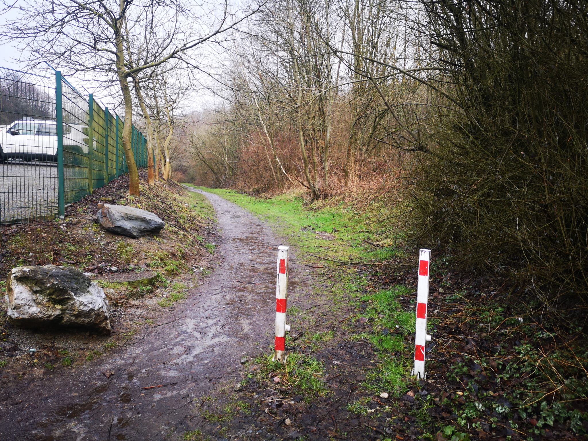 Wir durchqueren das Gelände: Wo ist die Düssel? Wir finden sie wieder. Sie verläuft zwischen dem Ex-Kalkwerk und der A535 durch den Wald. Wir folgen ihr über einen durch rotweiße Pöller markierten Pfad. Gegen Ende des durch einen Zaun vom Weg getrennten Kalkwerk-Geländes rückt die Düssel näher heran. Ein paar Fotos – und dann der Entschluss: Das war´s für heute, zurück zum Auto, allerdings über die Landstraße.