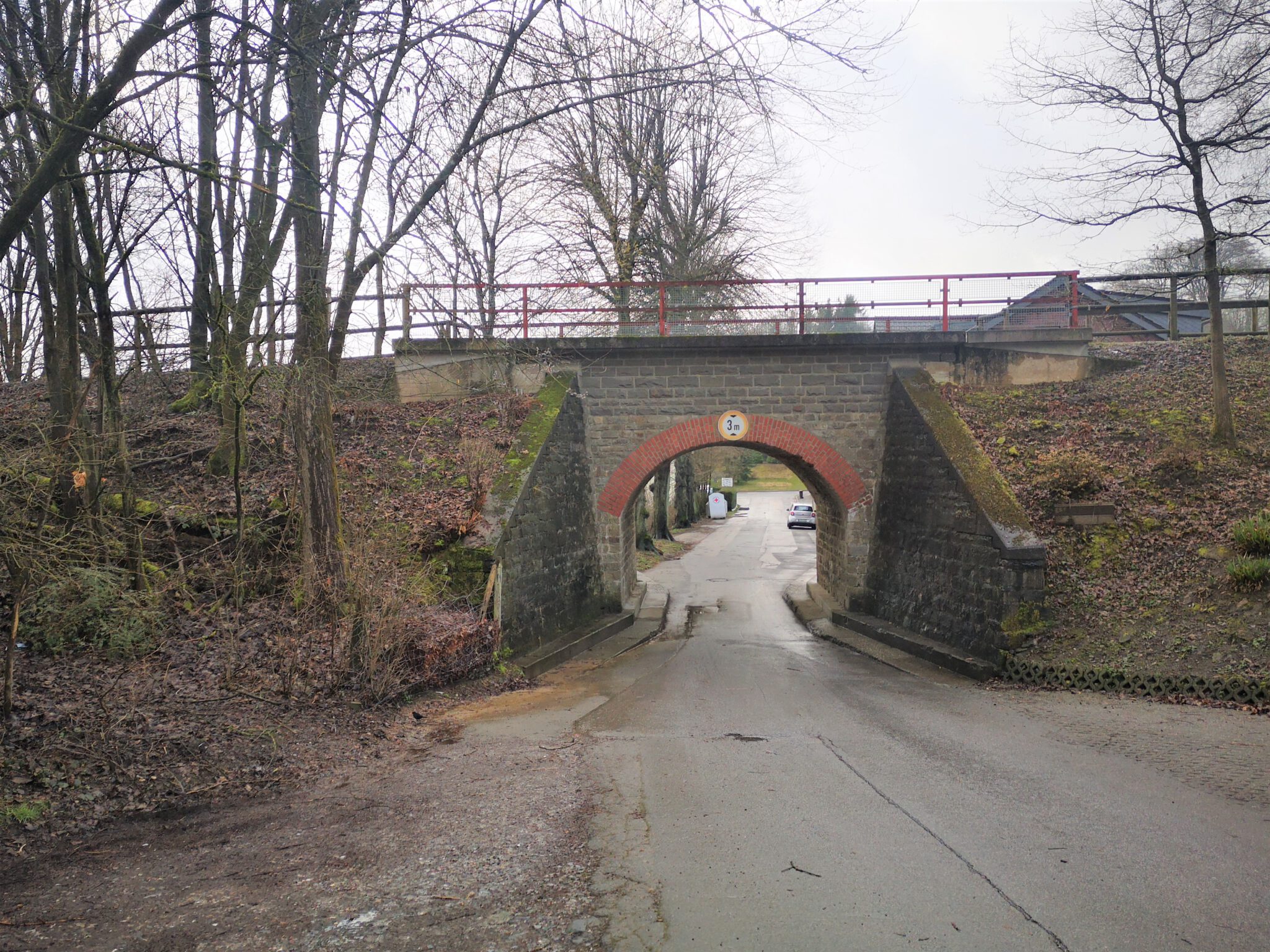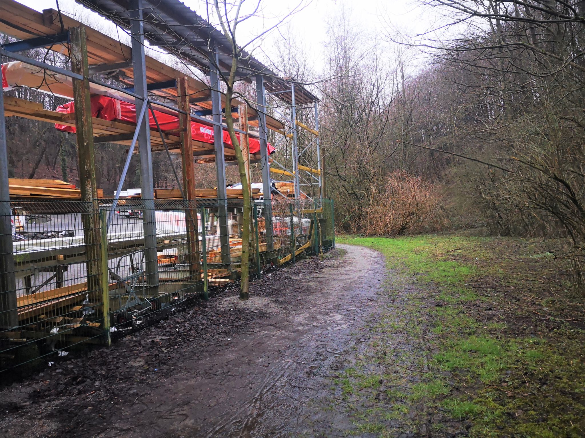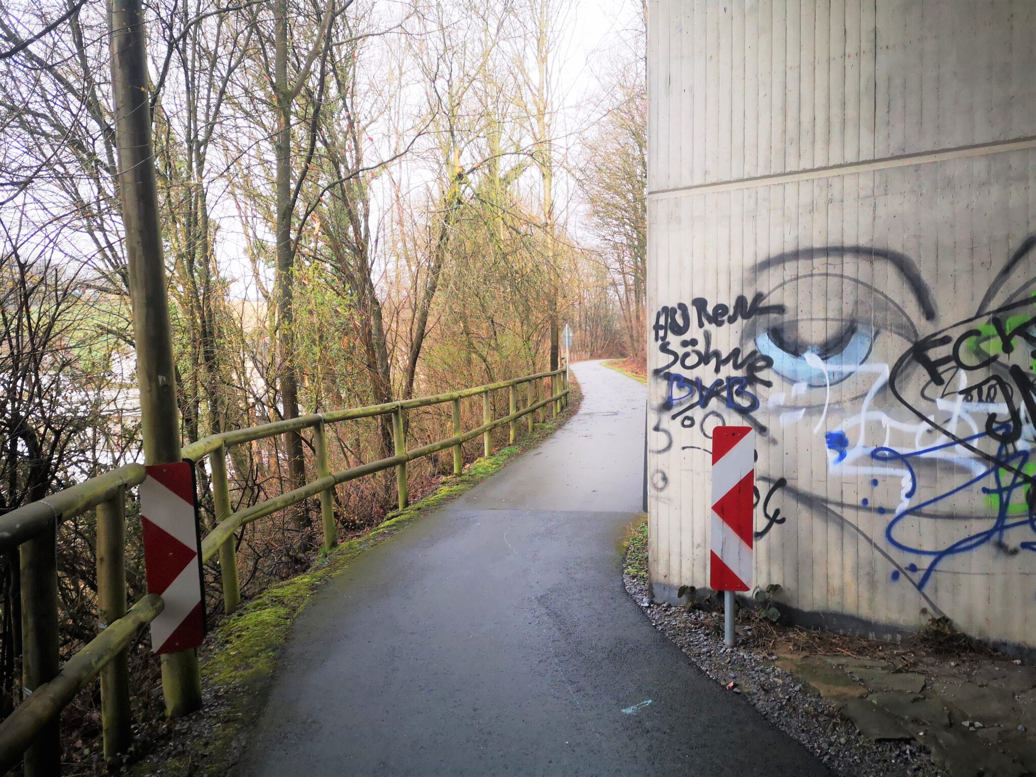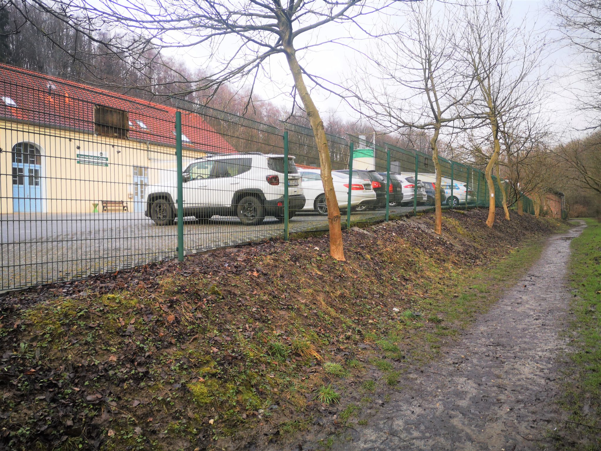 Wir durchqueren das Gelände: Wo ist die Düssel? Wir finden sie wieder. Sie verläuft zwischen dem Ex-Kalkwerk und der A535 durch den Wald. Wir folgen ihr über einen durch rotweiße Pöller markierten Pfad. Gegen Ende des durch einen Zaun vom Weg getrennten Kalkwerk-Geländes rückt die Düssel näher heran. Ein paar Fotos – und dann der Entschluss: Das war´s für heute, zurück zum Auto, allerdings über die Landstraße.