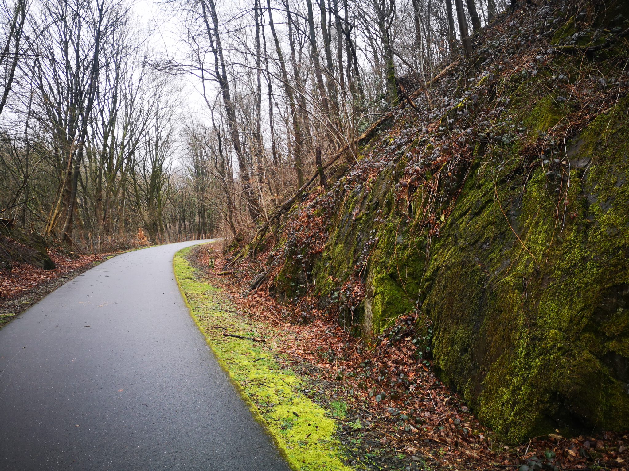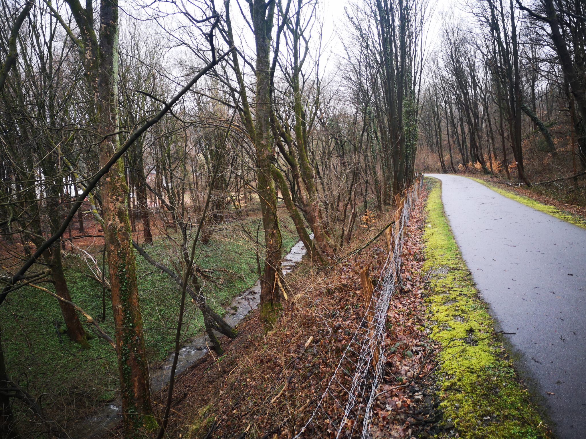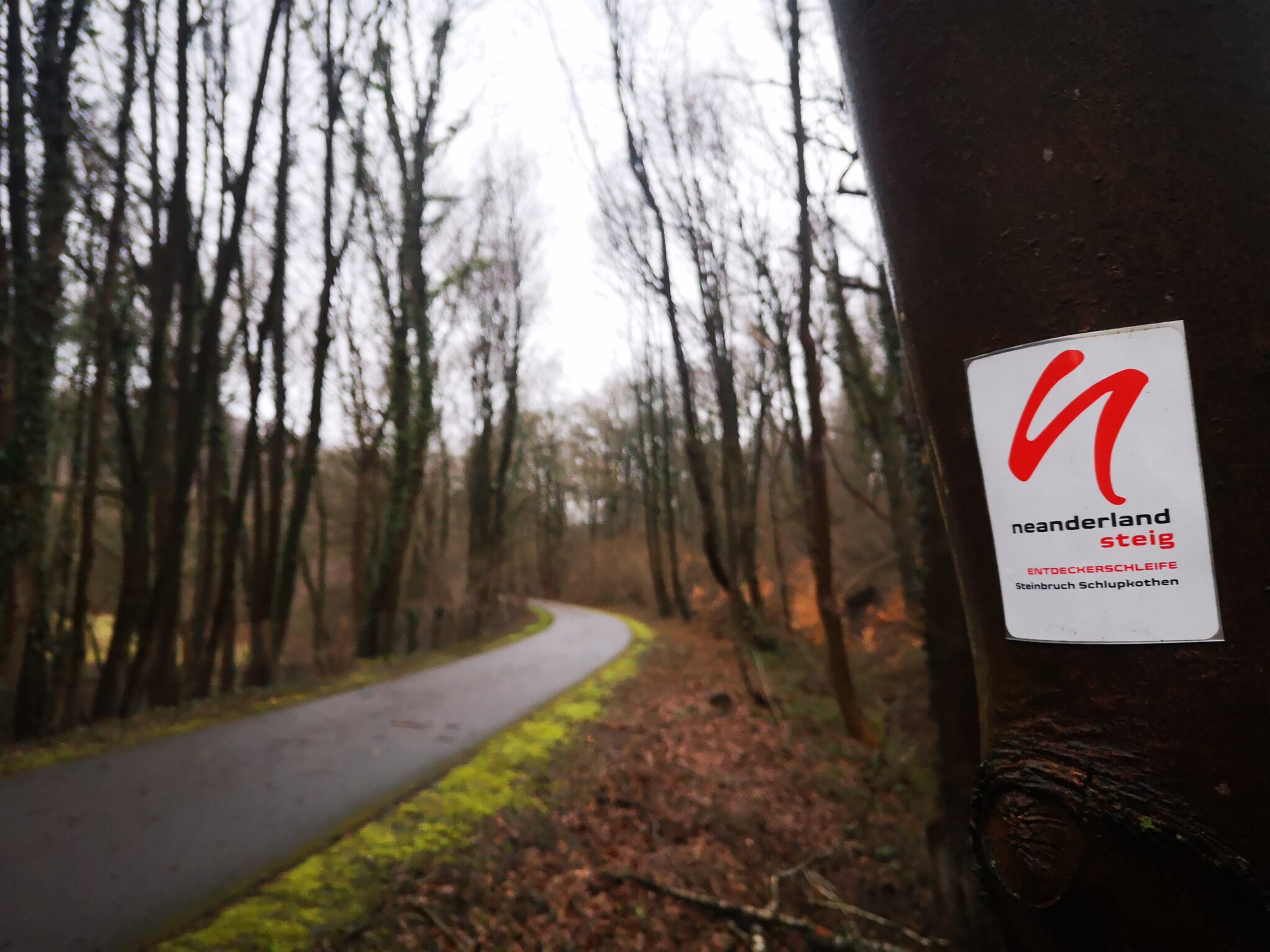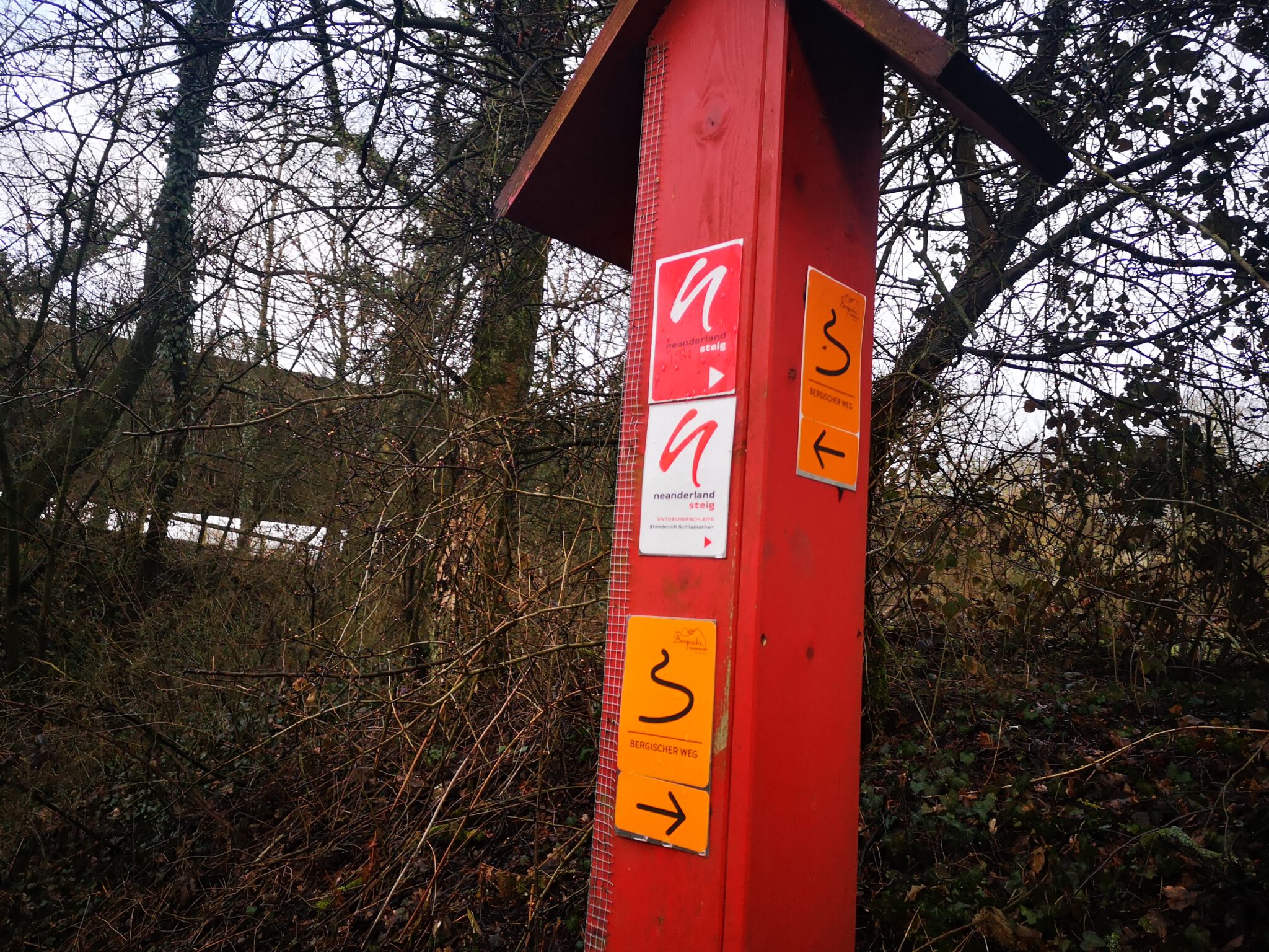 Wir durchqueren das Gelände: Wo ist die Düssel? Wir finden sie wieder. Sie verläuft zwischen dem Ex-Kalkwerk und der A535 durch den Wald. Wir folgen ihr über einen durch rotweiße Pöller markierten Pfad. Gegen Ende des durch einen Zaun vom Weg getrennten Kalkwerk-Geländes rückt die Düssel näher heran. Ein paar Fotos – und dann der Entschluss: Das war´s für heute, zurück zum Auto, allerdings über die Landstraße.