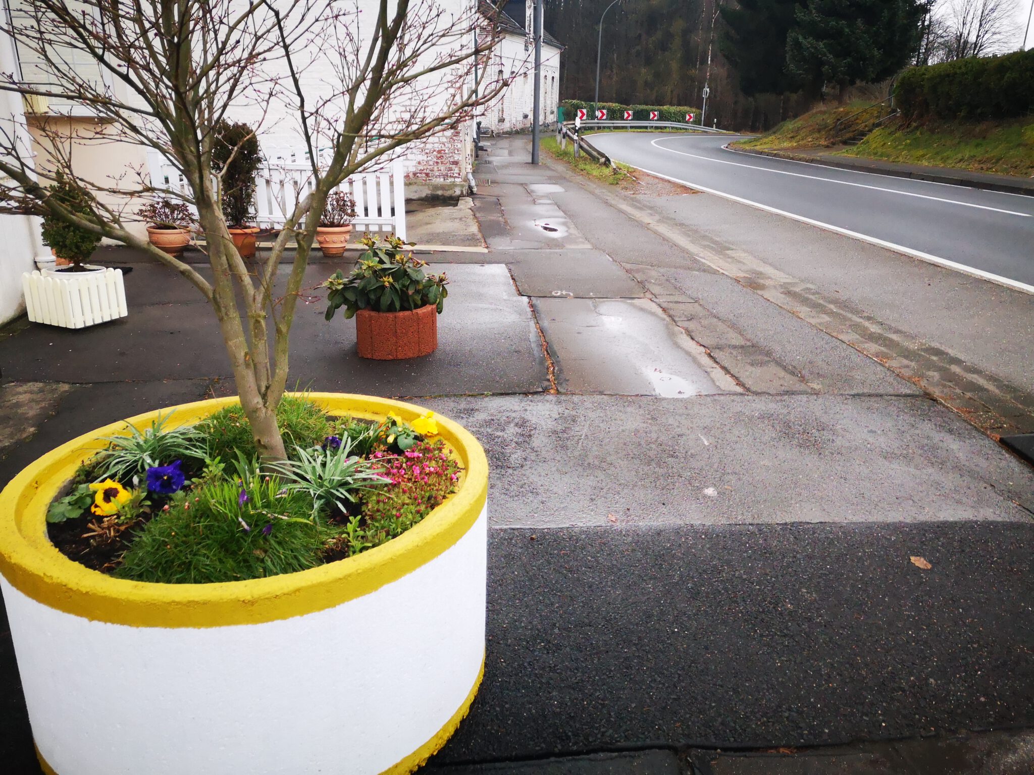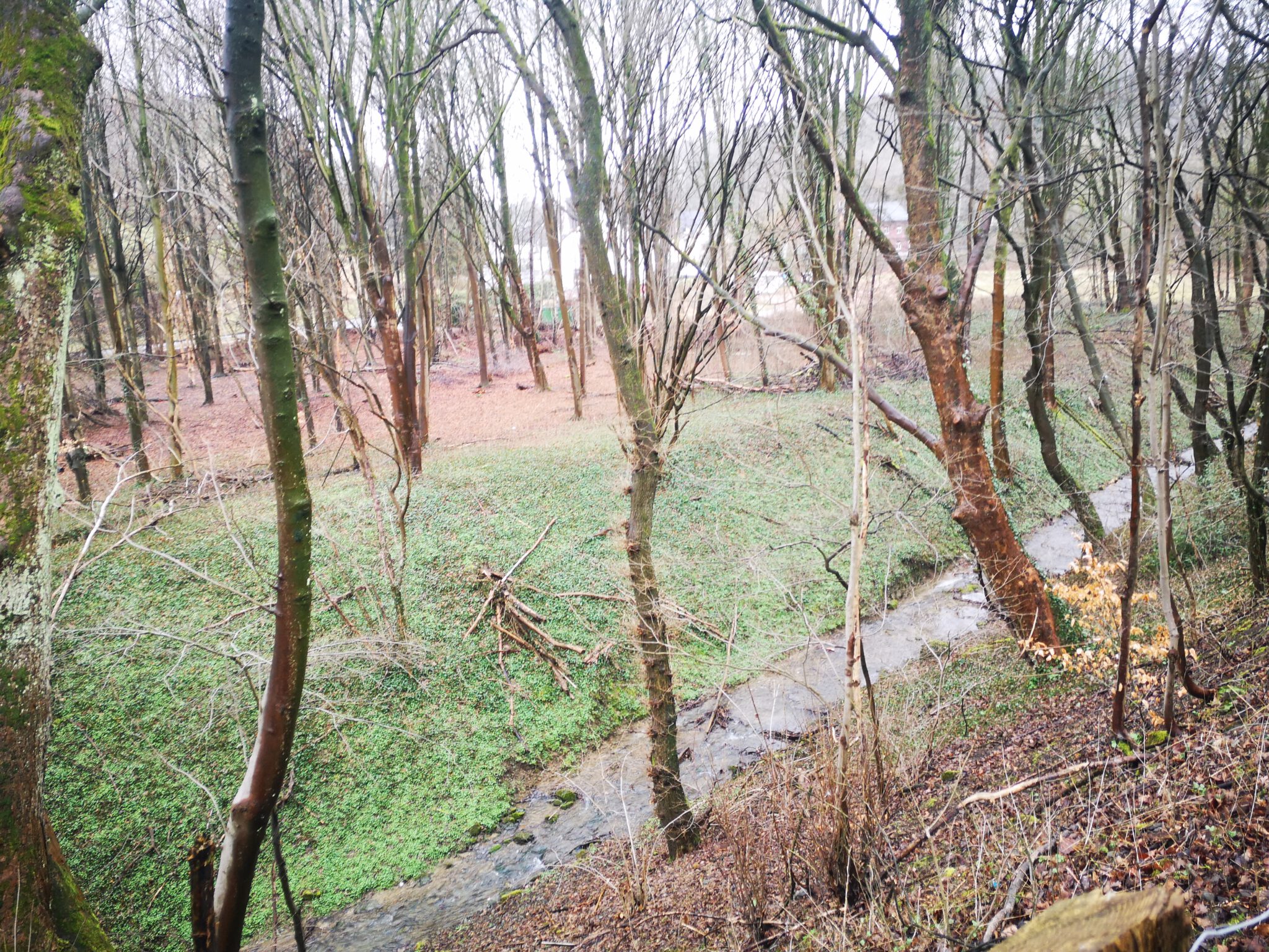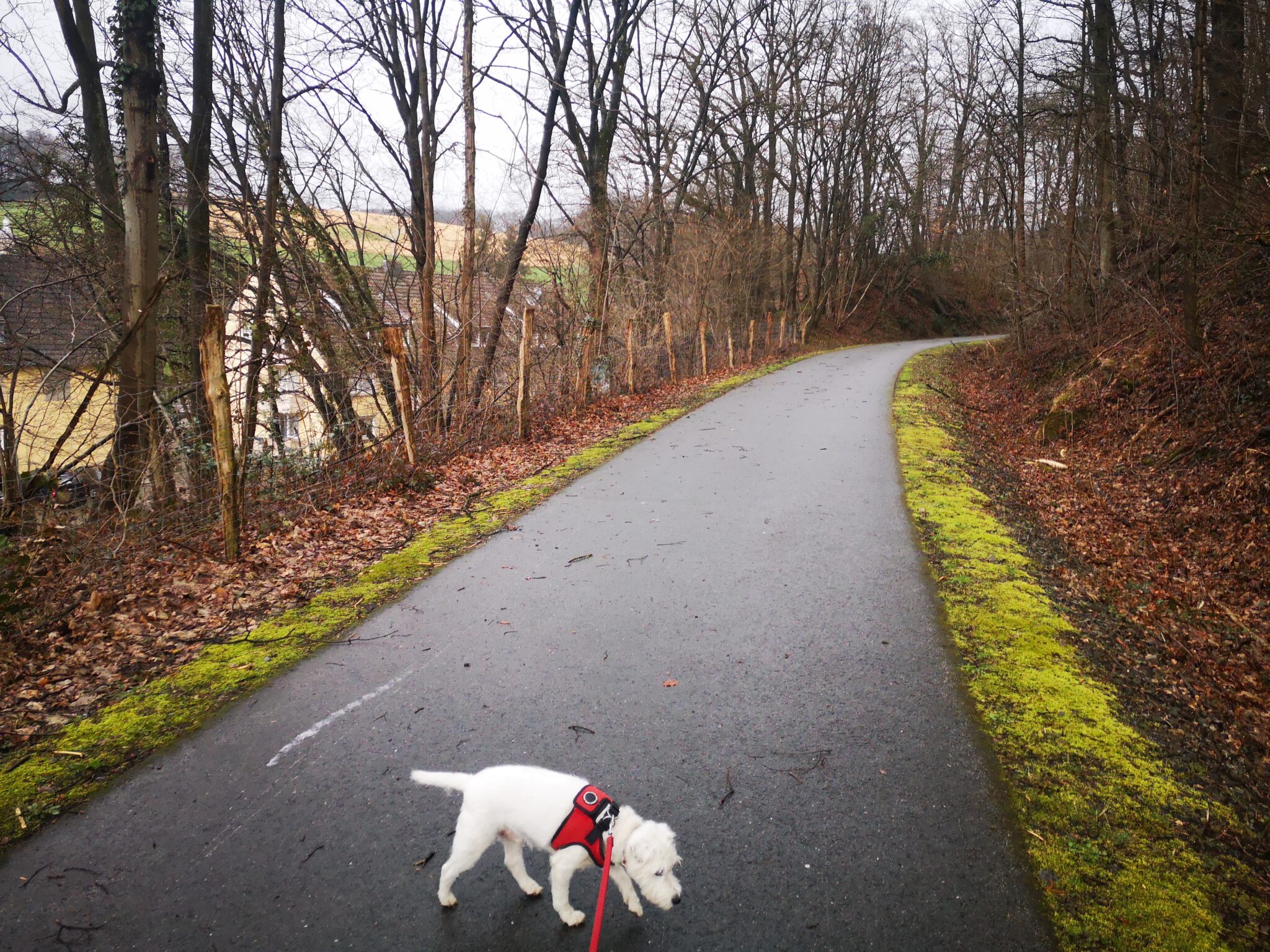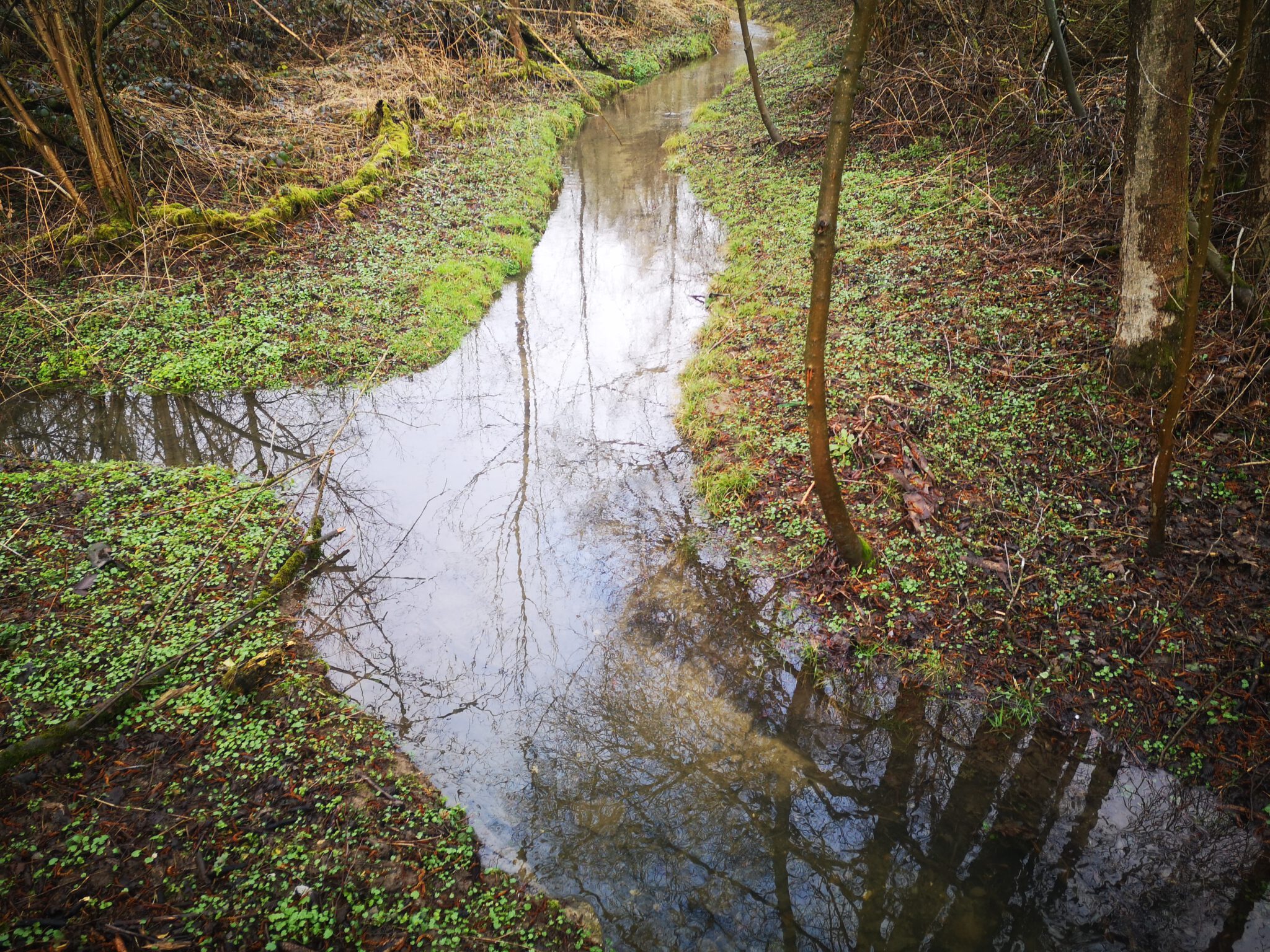 Wir durchqueren das Gelände: Wo ist die Düssel? Wir finden sie wieder. Sie verläuft zwischen dem Ex-Kalkwerk und der A535 durch den Wald. Wir folgen ihr über einen durch rotweiße Pöller markierten Pfad. Gegen Ende des durch einen Zaun vom Weg getrennten Kalkwerk-Geländes rückt die Düssel näher heran. Ein paar Fotos – und dann der Entschluss: Das war´s für heute, zurück zum Auto, allerdings über die Landstraße.