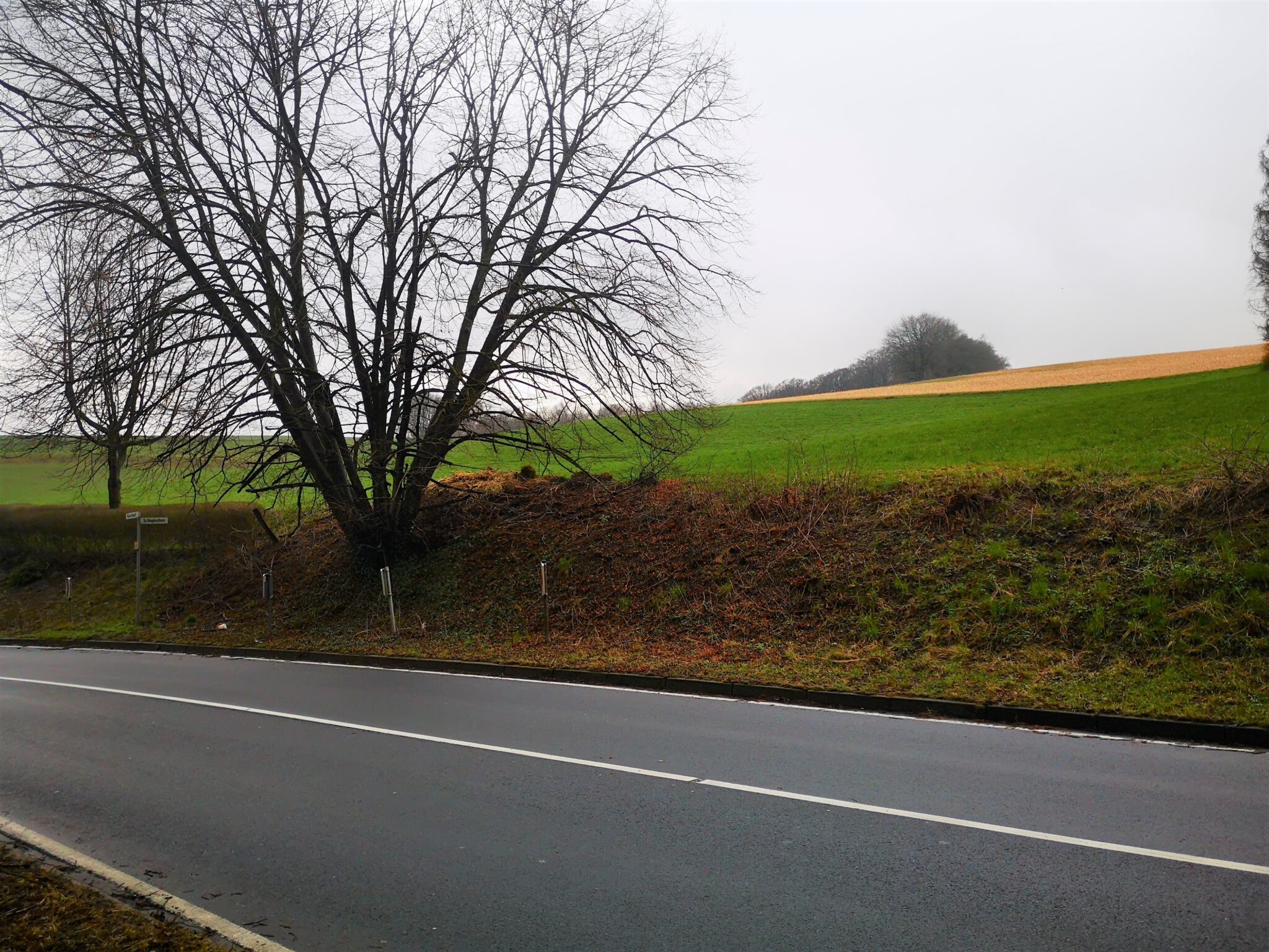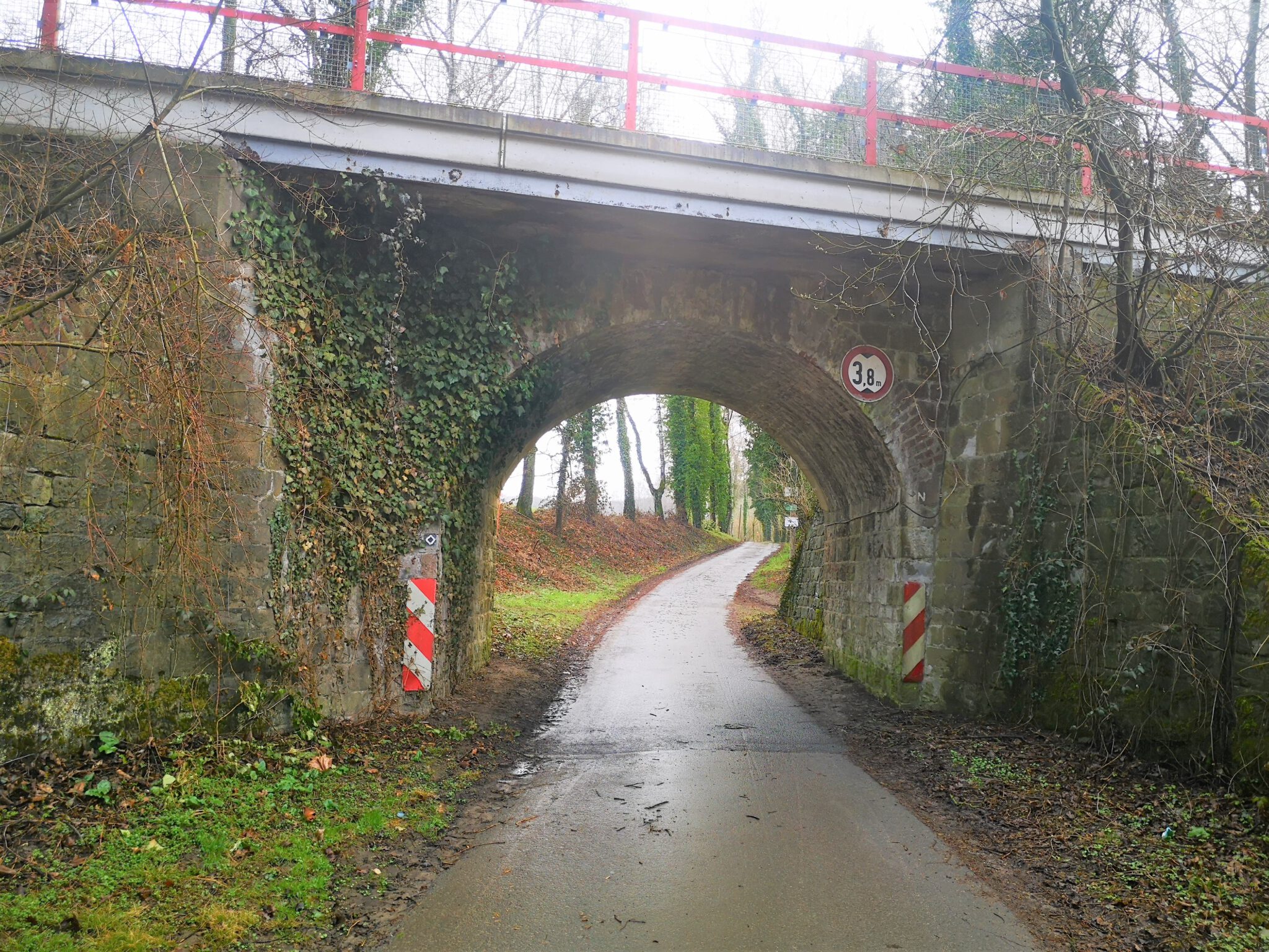 Wir durchqueren einen Tunnel und spazieren den Feldweg entlang und als nach 30 oder 40 Metern der erwartete Radweg nicht auftaucht, drehen wir uns um und finden den „Fehler“: Die Panorama-Trasse verläuft höhergelegt, wir haben sie soeben unterquert, und dorthin zu gelangen, müssen wir einen schmalen, nicht-offiziellen Trampelpfad nehmen.