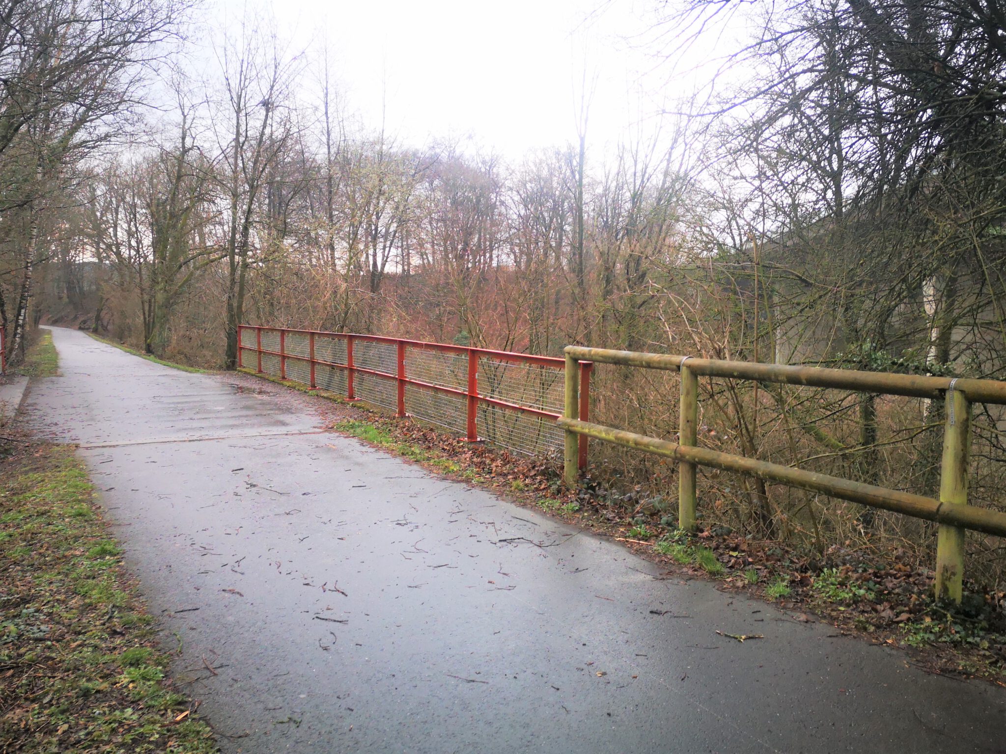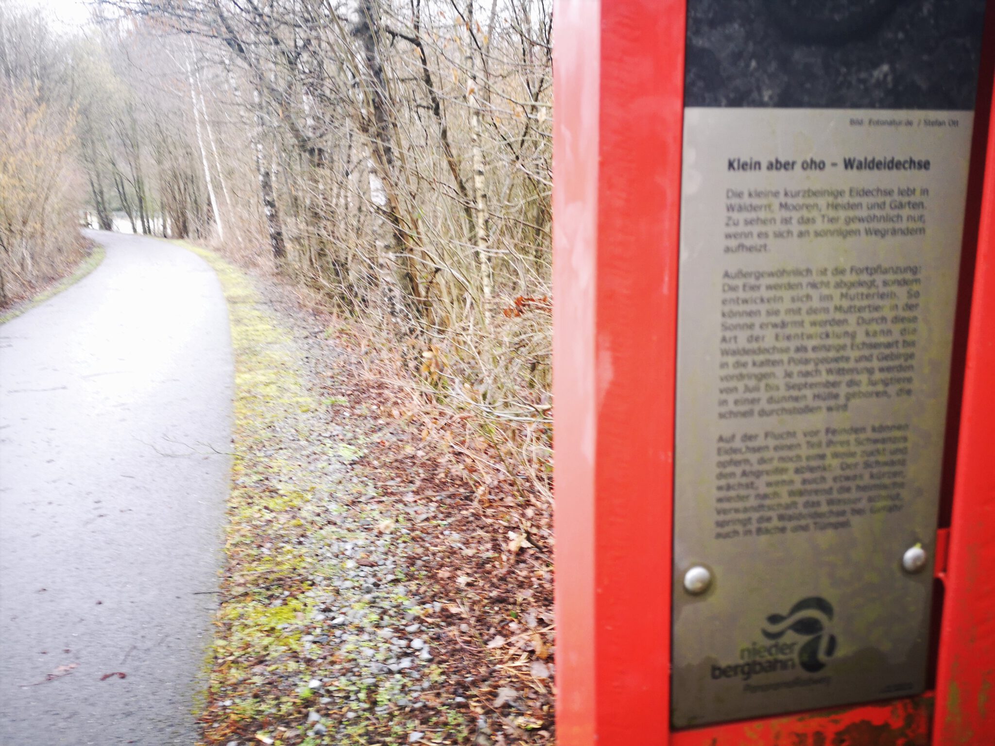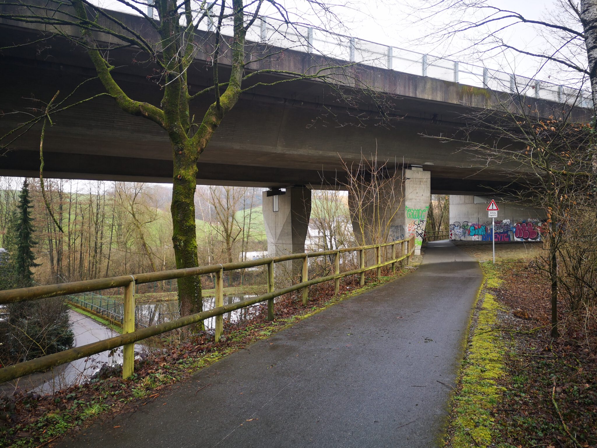 Kurz nach einem Info-Schild, das über die Waldeidechse aufklärt, wechselt die Düssel die Seite, unterquert die Fahrradtrasse.
