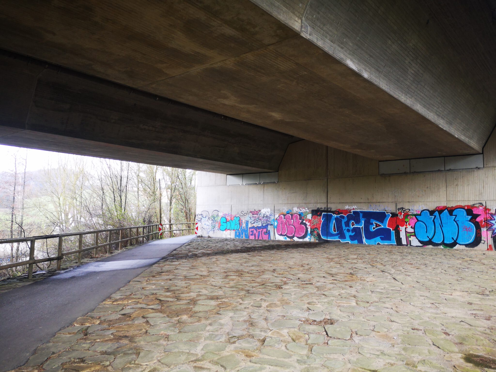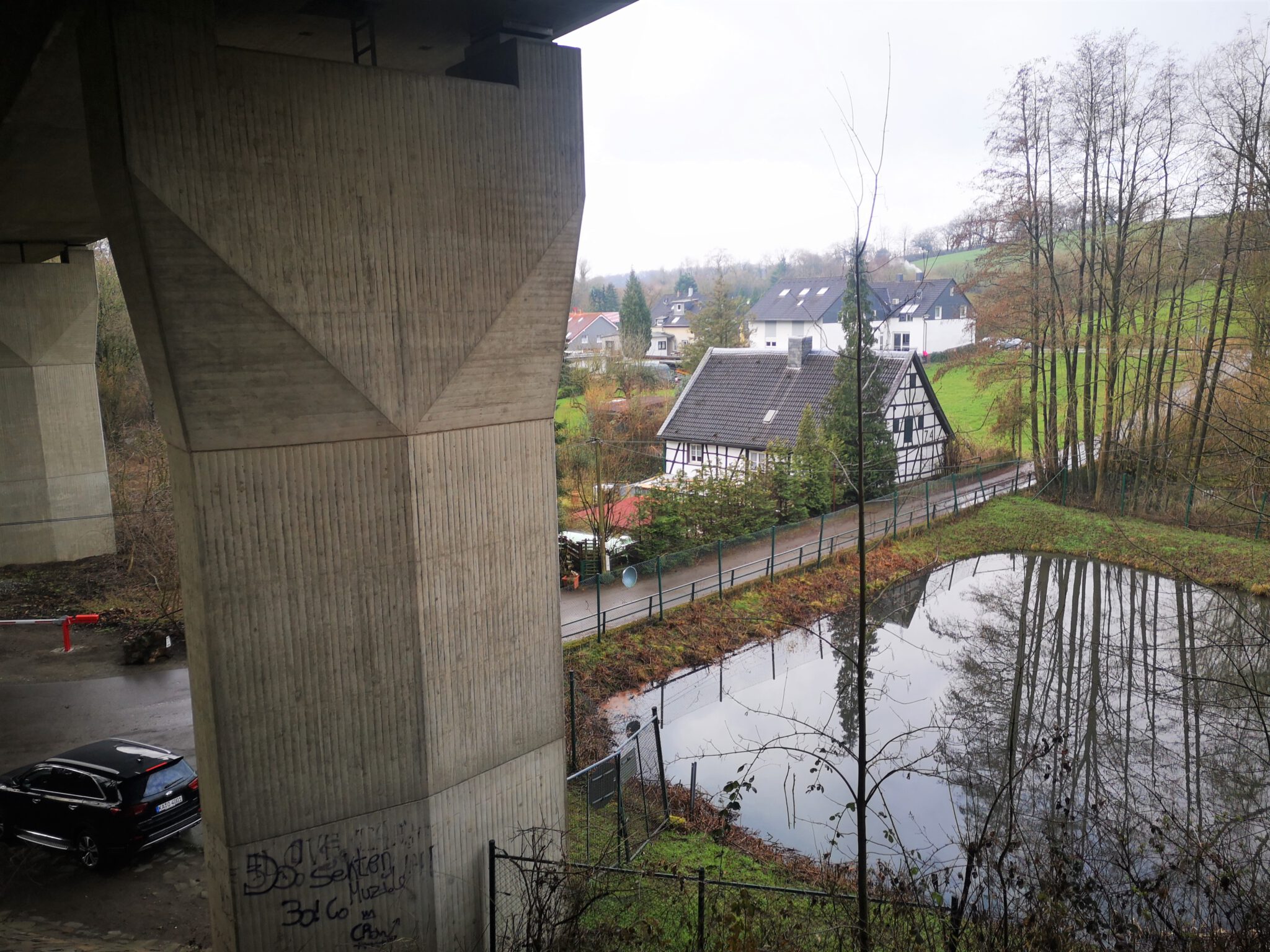 Ein Fachwerkhausblick unter einer Autobahnbrücke: Das gibt’s vermutlich eher selten. Am Autobahnbrückenpfeiler: Street Art. Auf Wikipedia lernen wir: