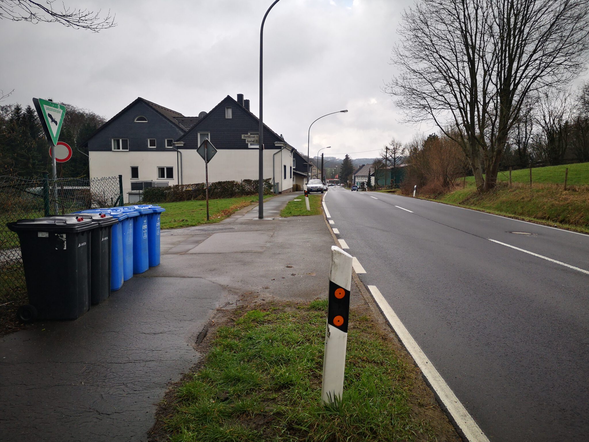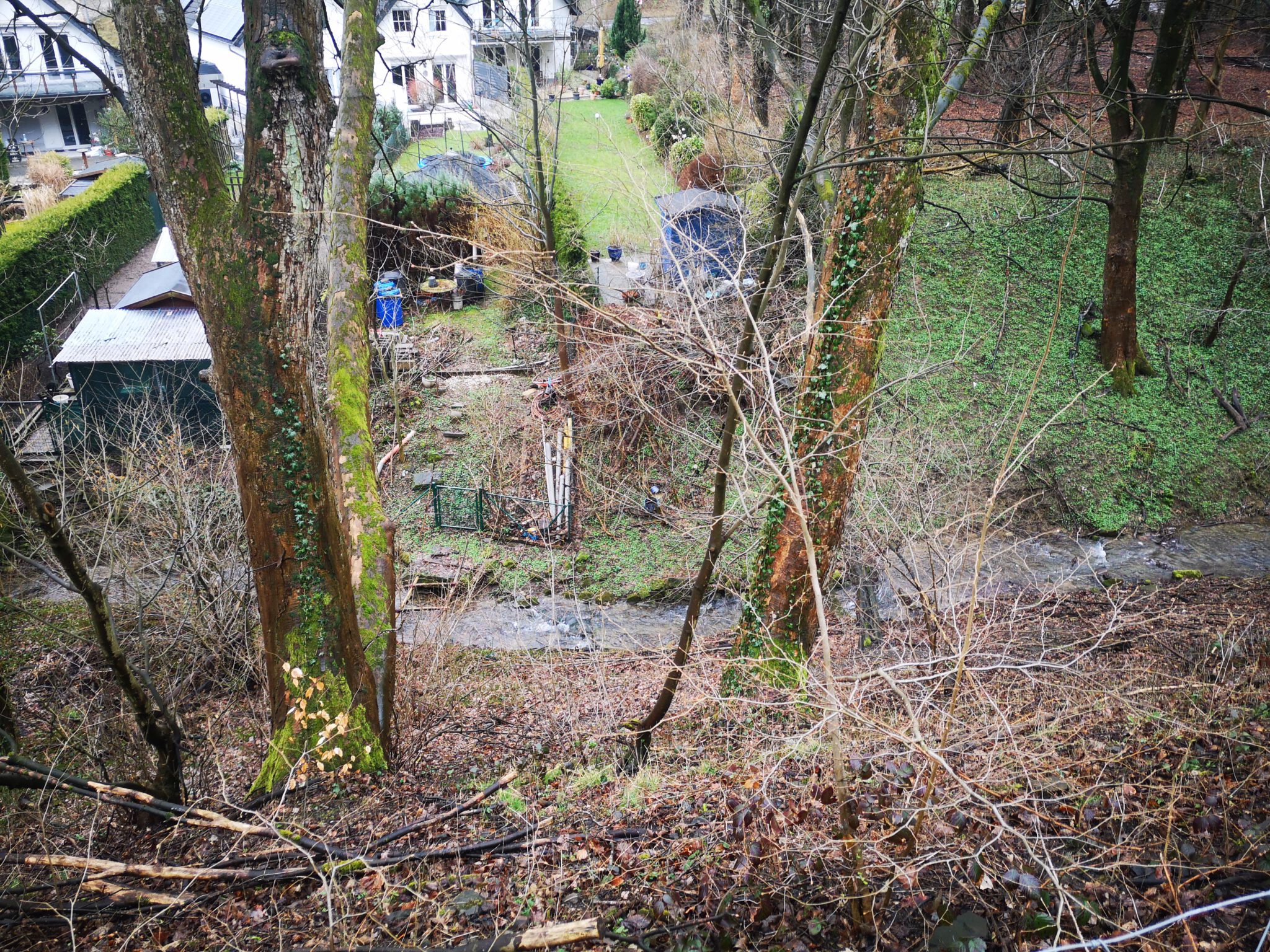 Vorbei an einer Engstelle folgen wir der Radfahrtrasse, die zunächst die Autobahn unterquert und dann parallel zu ihr durch ein Wäldchen verläuft. Nun entdecken wir auch die Düssel wieder. Etwa zwanzig Meter unter uns im Tal schlängelt sie sich an den Gartenenden einer Reihenhaussiedlung vorbei.