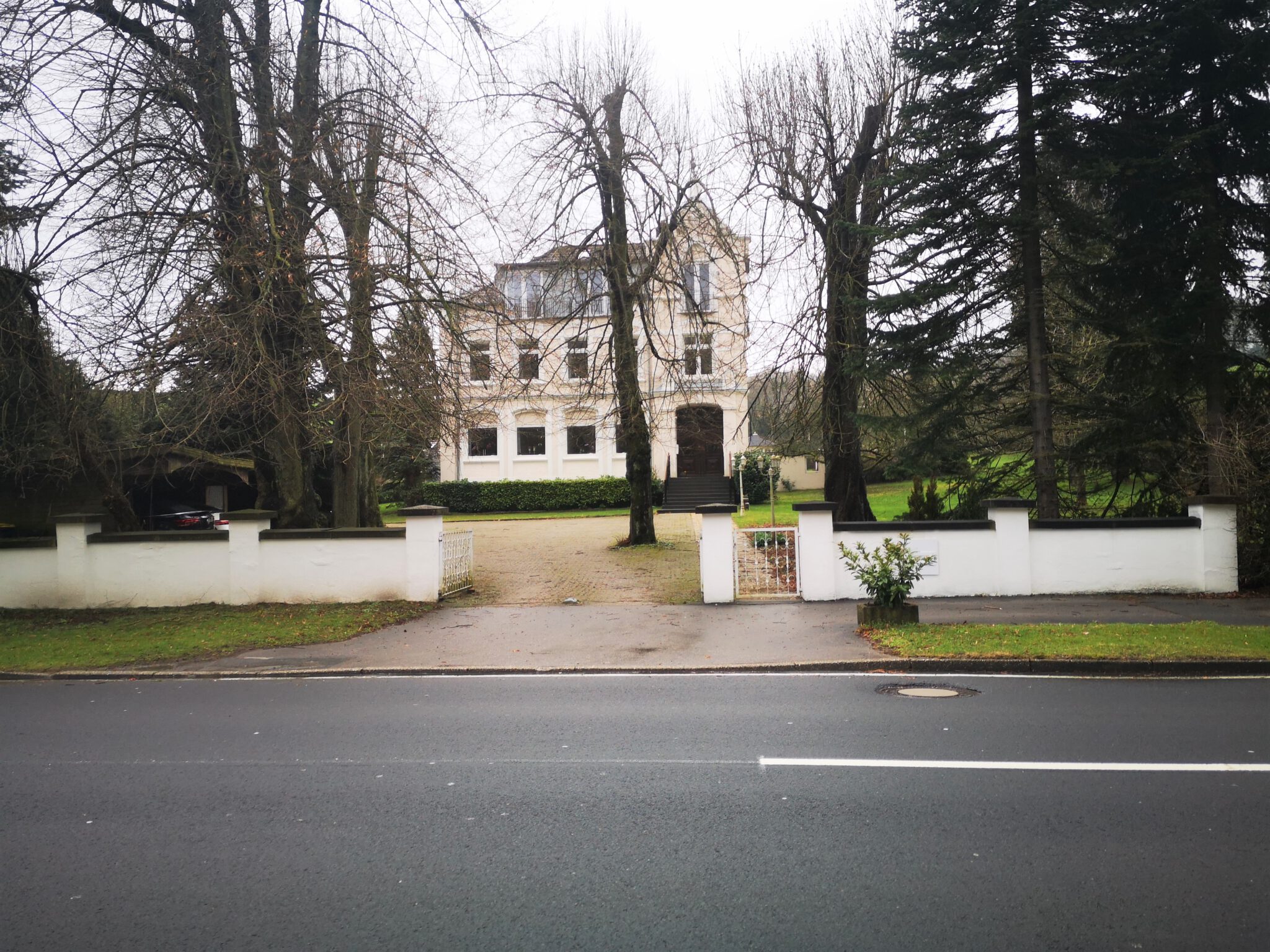 Mein Begleiter macht eine „So ist das eben“-Handbewegung. Und dann schießt er – heute der Beifahrer – auf dem Rückweg noch ein Drive-by-Foto der Wehranlage von Schloss Aprath. Die hatten wir nämlich damals „unterschlagen“, also übersehen, und jetzt ist sie der „Bonus-Track“ der heutigen Folge.